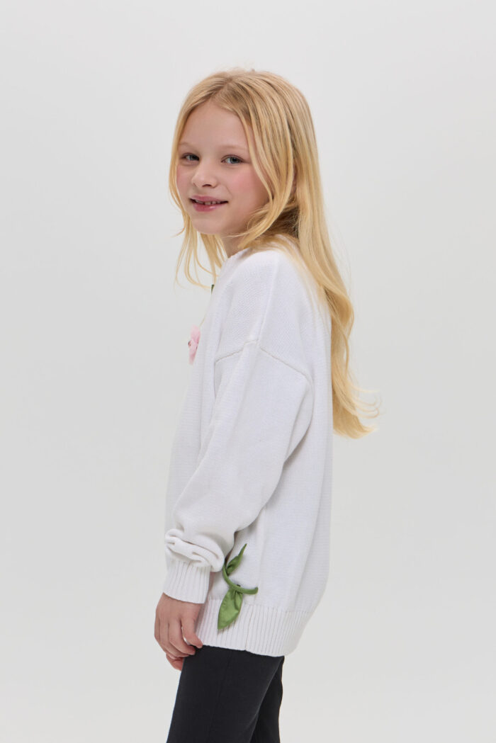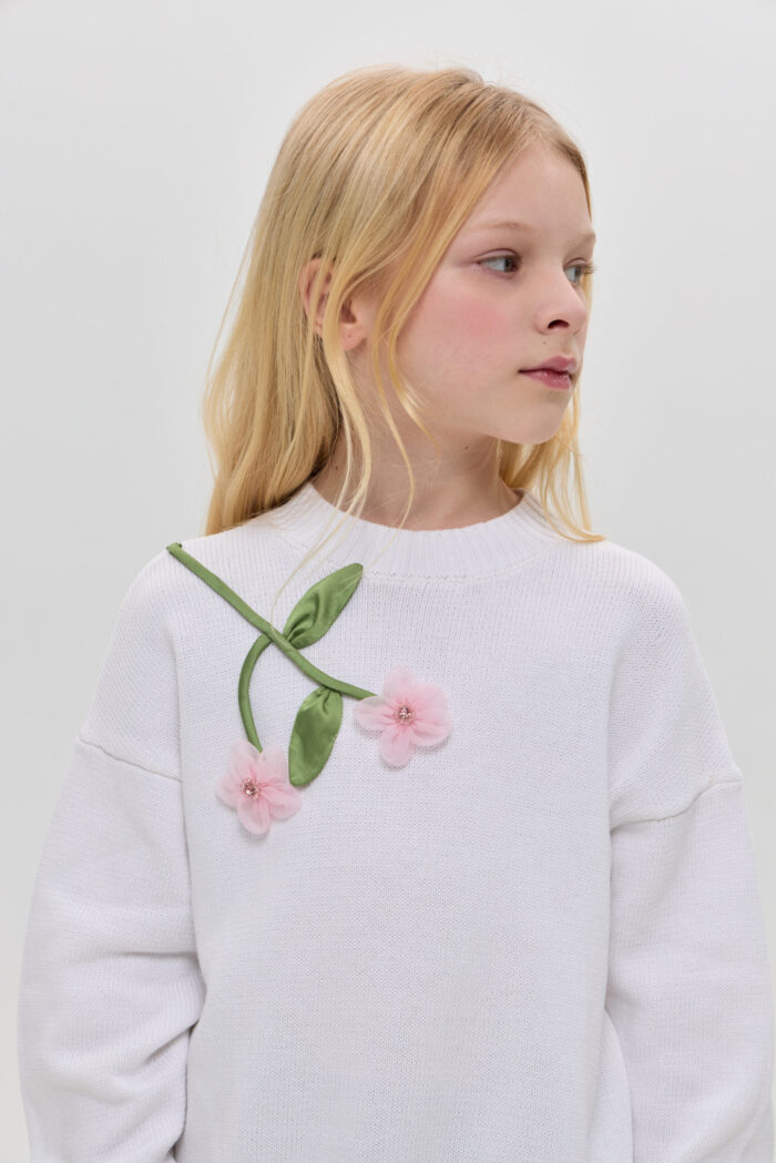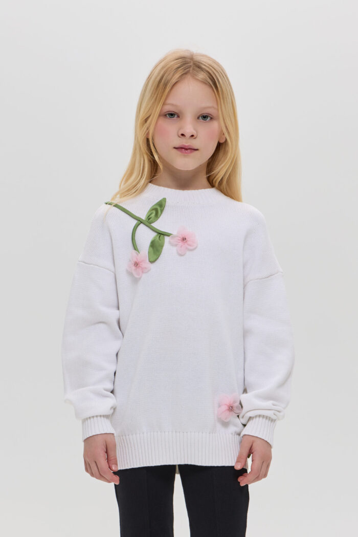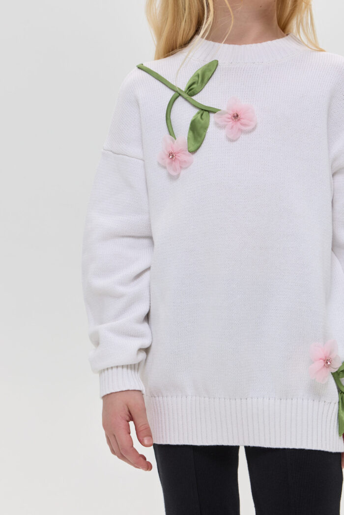 Knitted sweater for a girl is a great option for any season. It will become a universal companion on walks or at family holidays. The jumper can be easily combined with jeans, skirts or leggings, allowing girls to express their style and individuality. Applique of voluminous flowers decorated with rhinestones will help to create a truly spring mood. Comfortable round neck, cuffs on the sleeves and on the bottom of the product guarantee a comfortable fit. Made of natural cotton, the jumper has a pleasant to the touch, soft material.