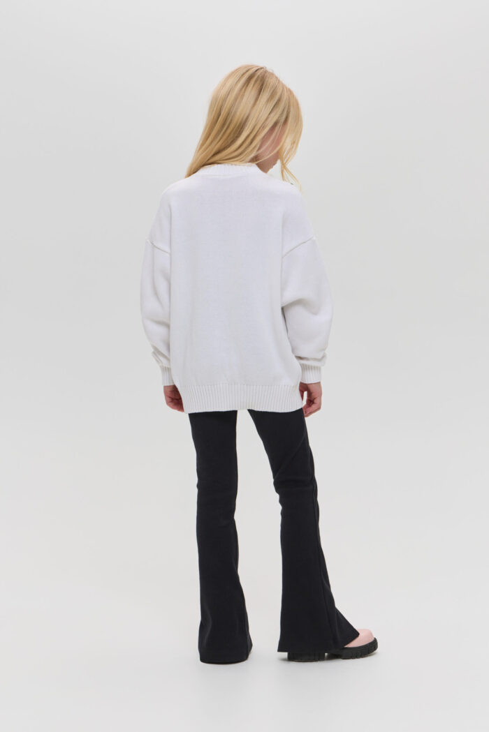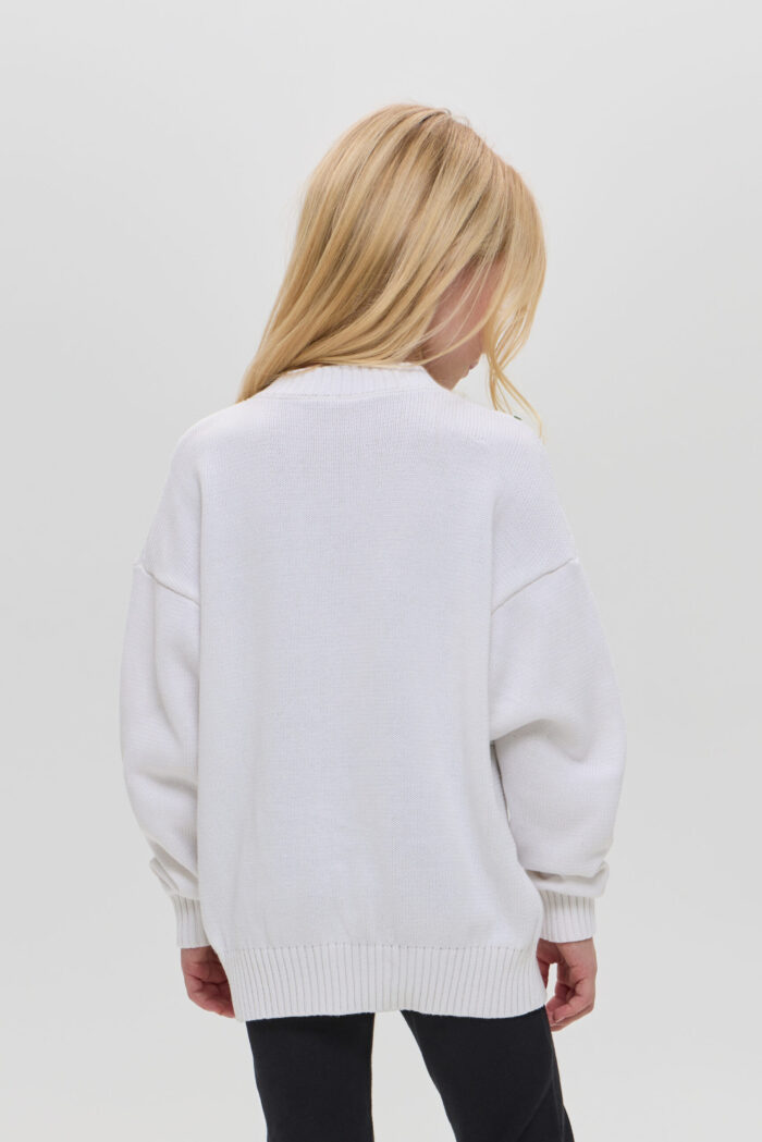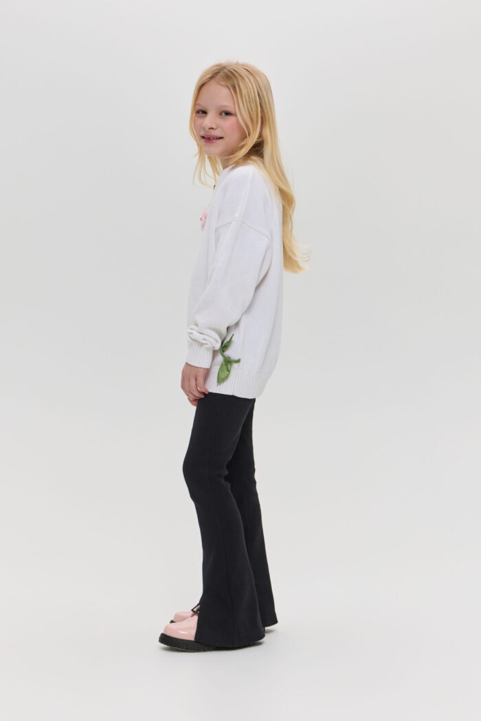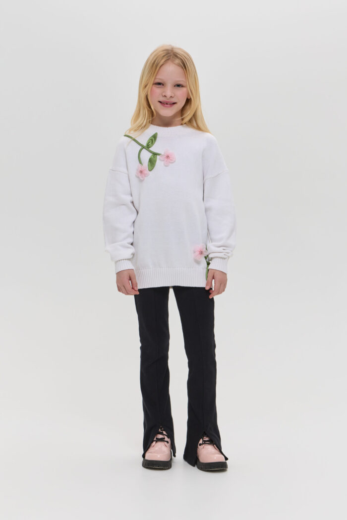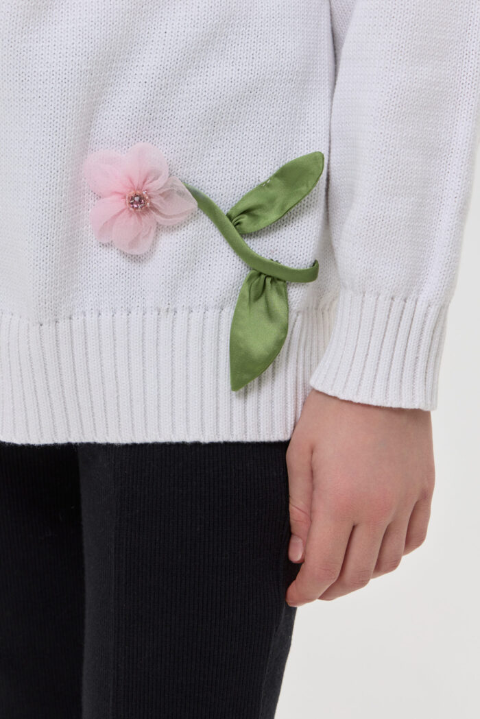 Knitted sweater for a girl is a great option for any season. It will become a universal companion on walks or at family holidays. The jumper can be easily combined with jeans, skirts or leggings, allowing girls to express their style and individuality. Applique of voluminous flowers decorated with rhinestones will help to create a truly spring mood. Comfortable round neck, cuffs on the sleeves and on the bottom of the product guarantee a comfortable fit. Made of natural cotton, the jumper has a pleasant to the touch, soft material.
