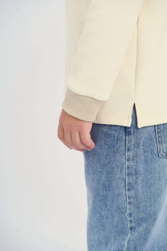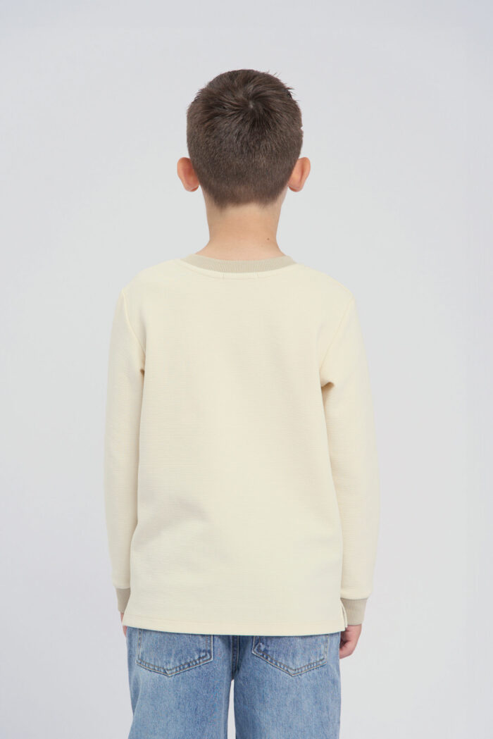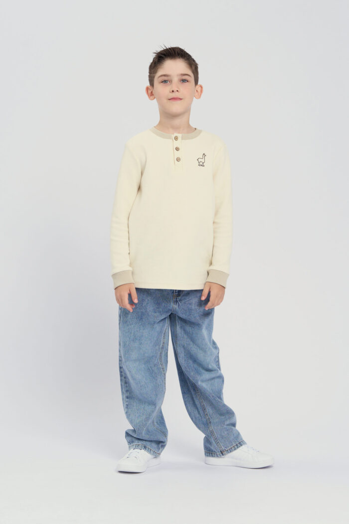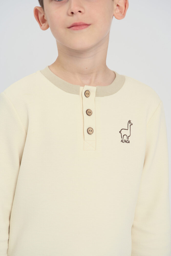 The boy’s long sleeve t-shirt is embroidered with alpaca embroidery. The comfortable loose fit and optimal length make it easy to combine the model with different elements of the wardrobe. The classic round neckline has a three-button fastening. Long sleeves with elasticated cuffs add cosiness and protect from cold weather. The fashionable cream-coloured model is made of soft and pleasant to the touch cotton-based material. Special emphasis is placed on the texture of the fabric.