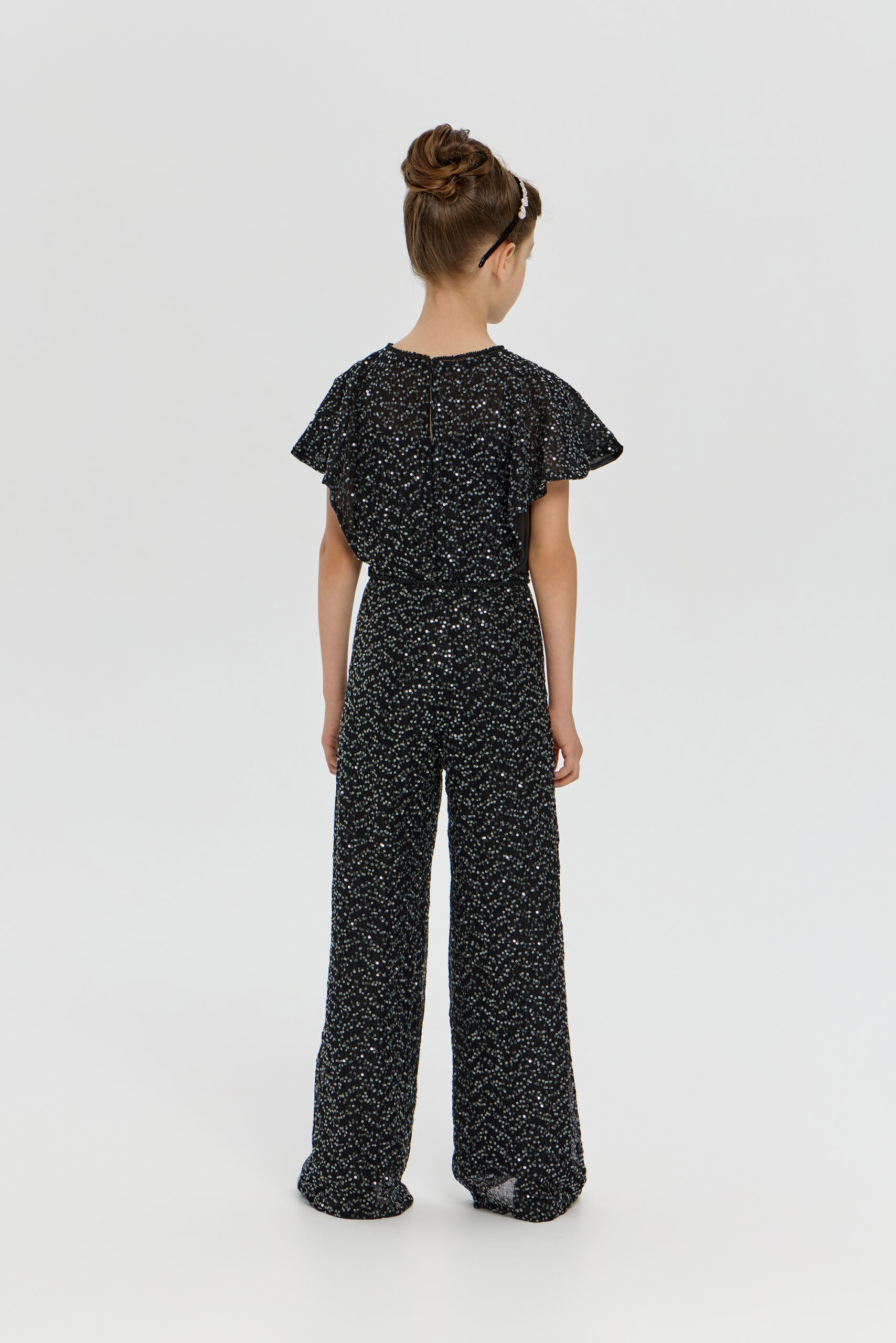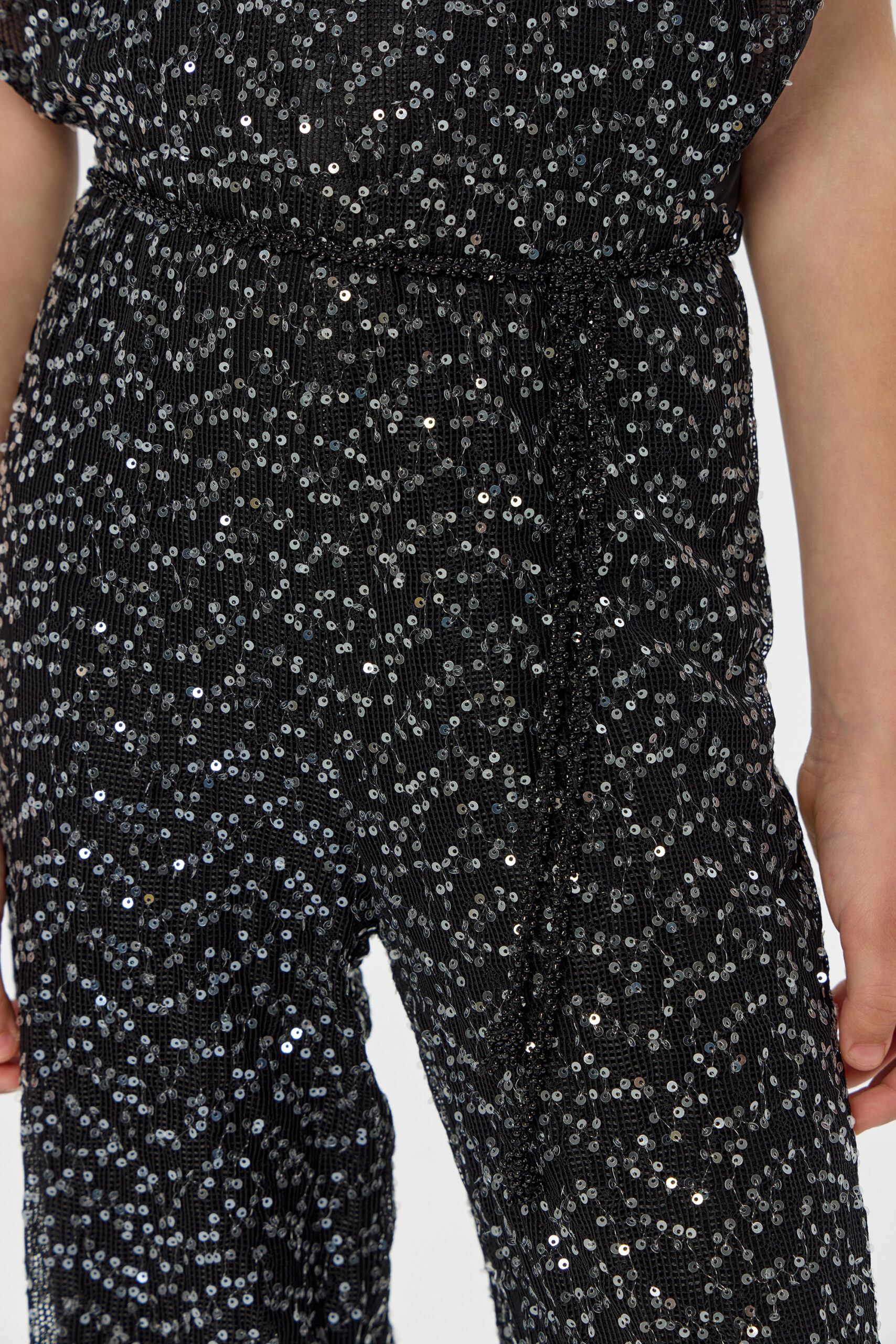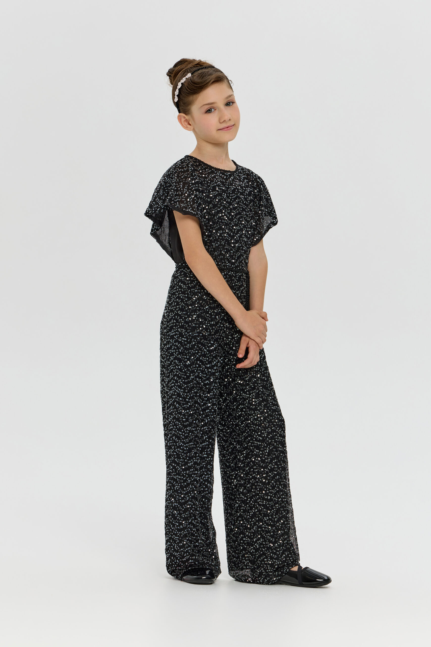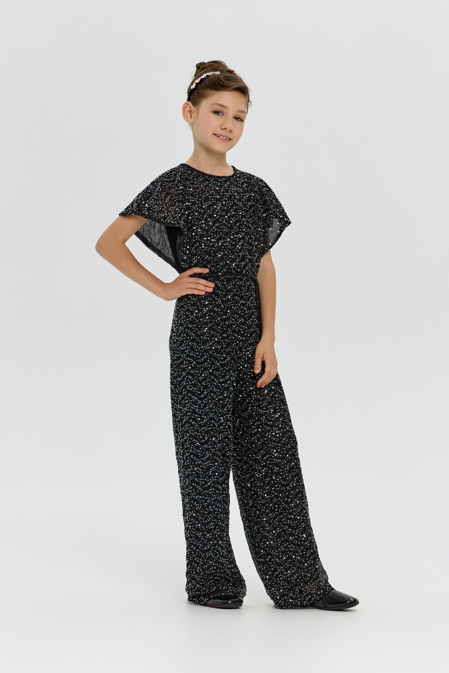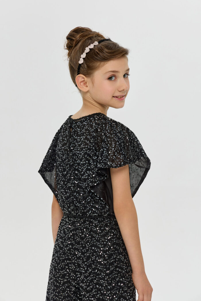 An exquisite black overalls for girls is a wonderful choice for special occasions. A comfortable and fashionable fitted style, complemented by elegant short sleeves. A designer belt decorated with beads accentuates the waist. The overalls are made from fabric embroidered with sparkling sequins.