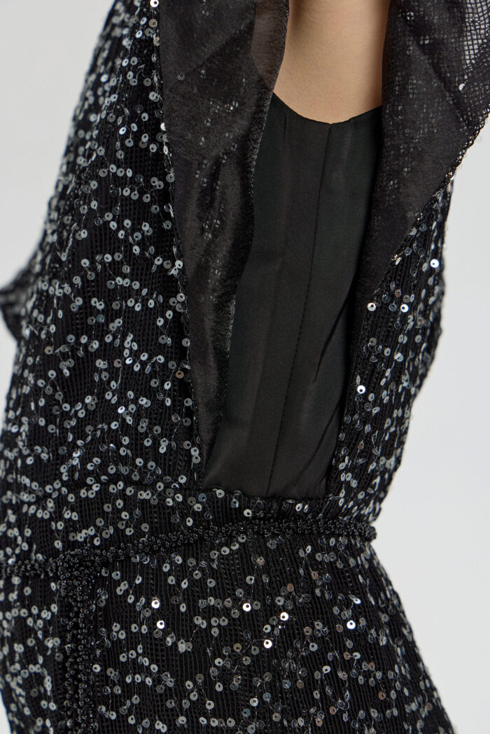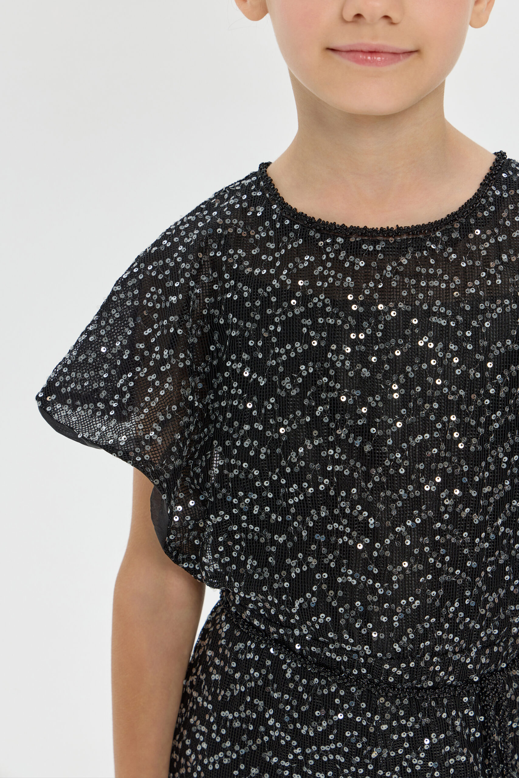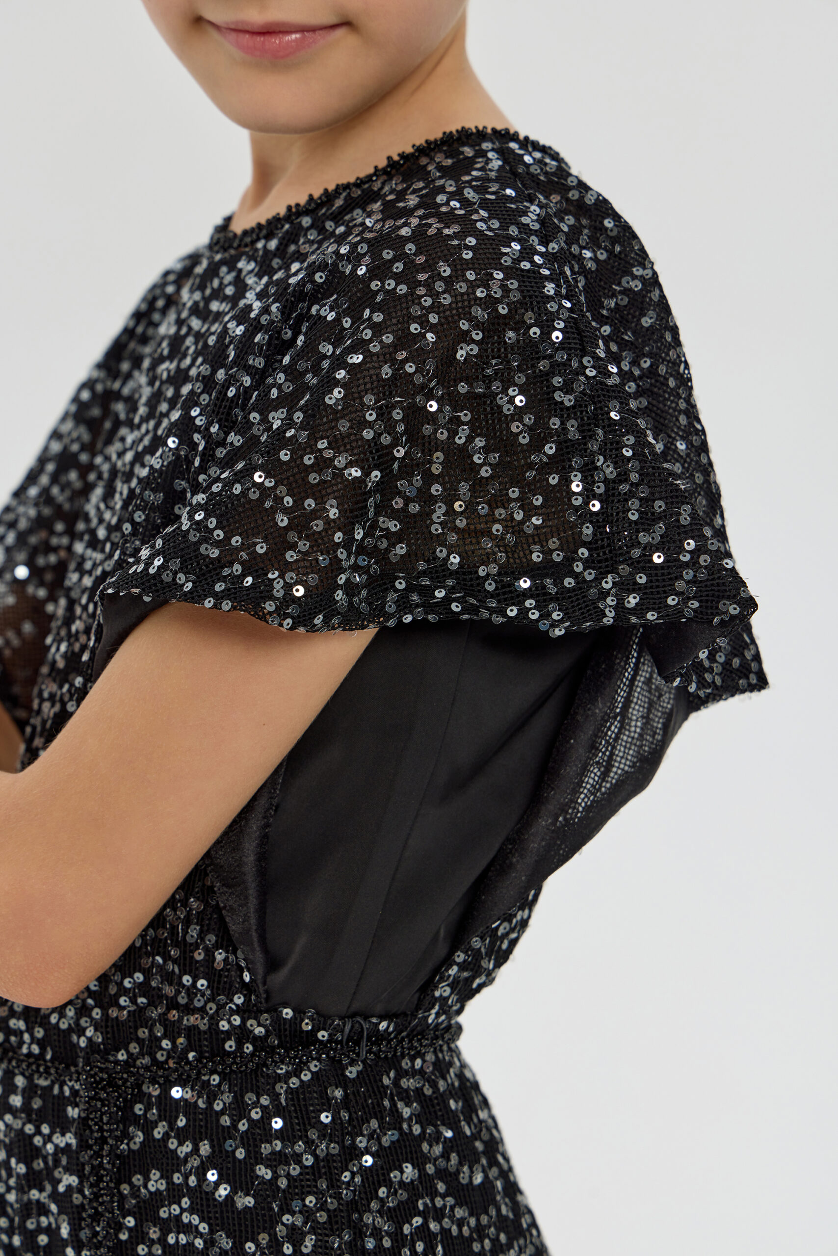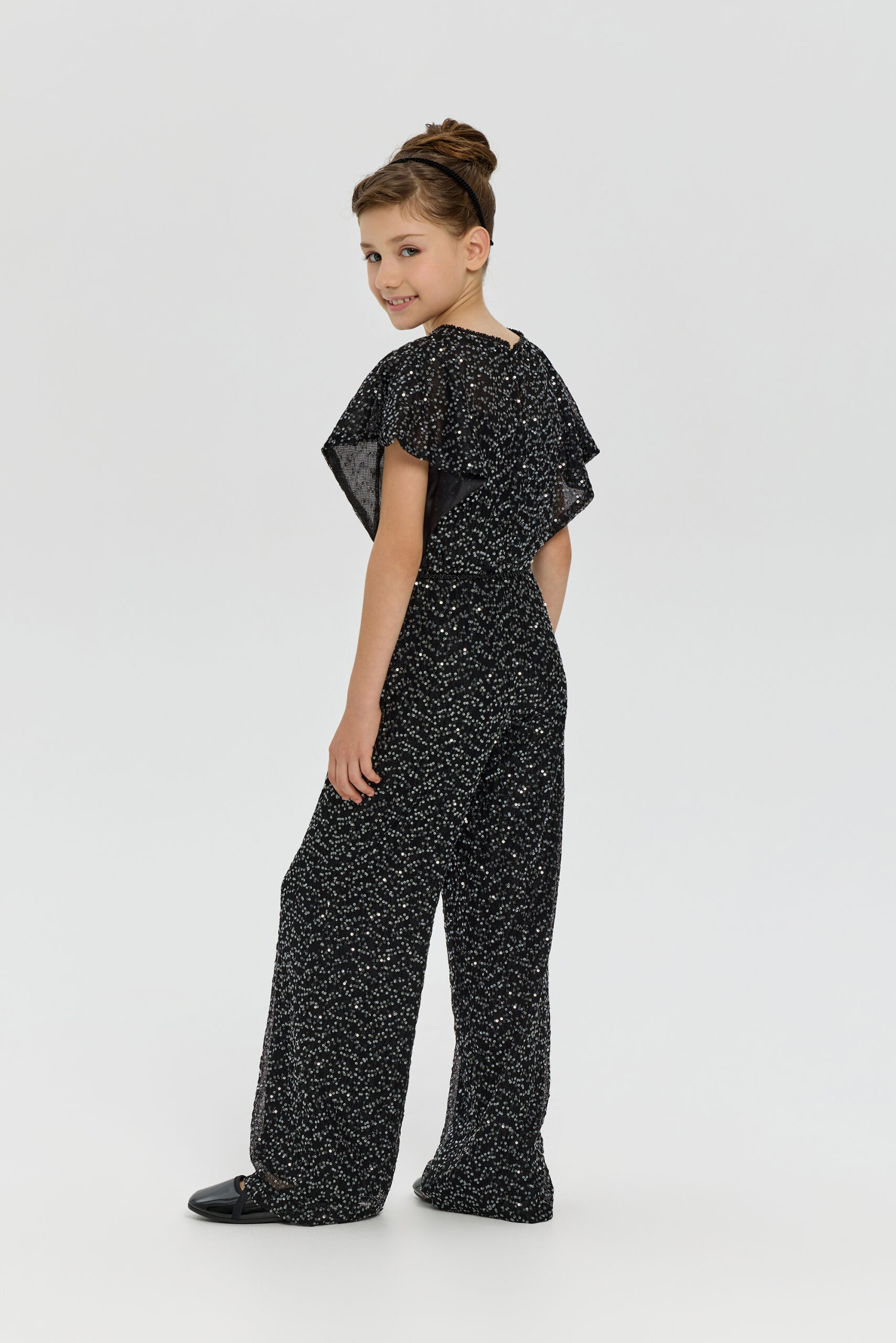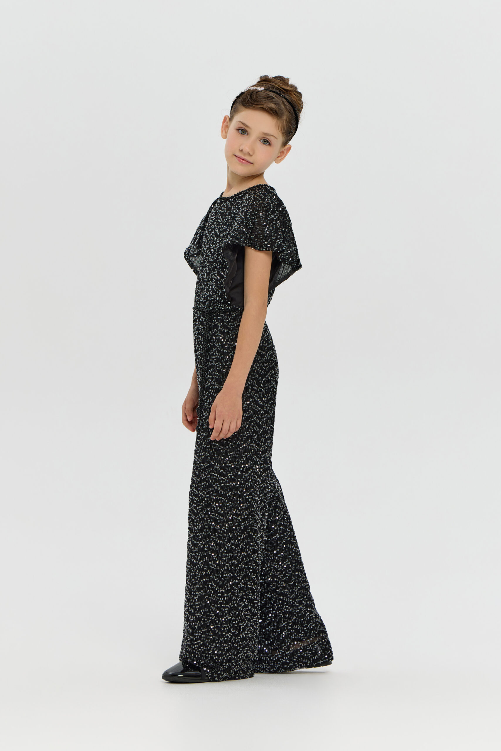 An exquisite black overalls for girls is a wonderful choice for special occasions. A comfortable and fashionable fitted style, complemented by elegant short sleeves. A designer belt decorated with beads accentuates the waist. The overalls are made from fabric embroidered with sparkling sequins.