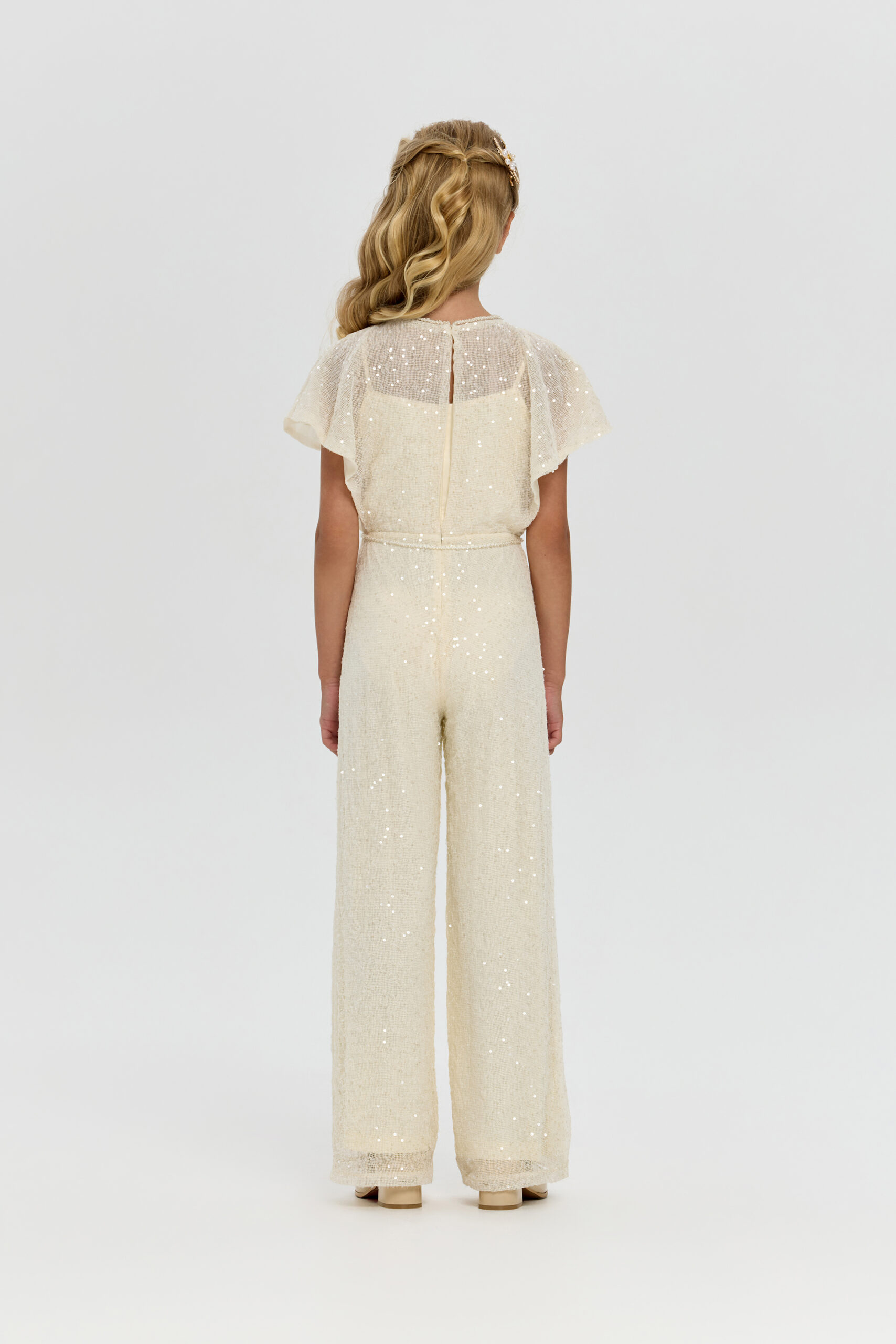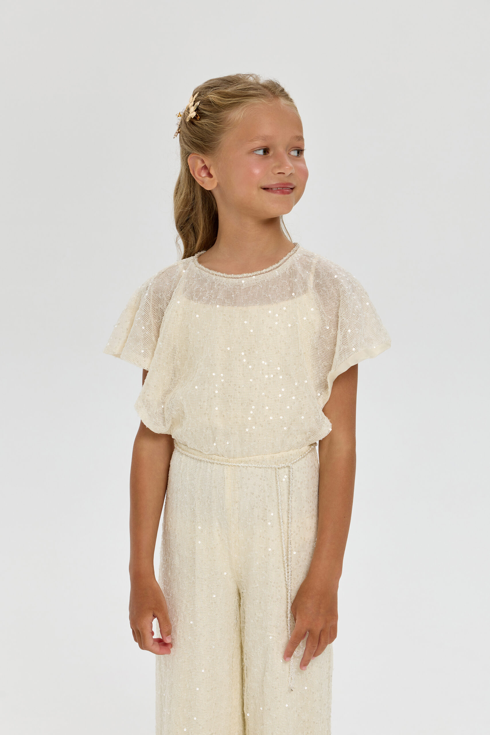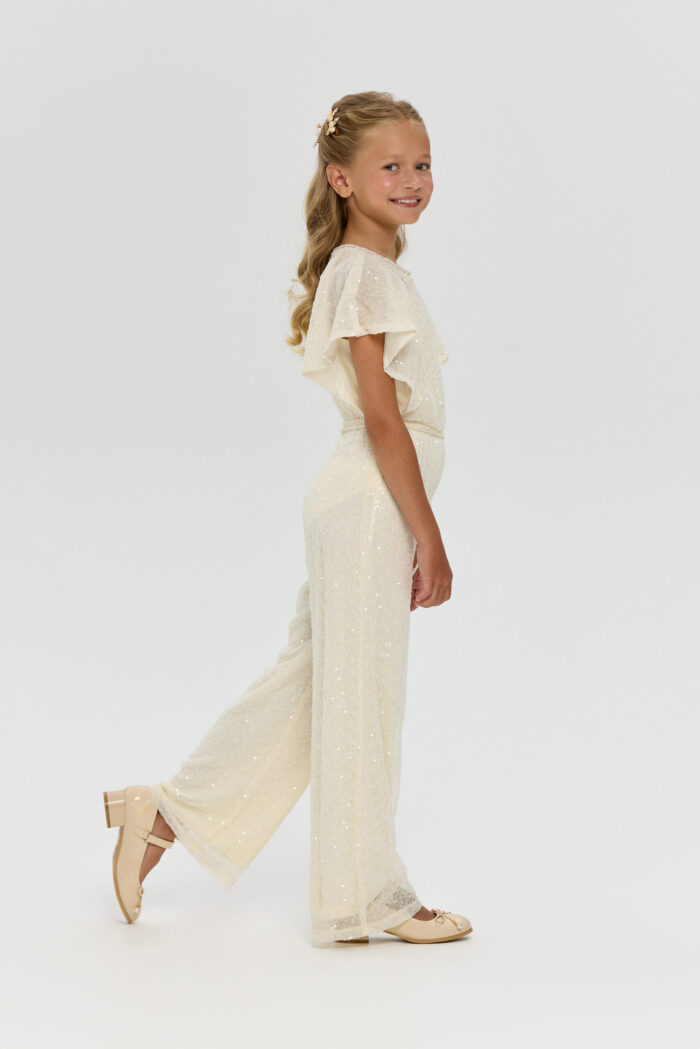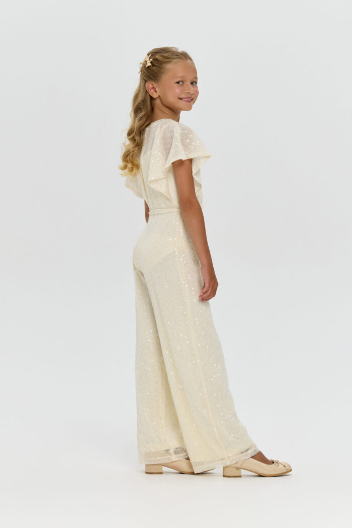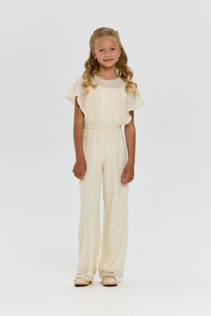 This elegant overalls for girls is made of fabric decorated with shiny sequins and has a delicate cotton base. The model has a semi-fitted fit with short sleeves. The waistline is adorned with an elegant belt. Straight-leg pants are a comfortable length. Concealed zip fastening at the back. This overalls is a great choice for special occasions.