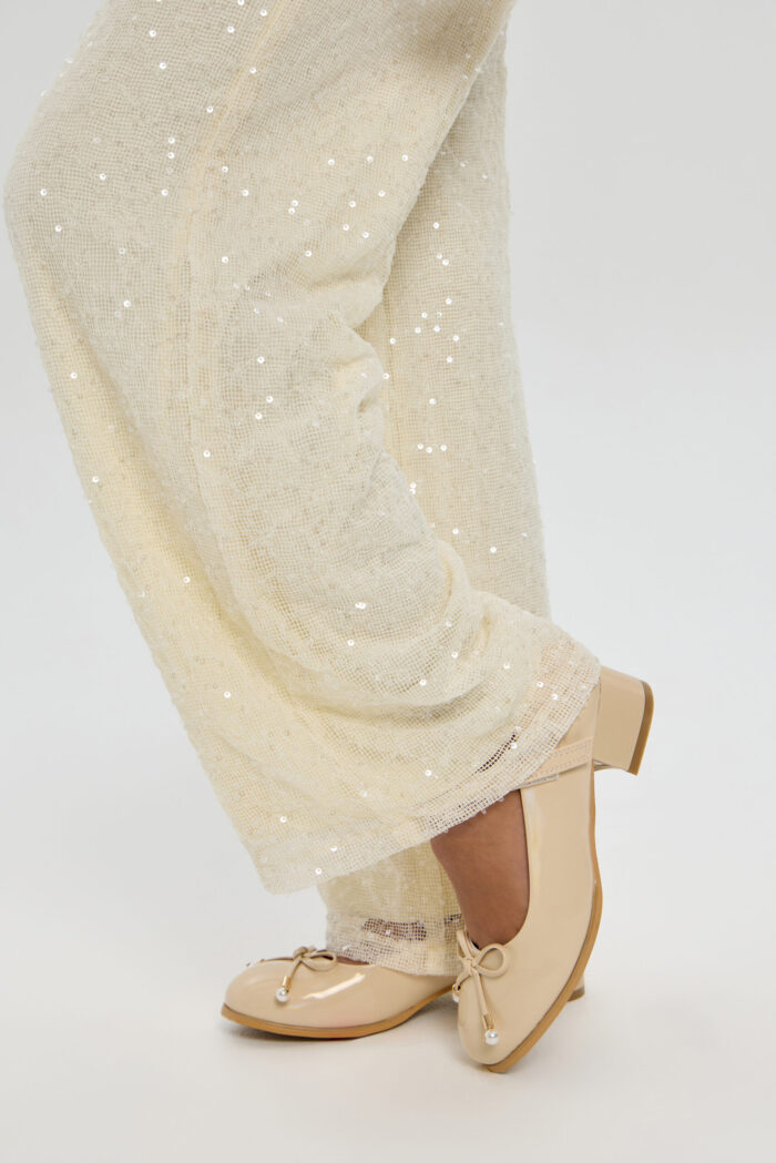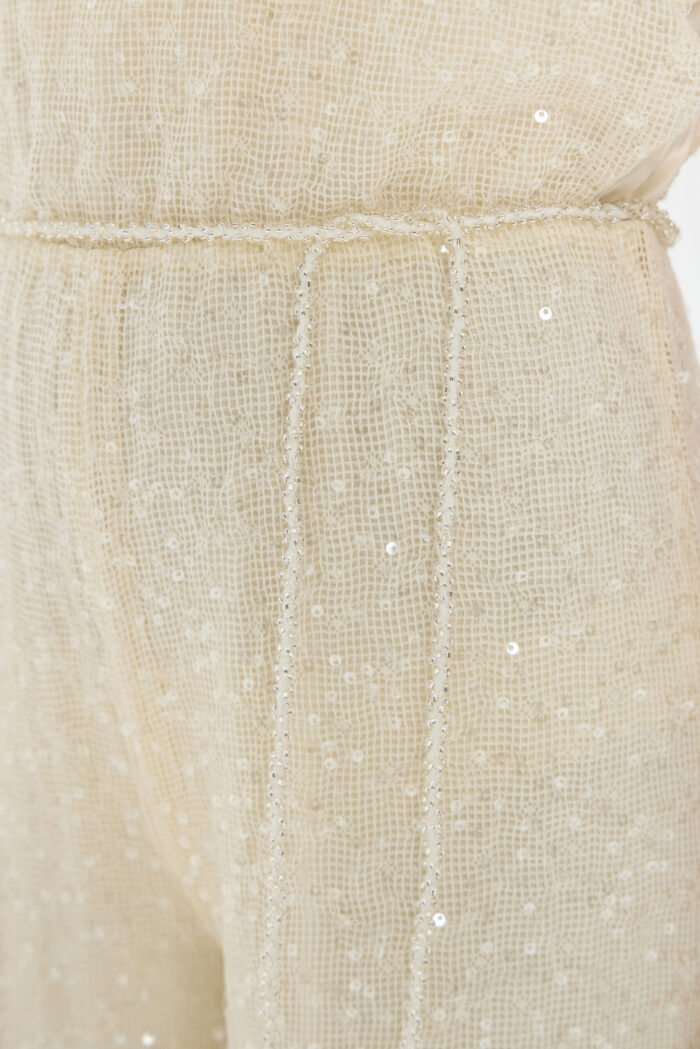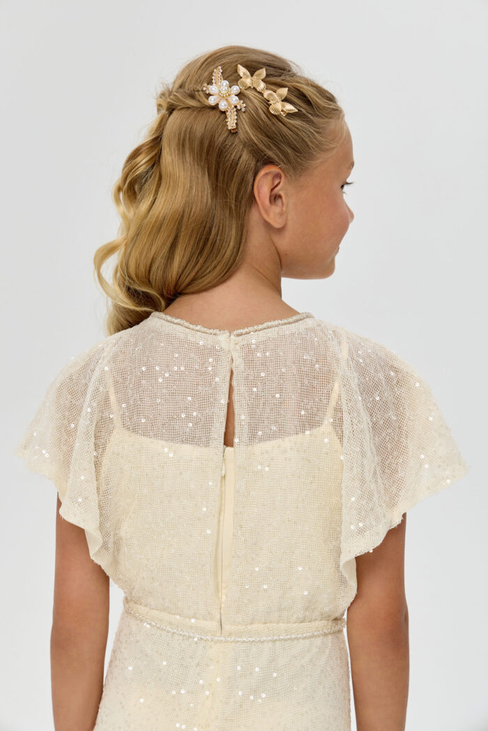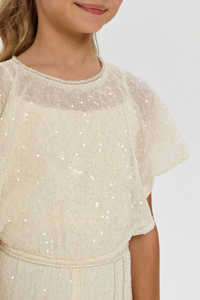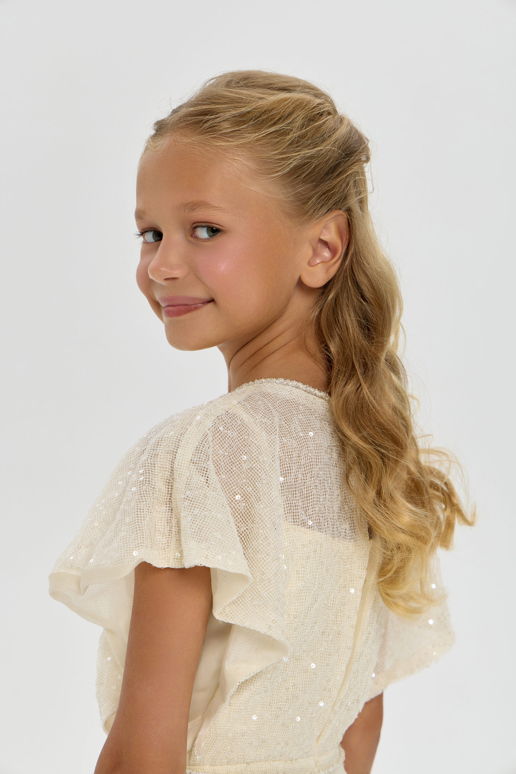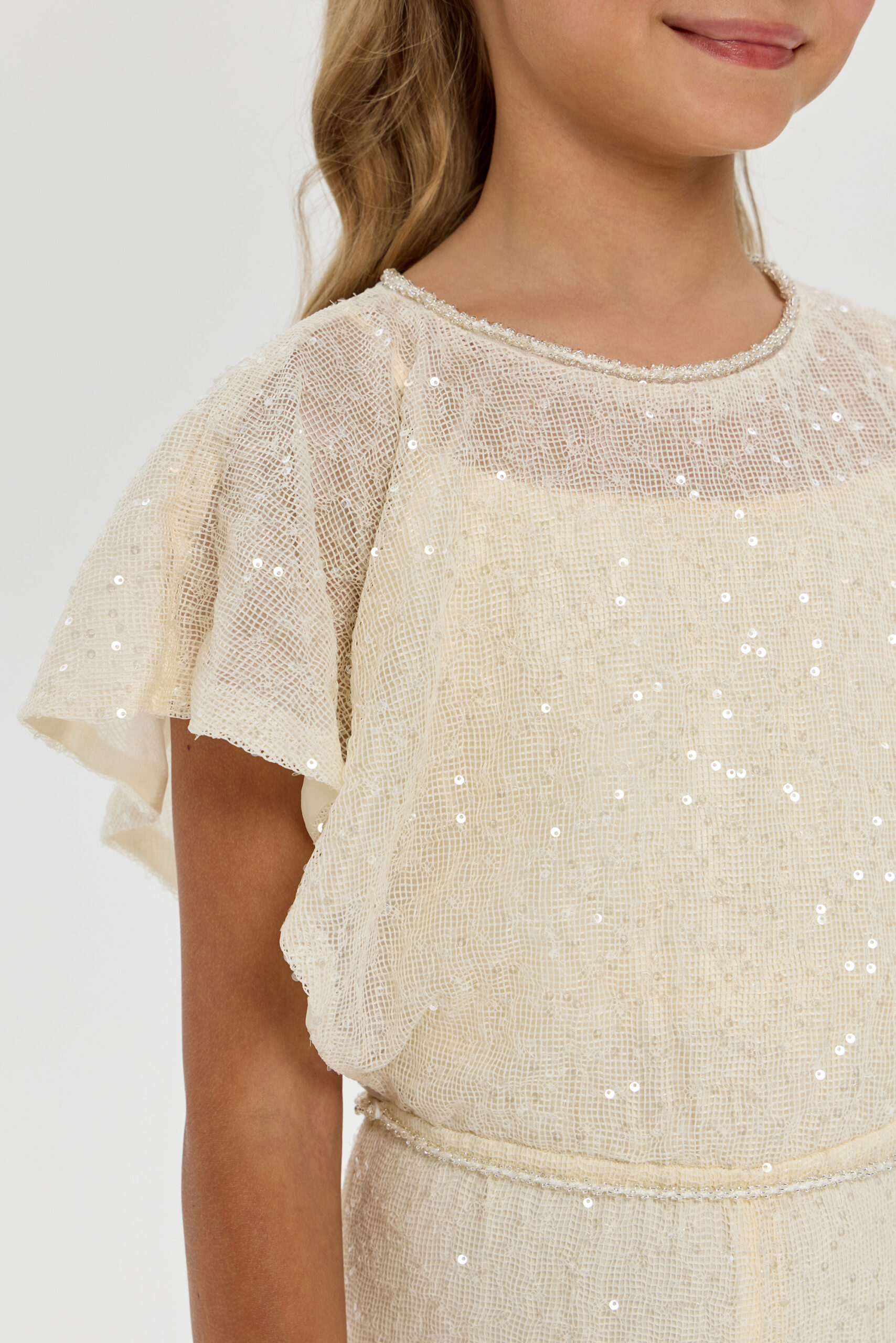 This elegant overalls for girls is made of fabric decorated with shiny sequins and has a delicate cotton base. The model has a semi-fitted fit with short sleeves. The waistline is adorned with an elegant belt. Straight-leg pants are a comfortable length. Concealed zip fastening at the back. This overalls is a great choice for special occasions.