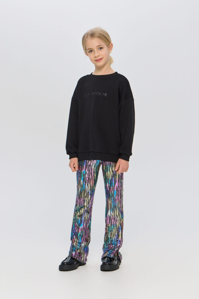The sequinned pants is a real fashion hit! Sparkling sequins add glitter to the light, making it the perfect choice for holidays, parties or special occasions. The flared silhouette creates a light and dynamic look, allowing your child to move freely and feel comfortable. Combining these pants with simple tops or blouses, you can create a harmonious look, where the emphasis will be on the glittery pants.