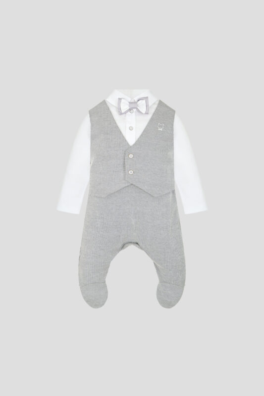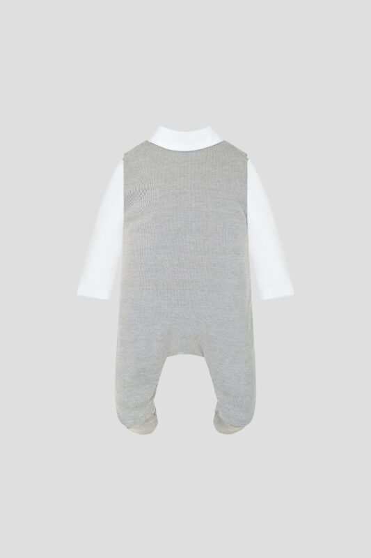 El jersey polo azul forma un elegante conjunto con el primer pantalón de vestir del niño. La silueta recta con bajo perfilado. Las mangas cortas y el cuello blanco con solapa tienen rayas rojas y blancas en contraste a lo largo del dobladillo.