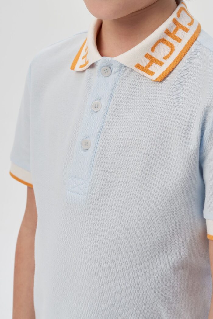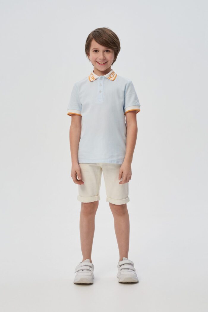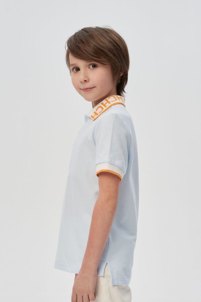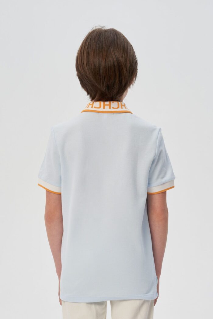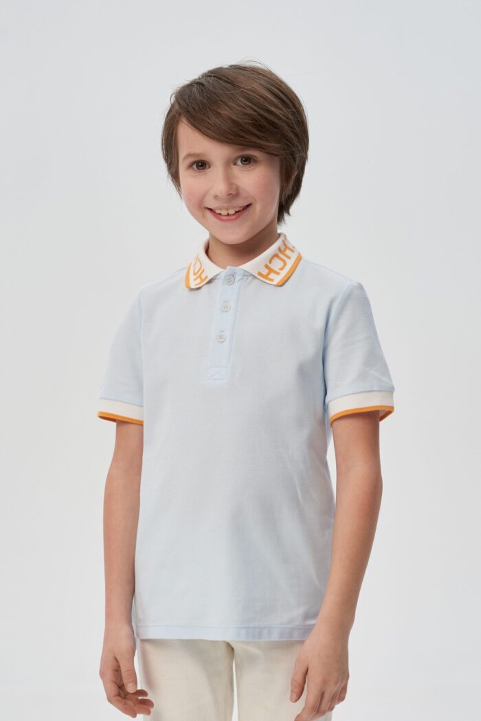 La tendencia para un vestuario festivo es smart casual. Este jersey azul cielo con cuello de polo para niño te ayudará a crear un look elegante y desenfadado para una fiesta infantil. Silueta ligeramente entallada, con mangas cortas y cierre central de tres botones. Cuello blanco con letras naranjas y raya en el borde. El chevron gris y naranja en el pecho crea otro acento llamativo.