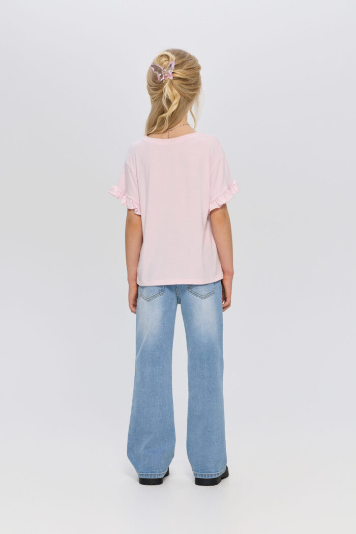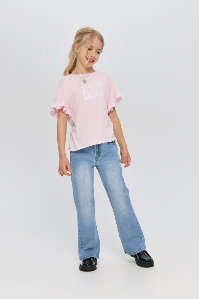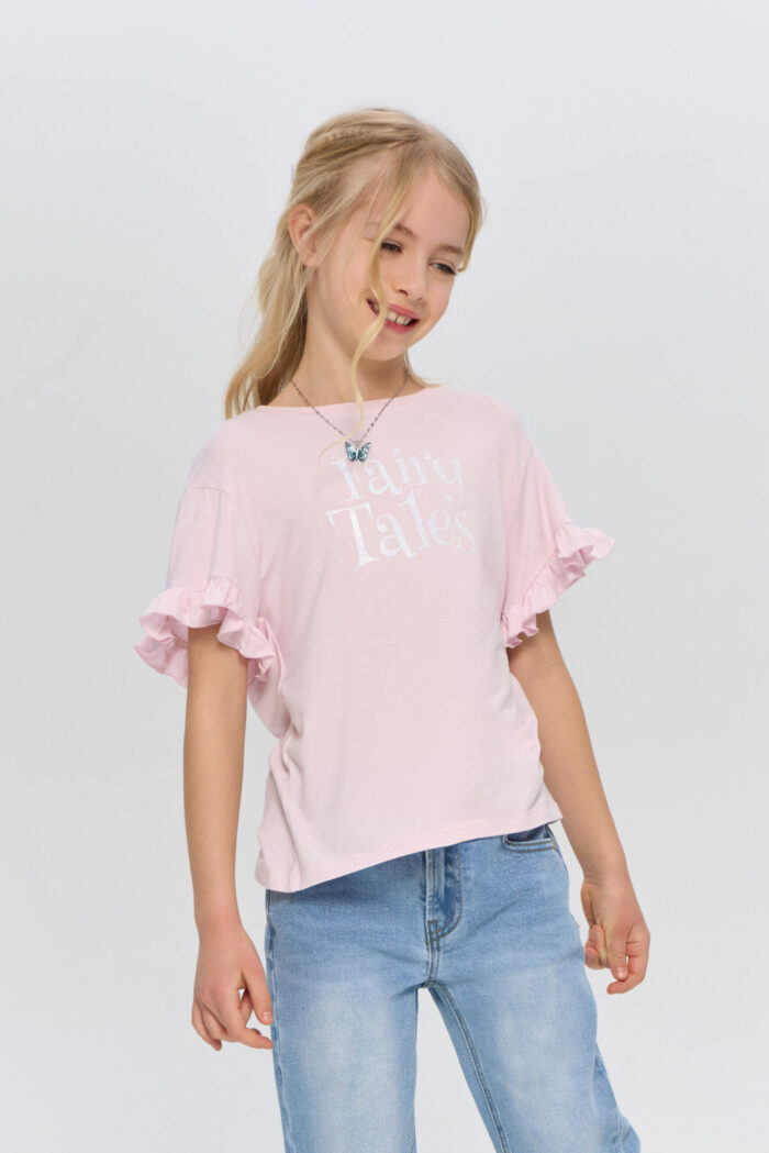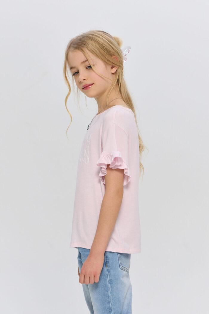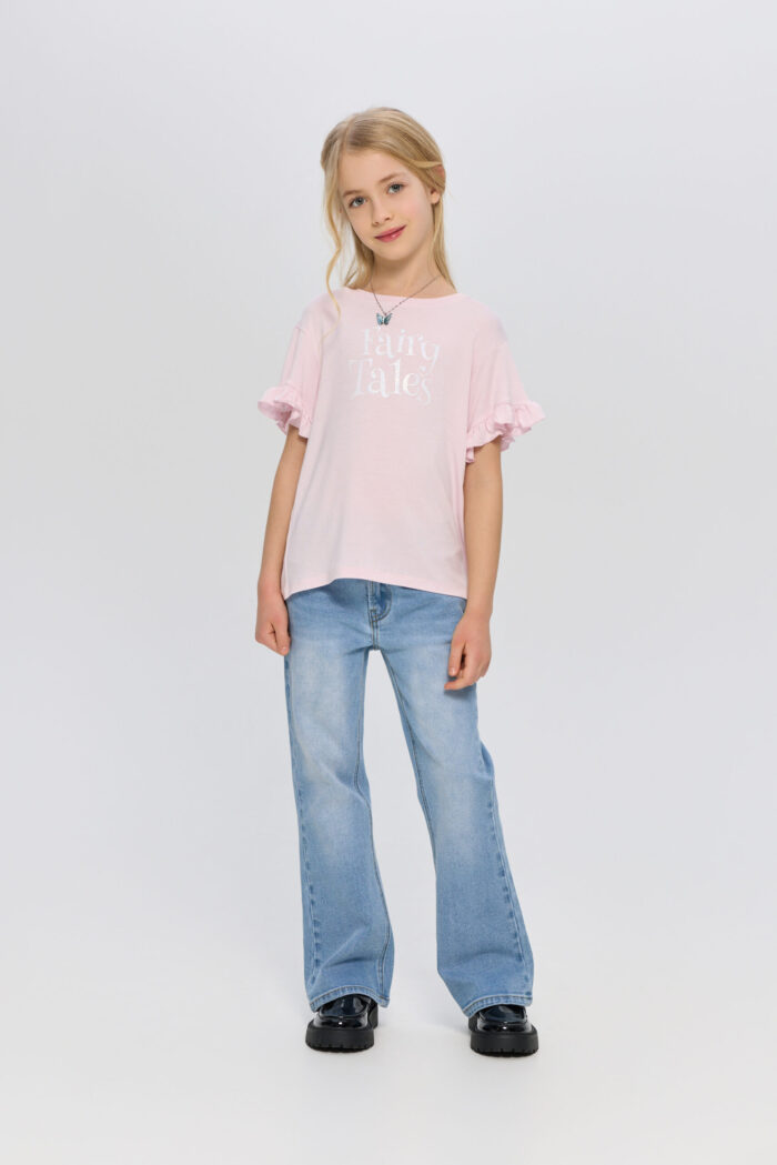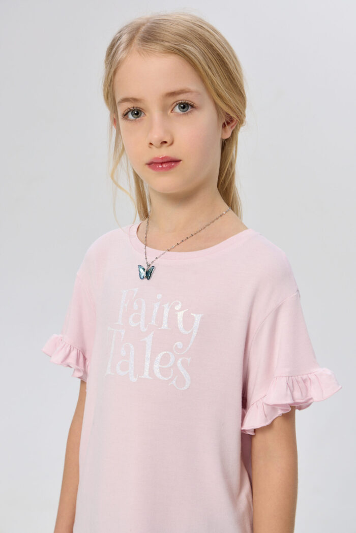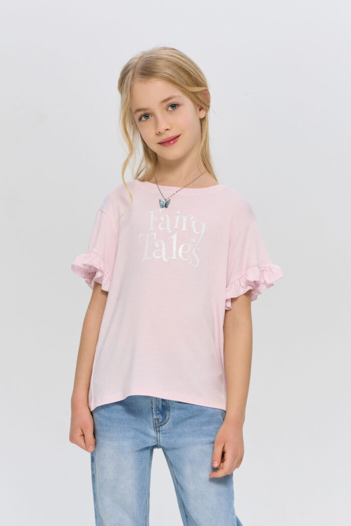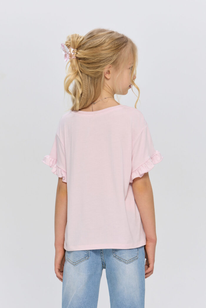 T-shirt for a girl in delicate pink colour will become a vivid item in her wardrobe. The model is decorated with an attractive print. Short sleeves with a ruched edge give the product an accent. The T-shirt comes with a stylish necklace, which perfectly complements the look. This T-shirt can be combined with jeans, skirts or shorts.
