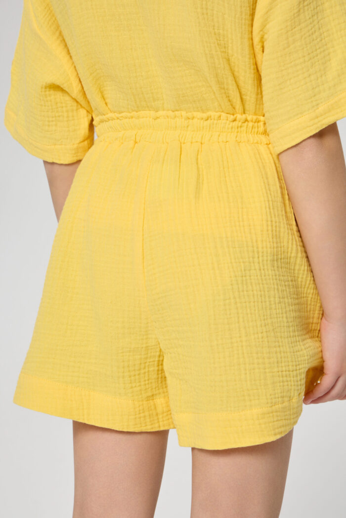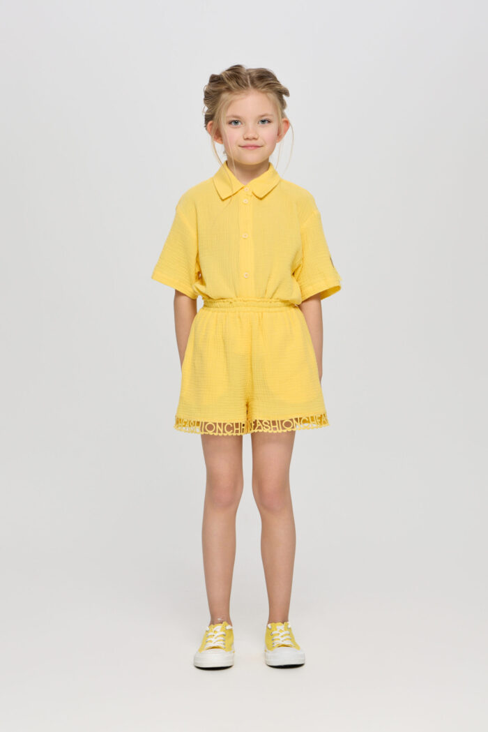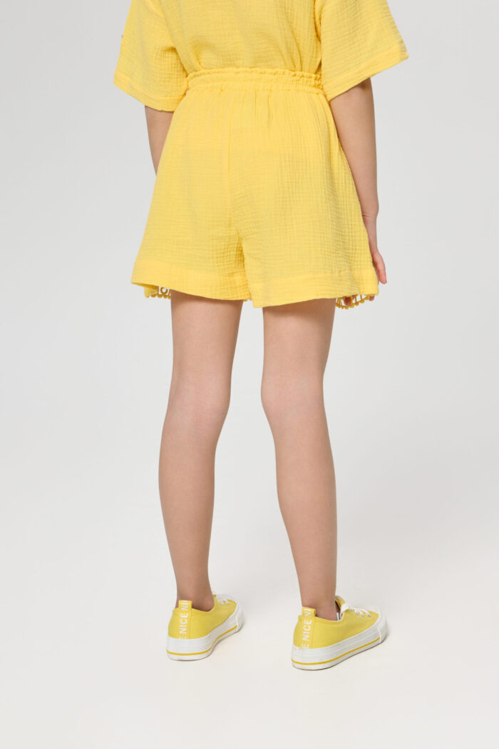 Shorts for girls are an essential part of the summer wardrobe. The model is made of soft and pleasant to the touch cotton fibre. The natural material is ideal for delicate children’s skin, preventing irritation and providing excellent breathability. The elasticated waistband guarantees a secure and comfortable fit. A branded lace braid with festoons adds a special zest to the shorts. This model is ideal for creating a variety of summer looks, from casual to dressy.
