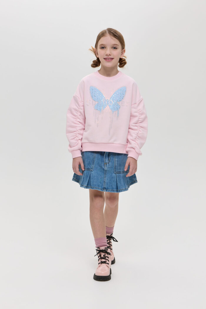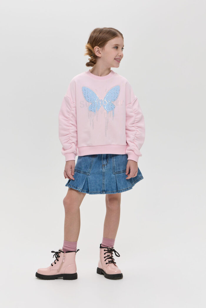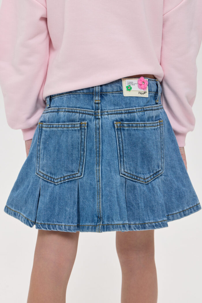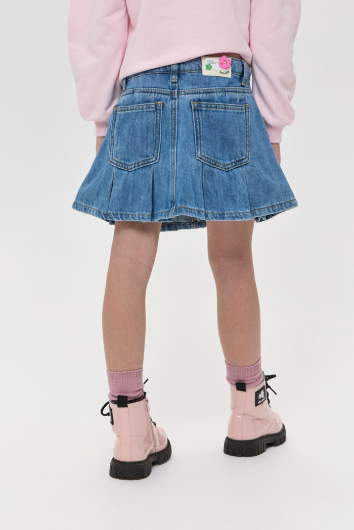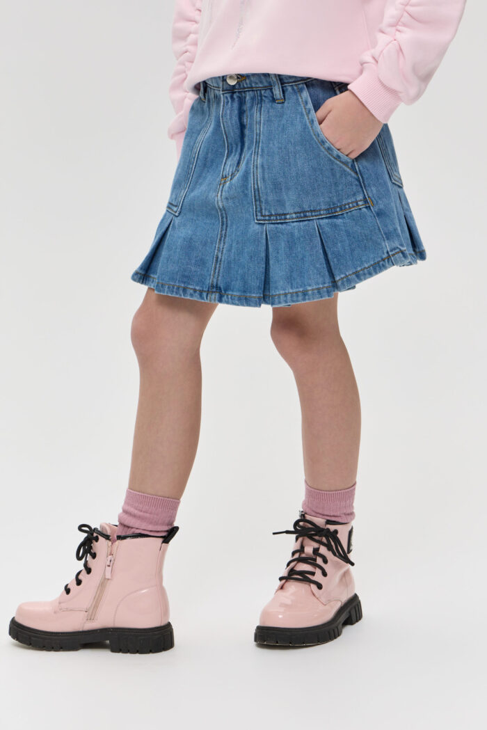 The denim skirt for girls is a stylish and practical wardrobe item. The loose fit of the model in combination with pleats gives the look a touching charm. The skirt is equipped with pockets, which are not only functional elements, but also a stylish accent. Adjustable waistband, as well as additional belt loops allow for a perfect fit. The model is made of quality denim material, which is characterised by strength and durability. The denim holds its shape well and only becomes more comfortable with time.