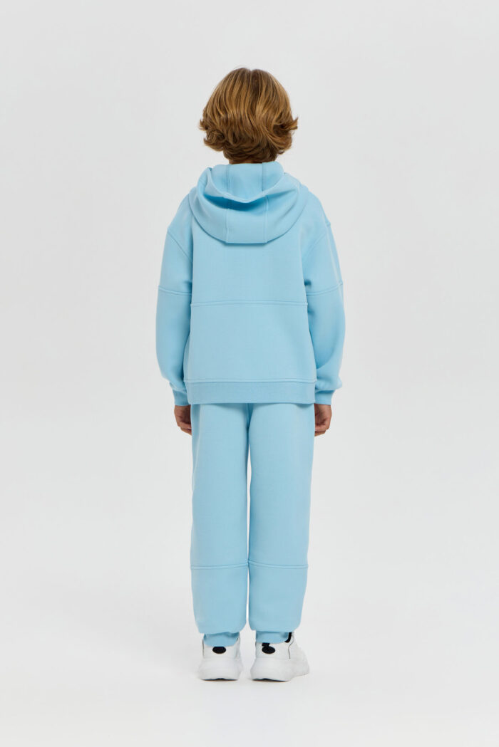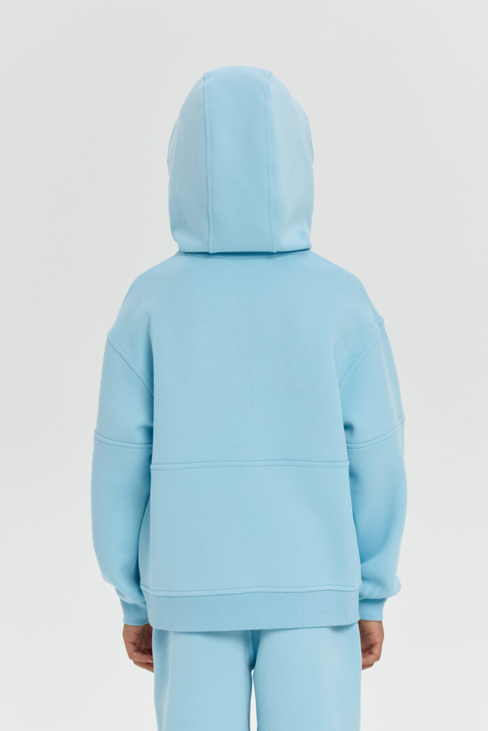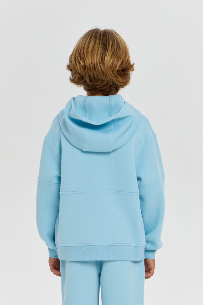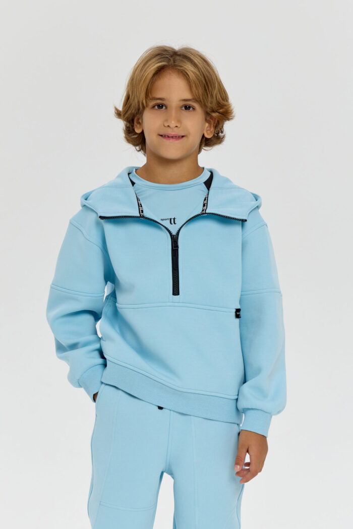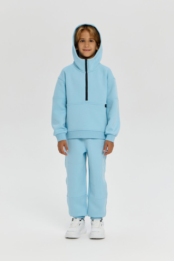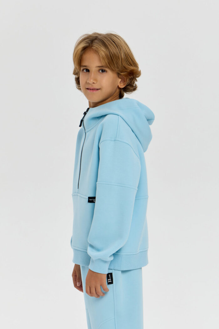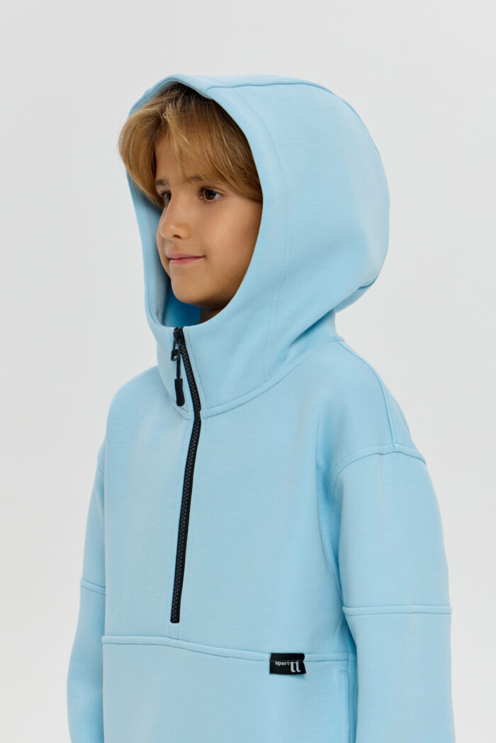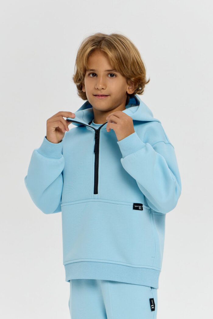 This boys’ sweatshirt is a perfect combination of sporty practicality and fashionable design. The model is made of innovative neoprene with embossed decorative stitching that adds dynamism and draws attention. The half-zip design with a zip up to the chest makes it easy to put on and take off. The adjustable hood protects your child from the wind and creates a sporty look. Wide elastic at the bottom and cuffs ensures a secure fit and retains heat. The sweatshirt is comfortable for both everyday wear and sports. The material retains its shape, does not restrict movement and effectively protects against cool weather. The grey-blue colour goes well with both dark and light pants or jeans.