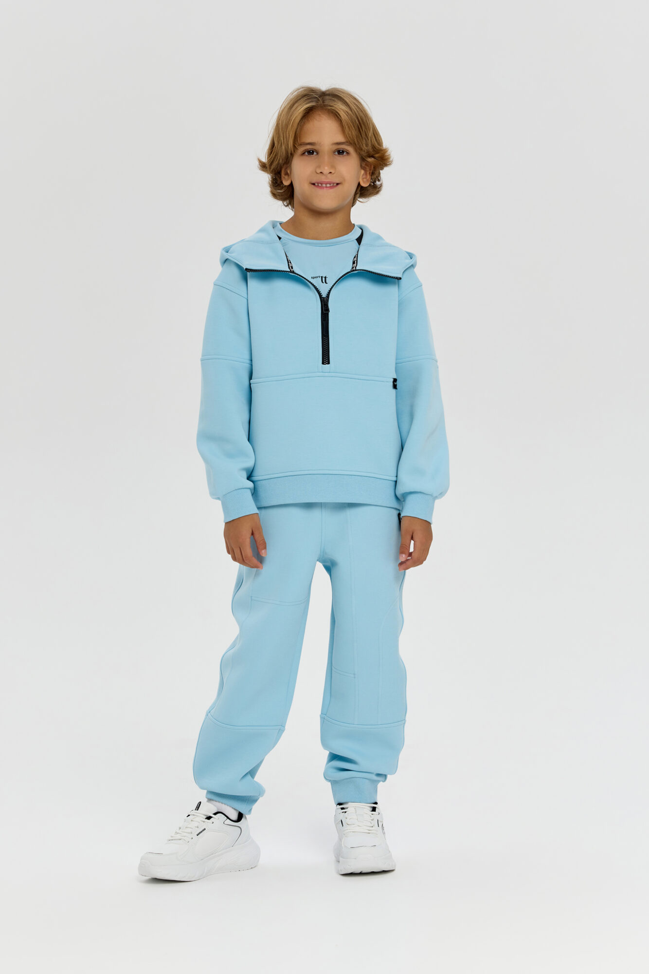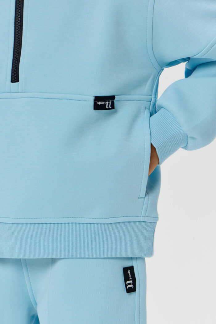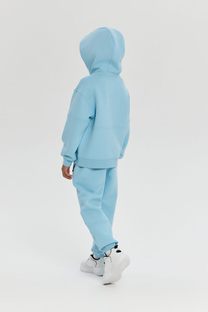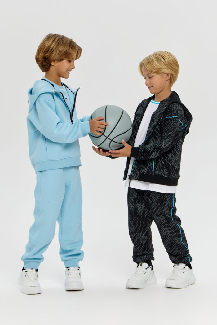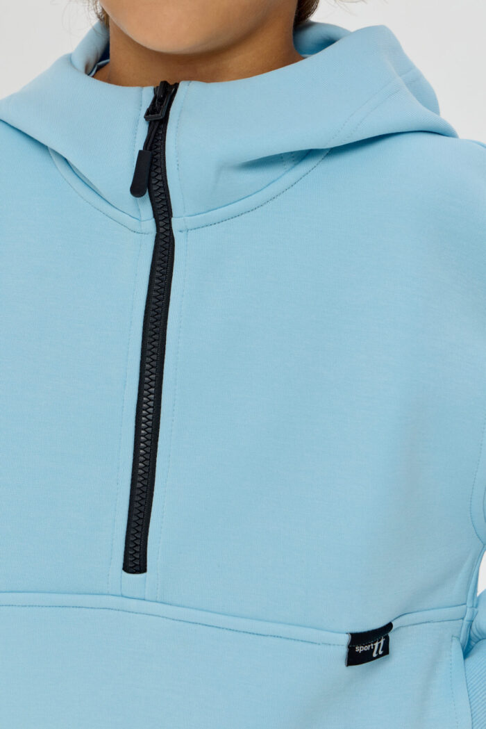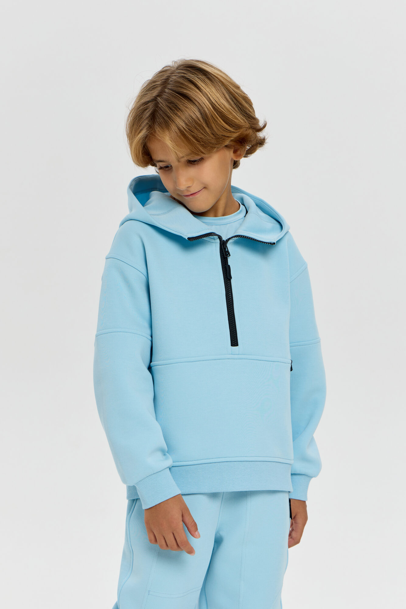 This boys’ sweatshirt is a perfect combination of sporty practicality and fashionable design. The model is made of innovative neoprene with embossed decorative stitching that adds dynamism and draws attention. The half-zip design with a zip up to the chest makes it easy to put on and take off. The adjustable hood protects your child from the wind and creates a sporty look. Wide elastic at the bottom and cuffs ensures a secure fit and retains heat. The sweatshirt is comfortable for both everyday wear and sports. The material retains its shape, does not restrict movement and effectively protects against cool weather. The grey-blue colour goes well with both dark and light pants or jeans.