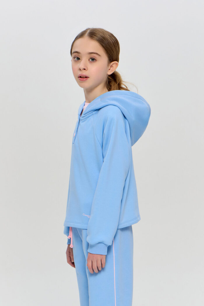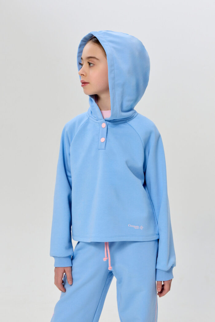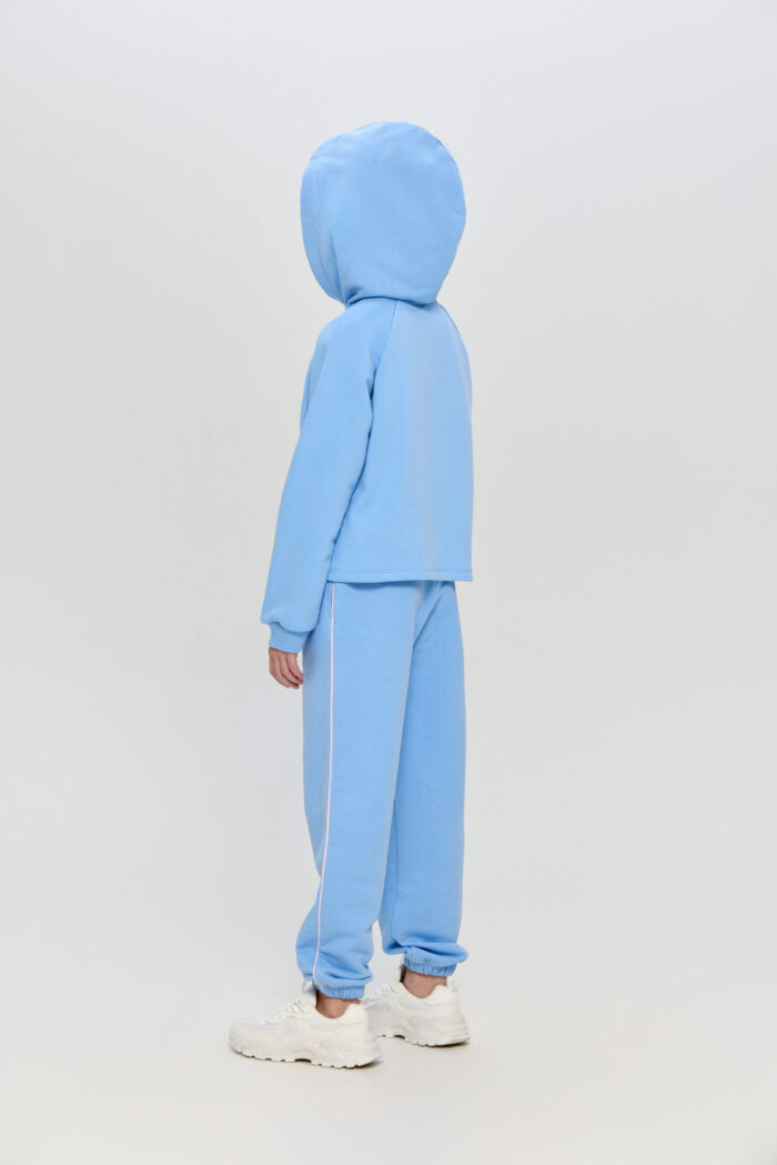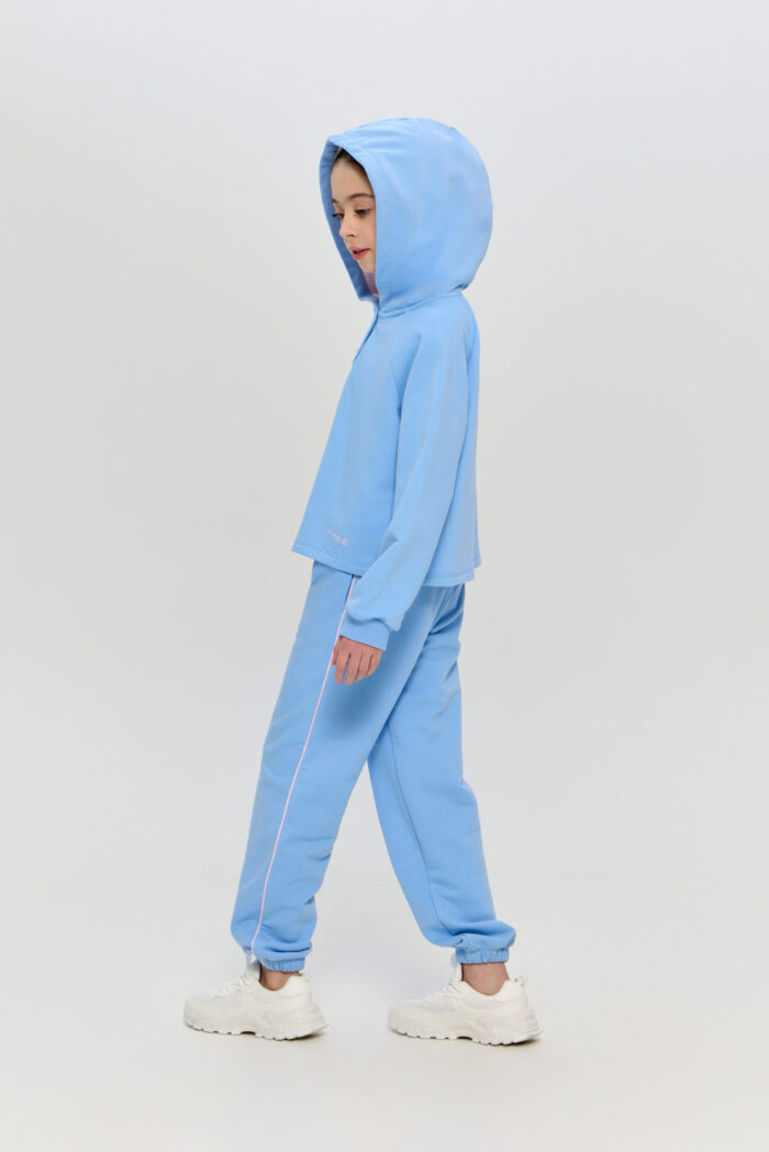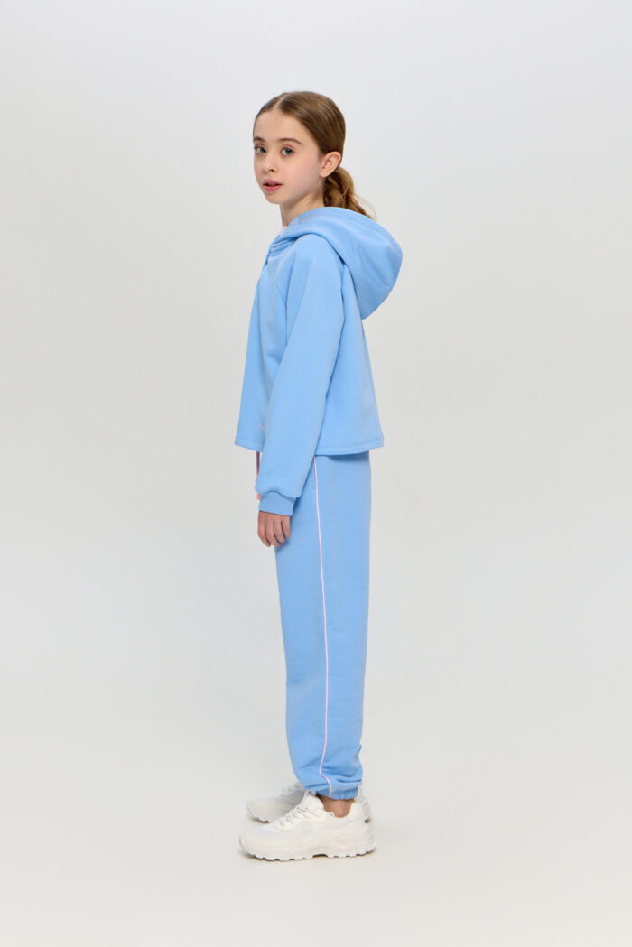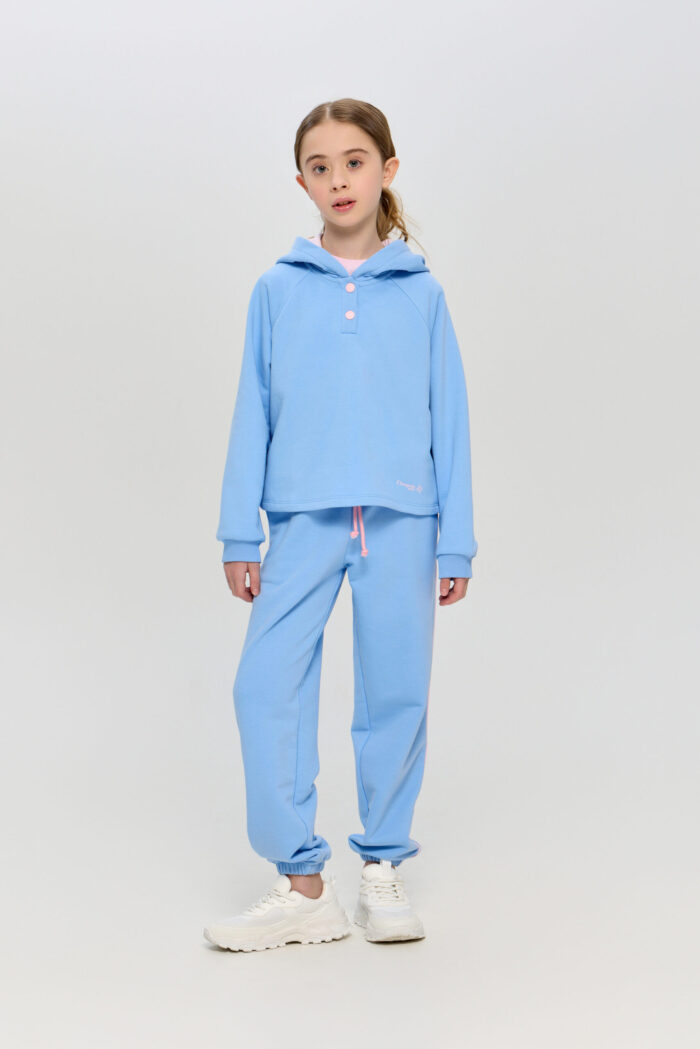 This sporty style hoodie is a great choice for girls who prefer comfort and a modern look. The soft knitted material provides a feeling of warmth and cosiness in cool weather. Free silhouette model, long sleeves with cuffs. Fastens with buttons. Practical hood will shelter from the wind. This sweatshirt is perfect for sports training, outdoor activities or everyday wear.