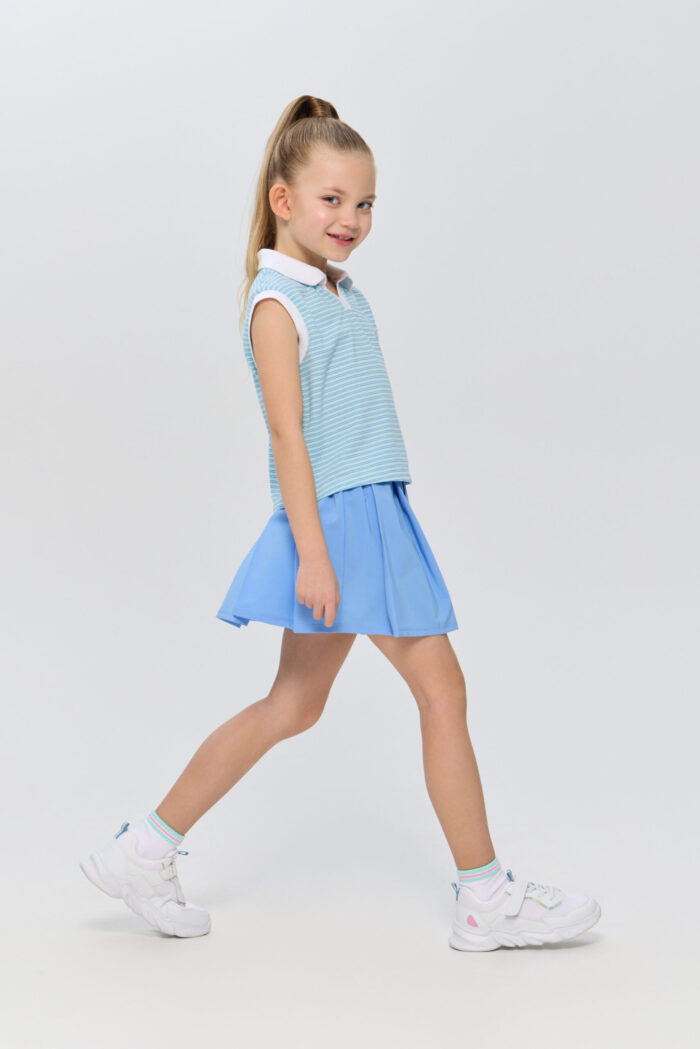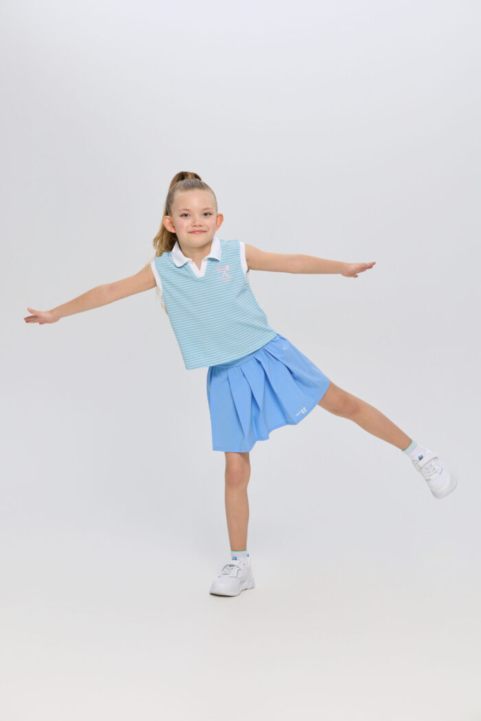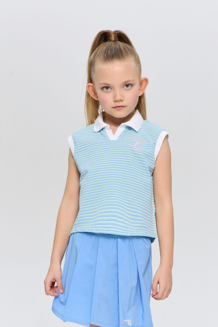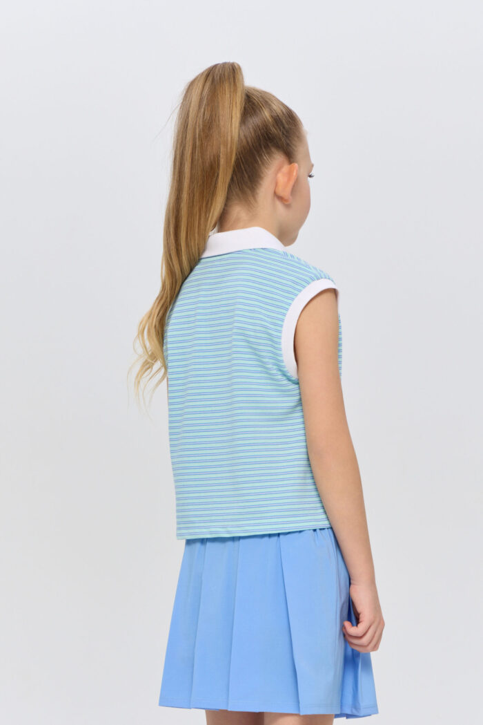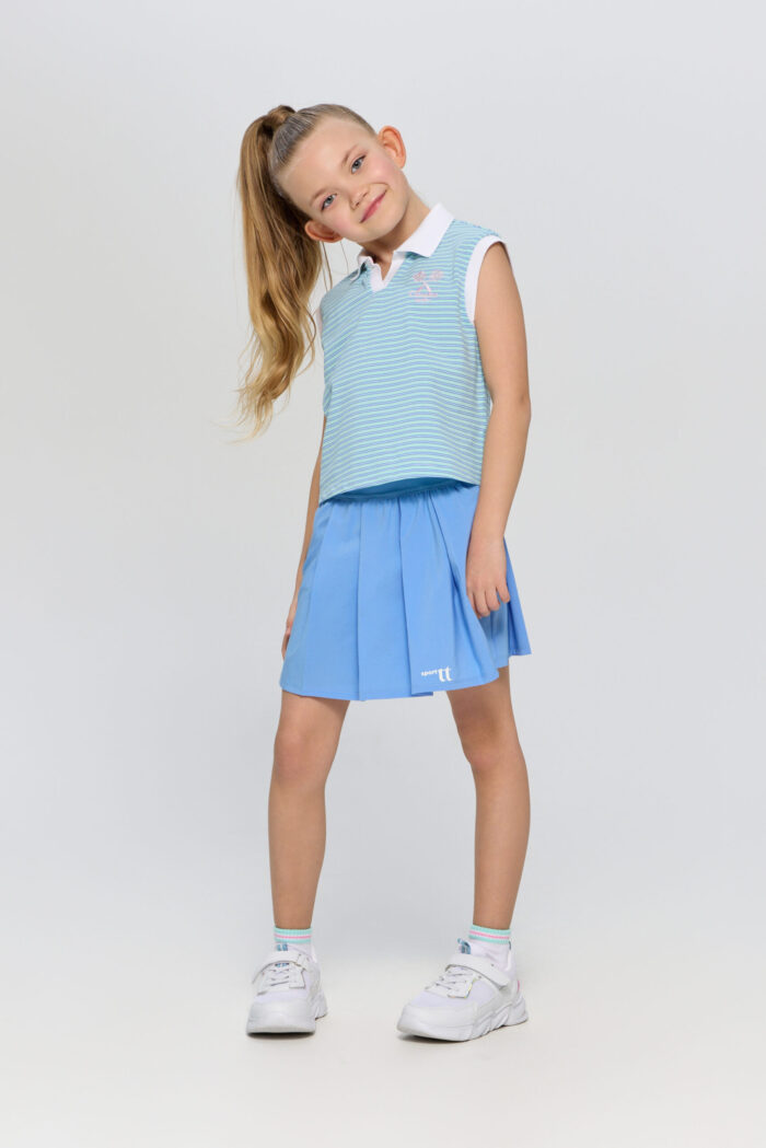 The sleeveless polo shirt for girls is suitable for both playing tennis and creating stylish urban sets. It is an ideal choice for active children who are keen on sports and appreciate comfort. The model is made of lightweight and breathable cotton-based material that guarantees good air circulation, which is especially important during active games on the court. The T-shirt is decorated with a contrasting polo collar and designer racquet embroidery.