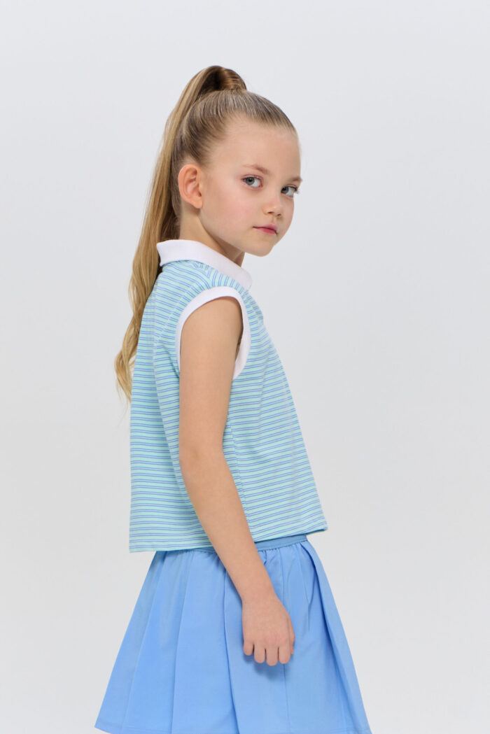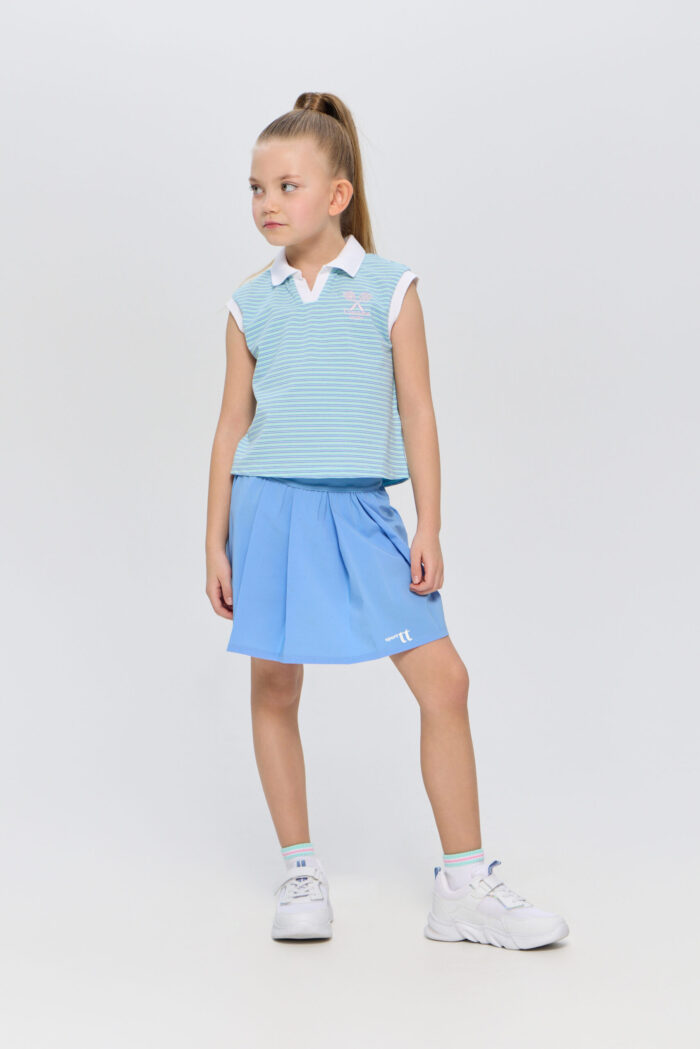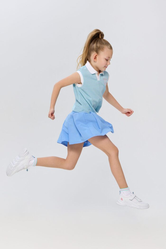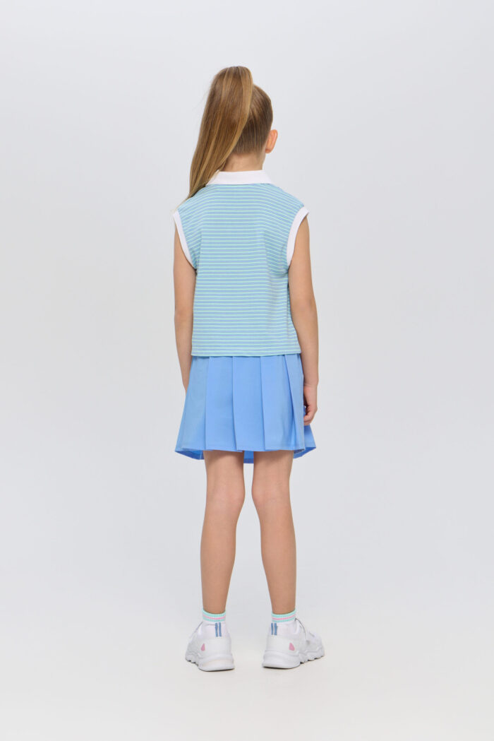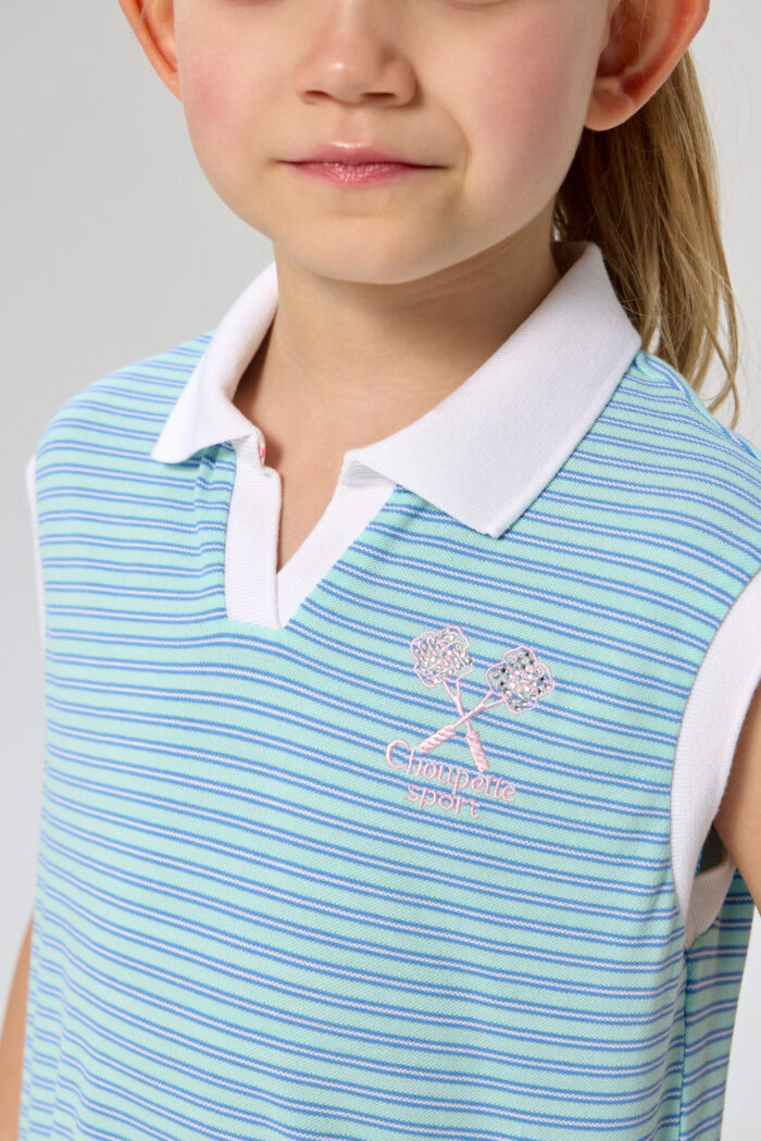 The sleeveless polo shirt for girls is suitable for both playing tennis and creating stylish urban sets. It is an ideal choice for active children who are keen on sports and appreciate comfort. The model is made of lightweight and breathable cotton-based material that guarantees good air circulation, which is especially important during active games on the court. The T-shirt is decorated with a contrasting polo collar and designer racquet embroidery.