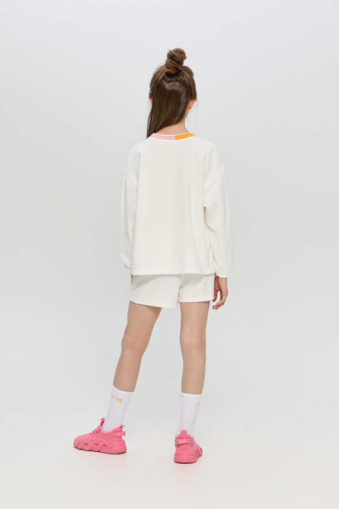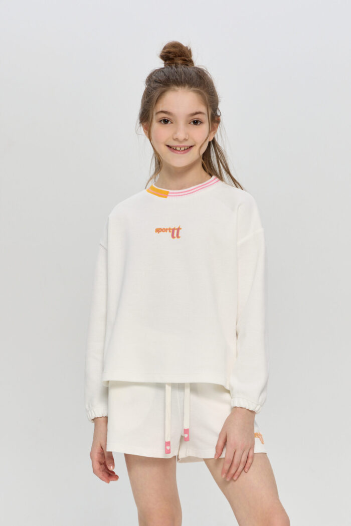 Sporty sweatshirt for girls is an excellent solution for active children. The loose fit does not restrict movement, which is essential during active games and sports. The sweatshirt is versatile and suitable for everyday use, as well as for spending time outdoors or training in the gym. The model is decorated with a contrasting elasticated neck and vivid designer embroidery. The elastic bands on the cuffs of the sleeves and on the lower edge of the model guarantee a comfortable fit and protection from the wind.