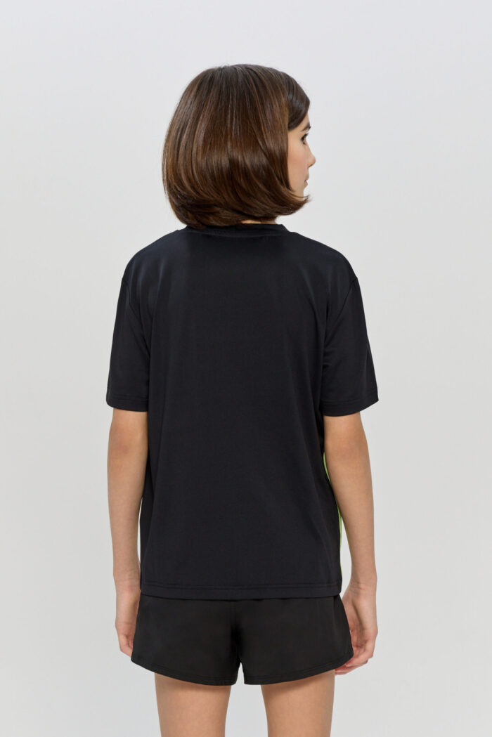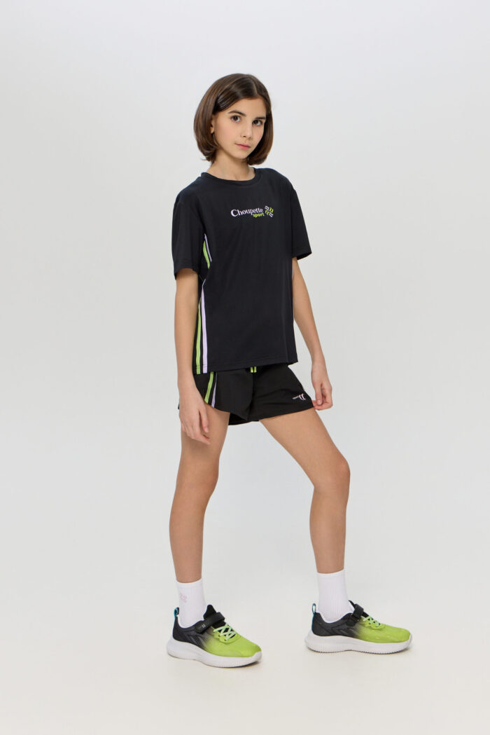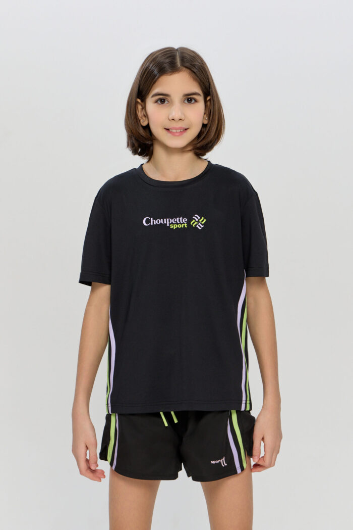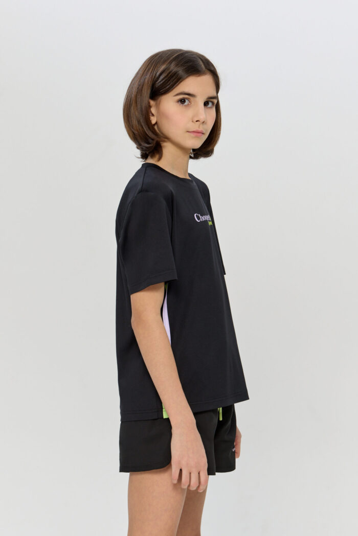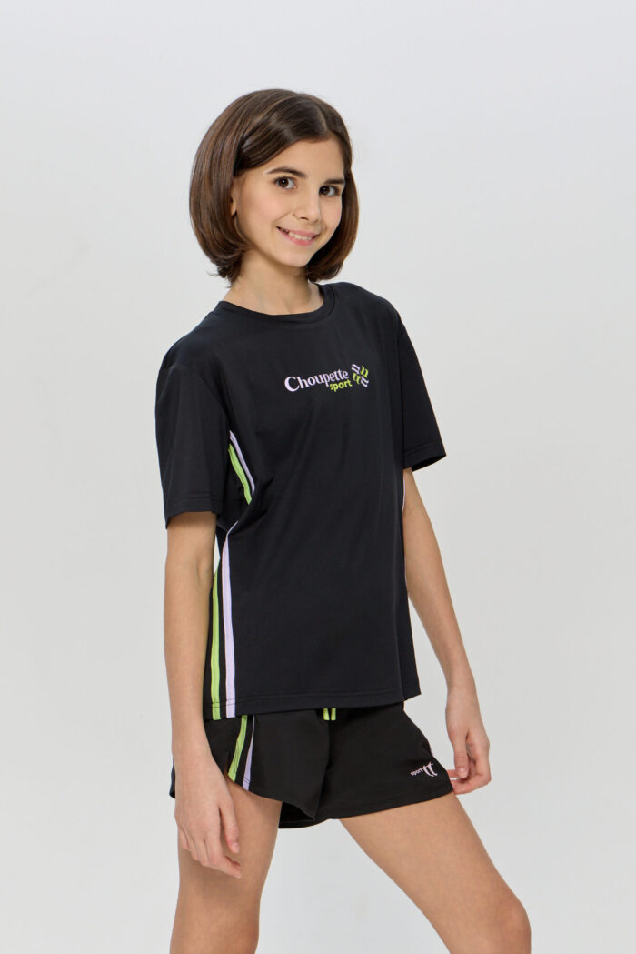 Elasticated sports T-shirt for girls. It is made of BiFlex with modern CH Dry moisture-wicking technology and is ideal for sports activities. The loose fit, does not restrict movement, allowing your child to easily perform any sporting activity. The T-shirt is designed in a versatile black colour with colourful side inserts.