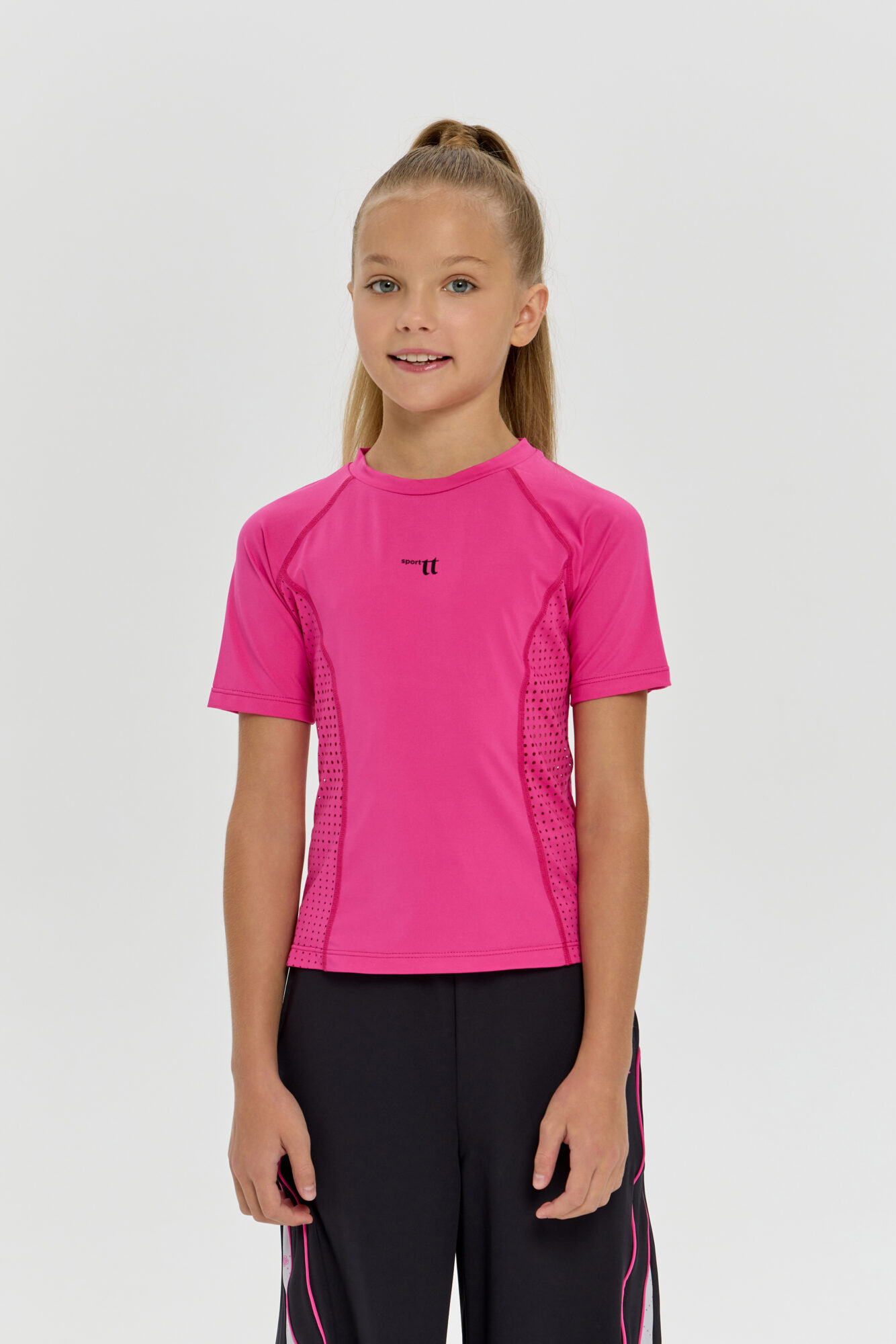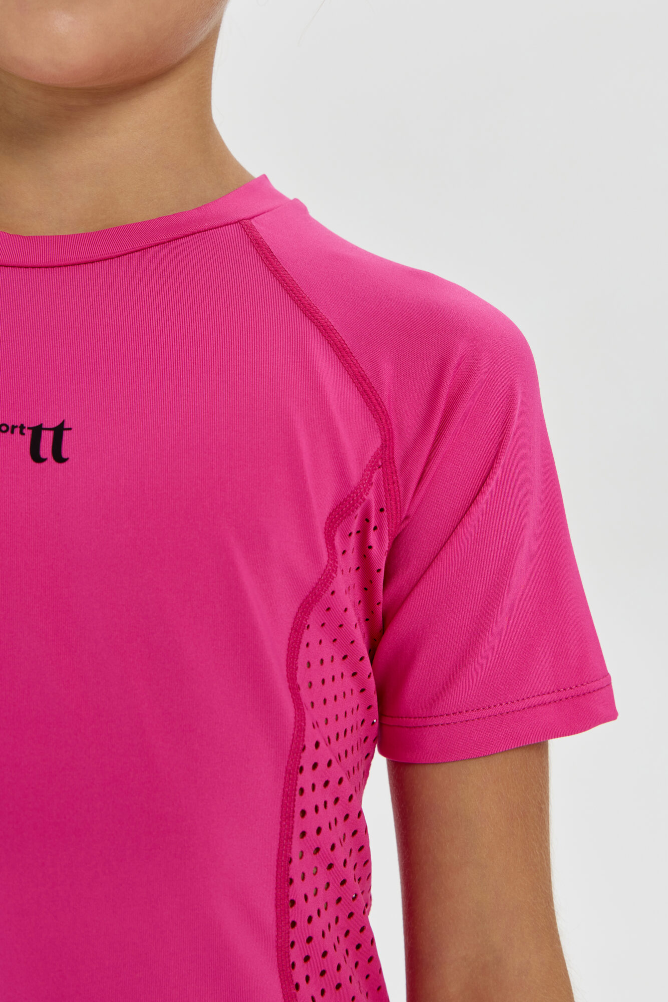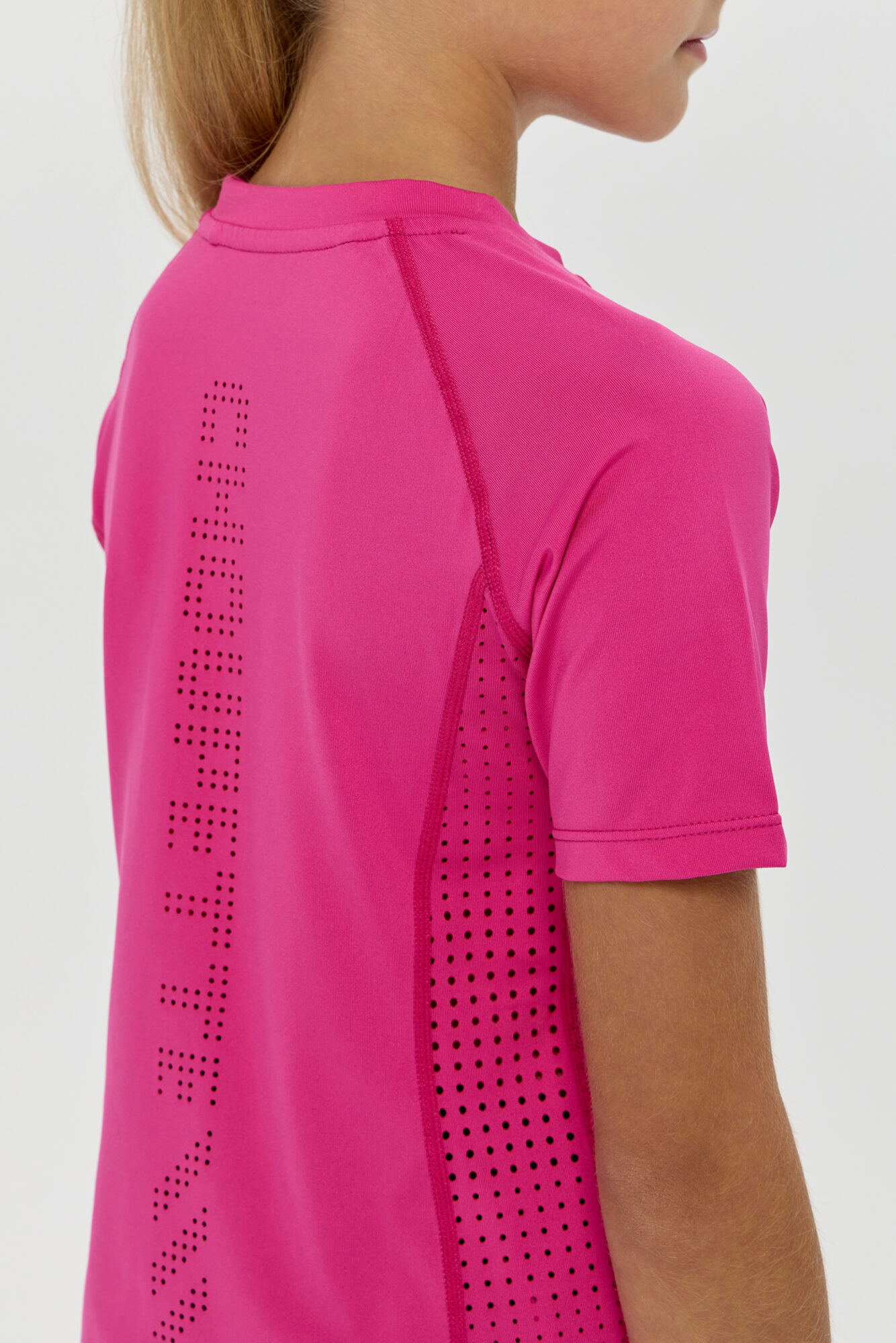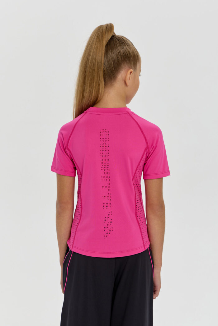 This fuchsia T-shirt will add a colourful touch to the wardrobe of any young sports enthusiast. The model is made from high-tech CH Dry fabric with perforations. Thanks to the perforations, the fabric has improved breathability, allowing the skin to breathe. The lightweight and comfortable fit of the T-shirt does not restrict movement, allowing the girl to feel as free as possible. It goes perfectly with leggings or loose-fitting sports pants.