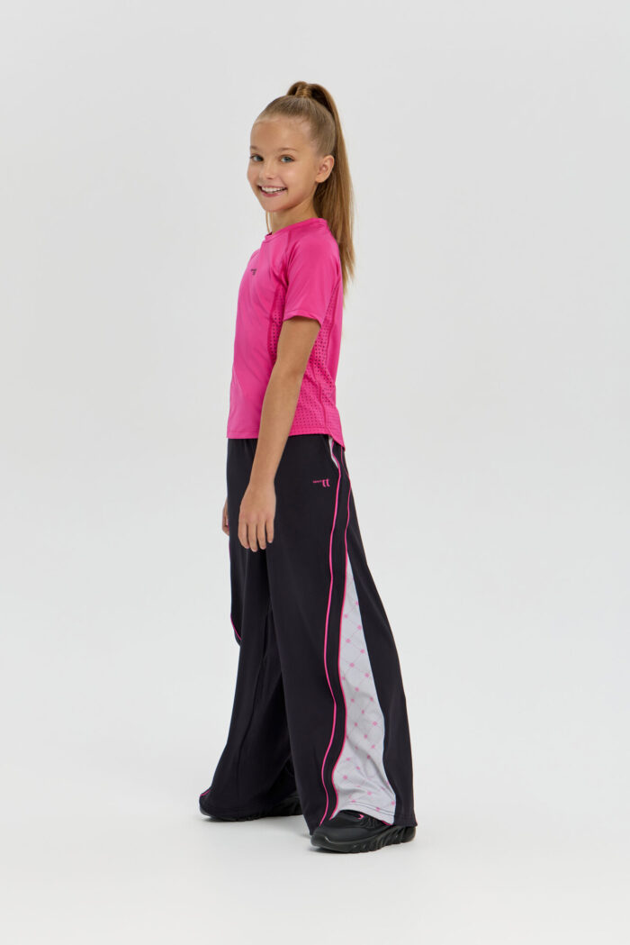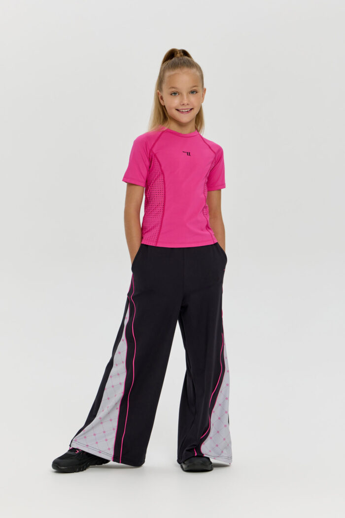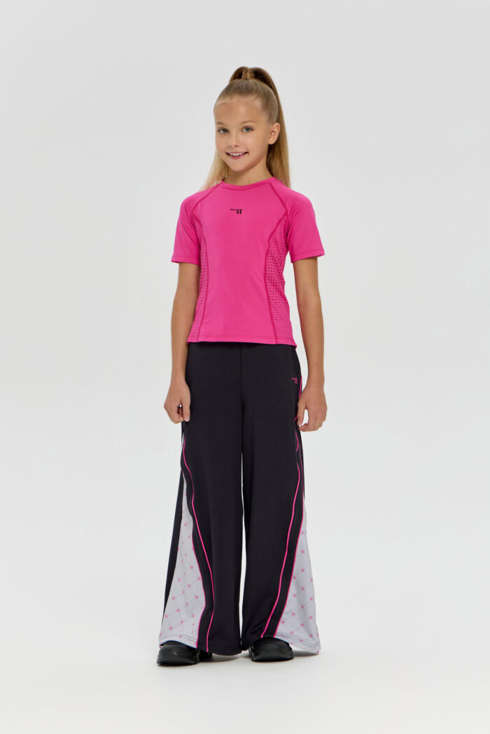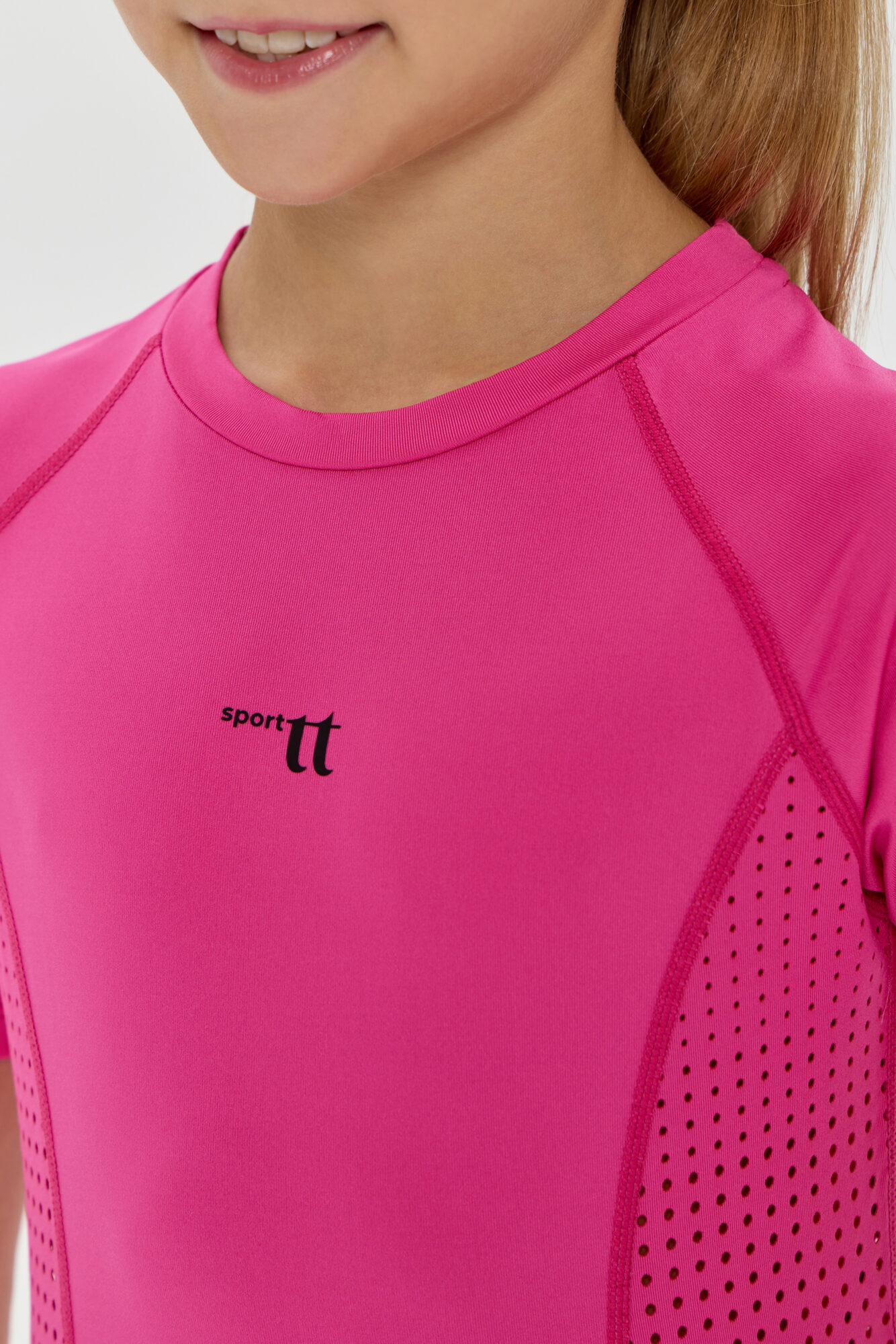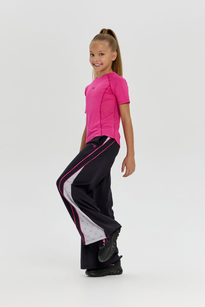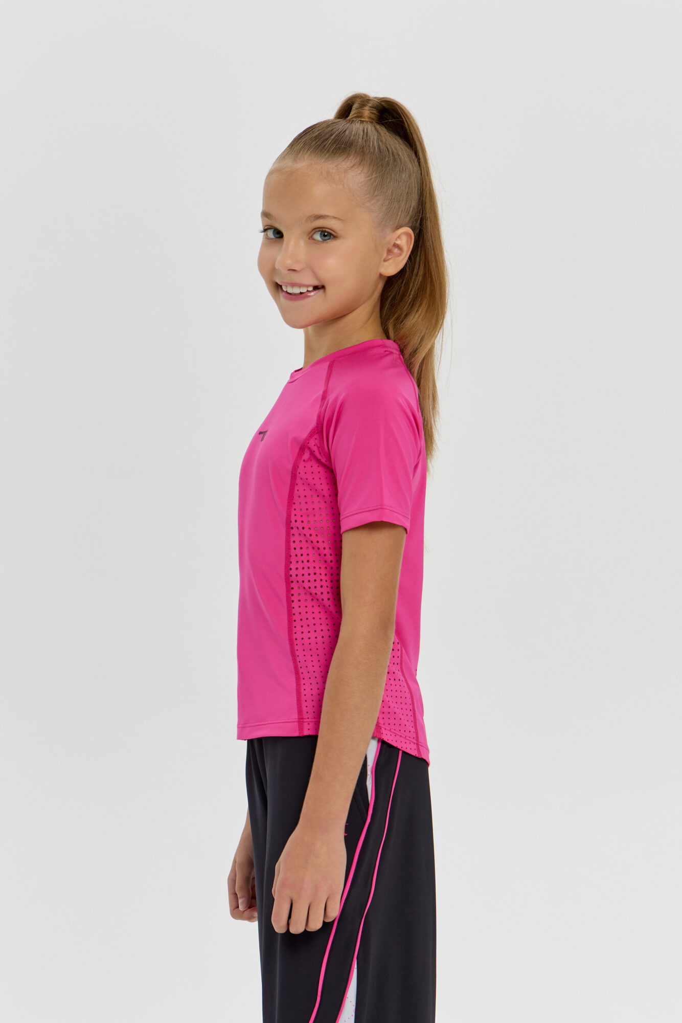 This fuchsia T-shirt will add a colourful touch to the wardrobe of any young sports enthusiast. The model is made from high-tech CH Dry fabric with perforations. Thanks to the perforations, the fabric has improved breathability, allowing the skin to breathe. The lightweight and comfortable fit of the T-shirt does not restrict movement, allowing the girl to feel as free as possible. It goes perfectly with leggings or loose-fitting sports pants.