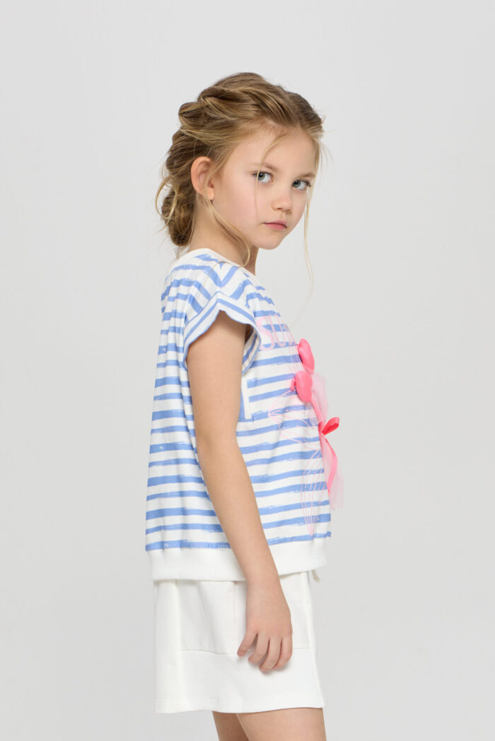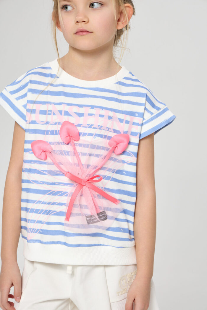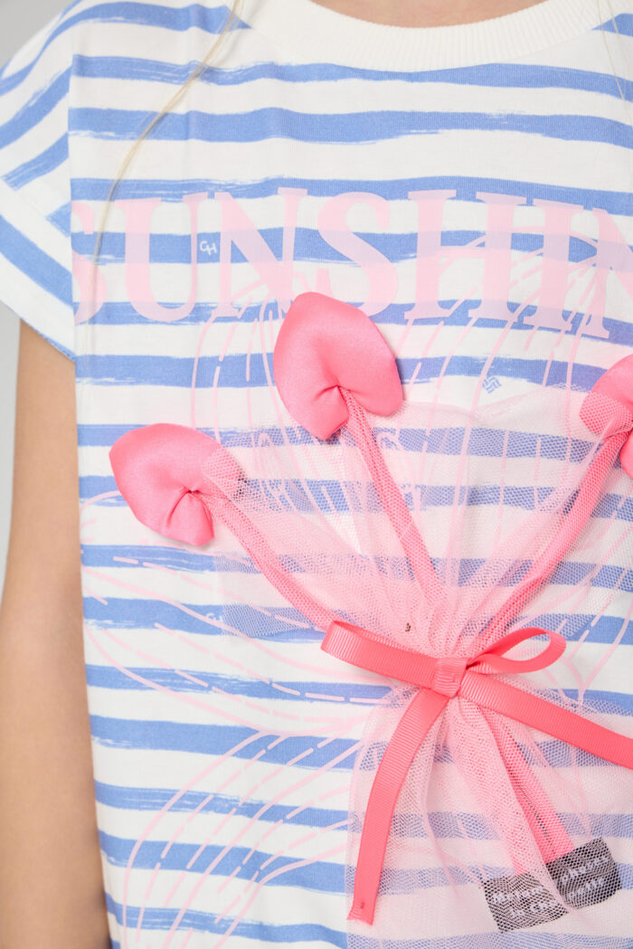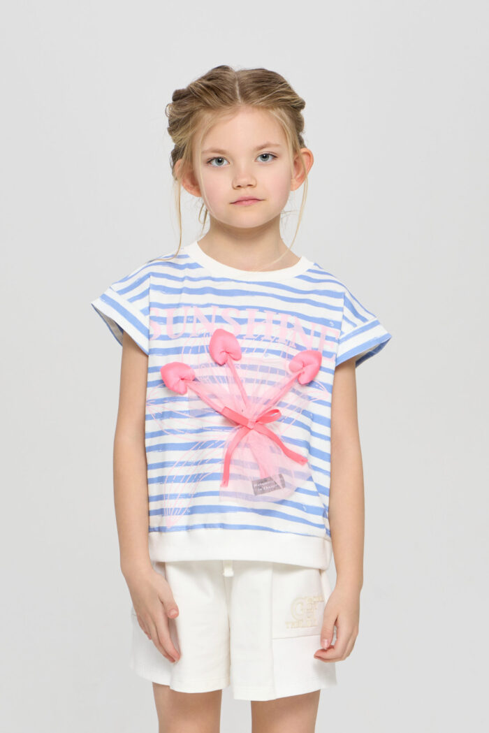 The blue striped T-shirt will be a great addition to a girl’s summer wardrobe. Comfortable and stylish design attracts attention and creates a positive mood. Unique textured decoration in pink colour gives the T-shirt originality and makes it really special. The model is made of high quality cotton, which is pleasant to the touch and has good air permeability.