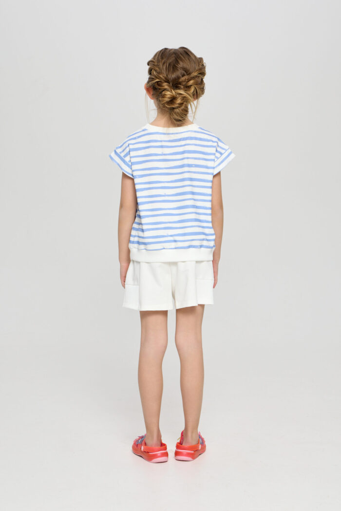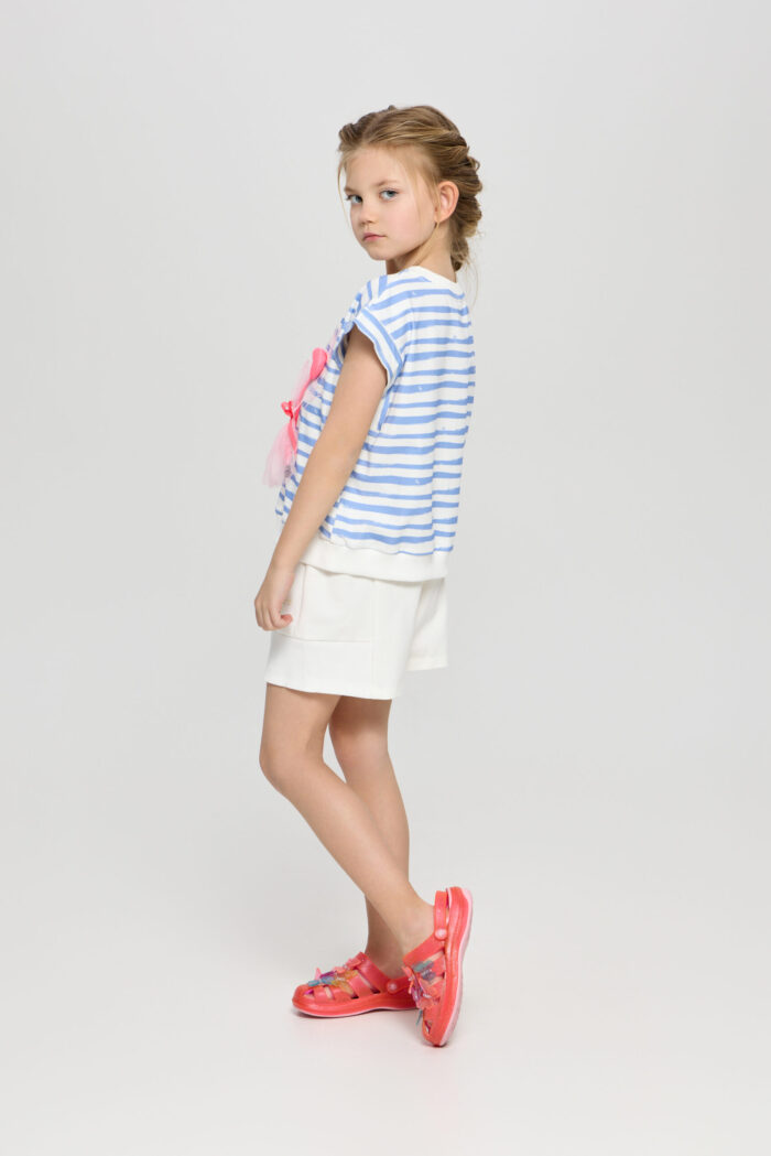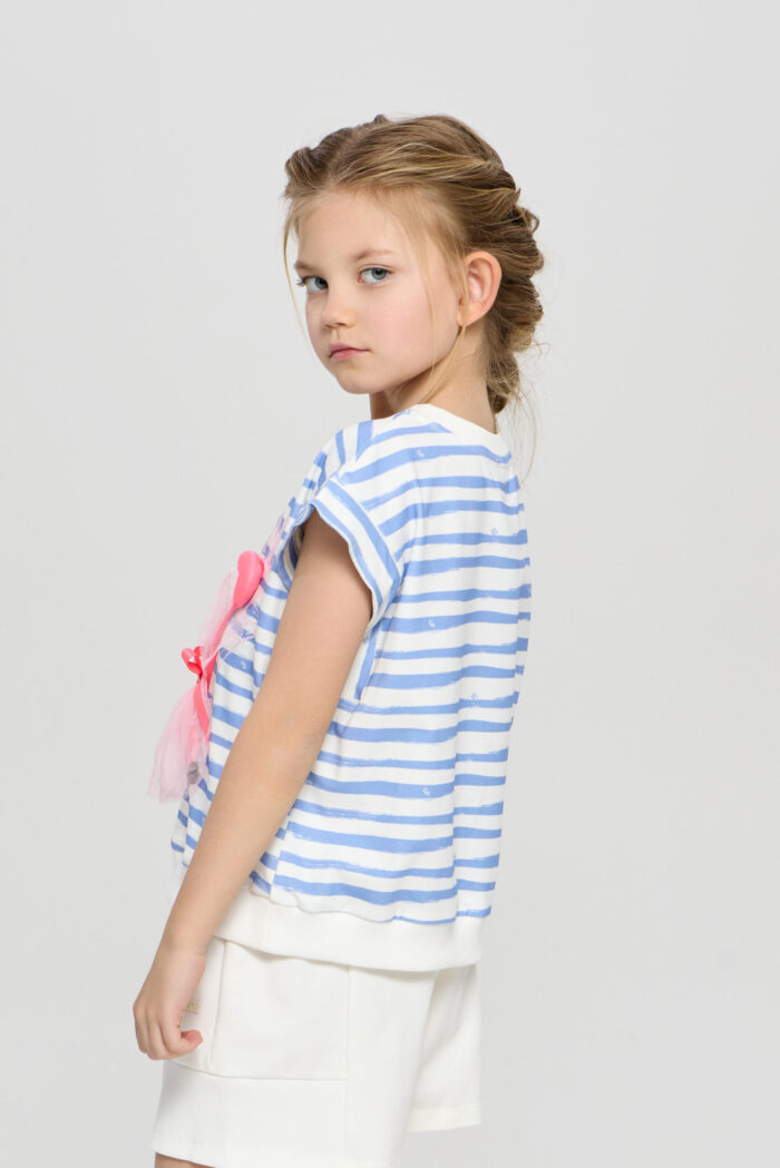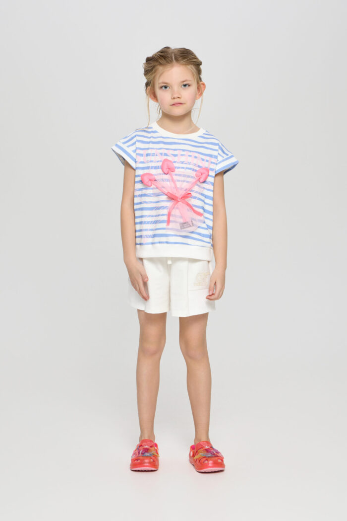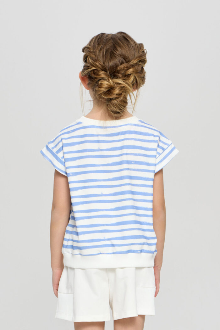 The blue striped T-shirt will be a great addition to a girl’s summer wardrobe. Comfortable and stylish design attracts attention and creates a positive mood. Unique textured decoration in pink colour gives the T-shirt originality and makes it really special. The model is made of high quality cotton, which is pleasant to the touch and has good air permeability.