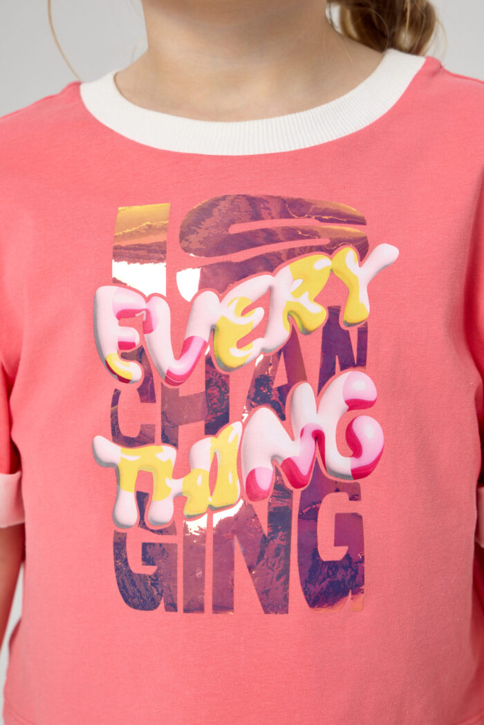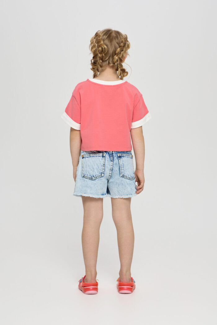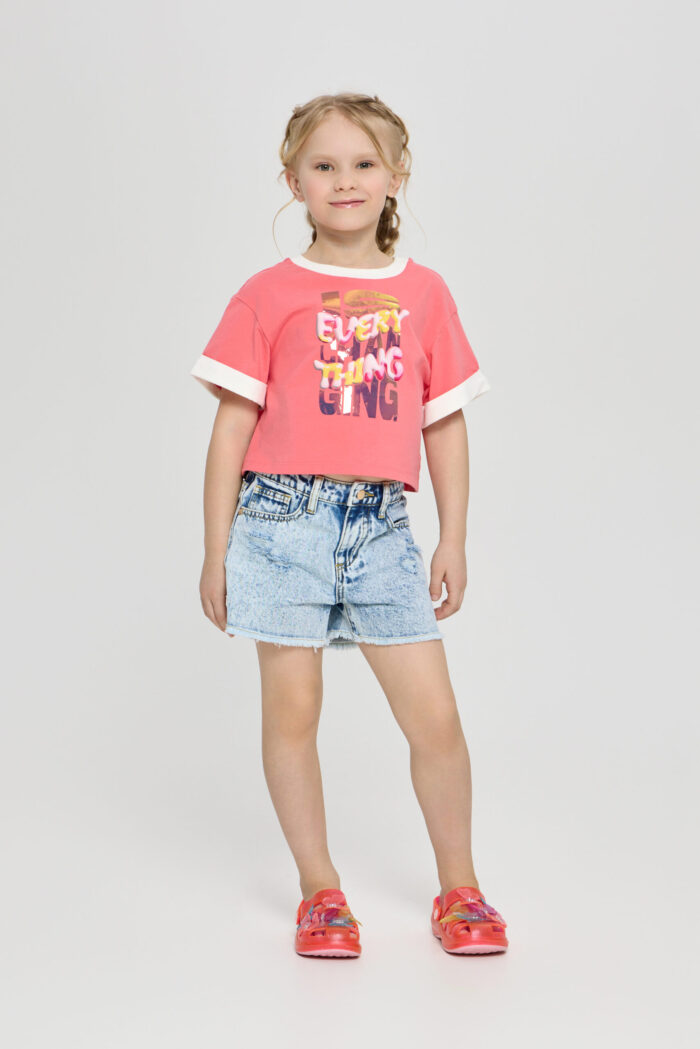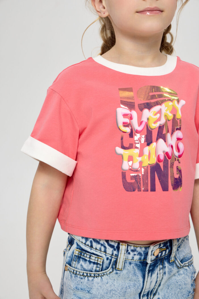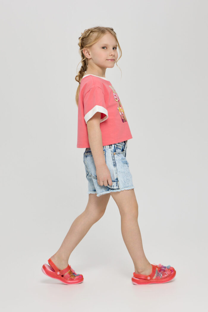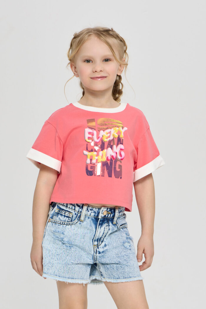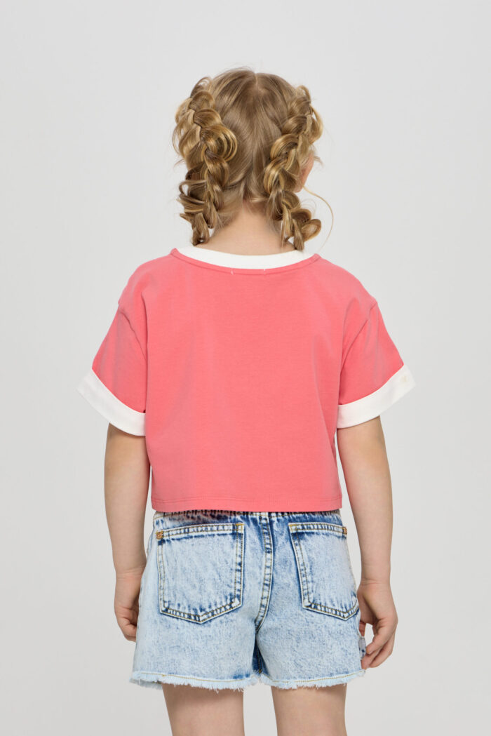 Coral-coloured short girls’ T-shirt with a stylish print and contrast edging. The model is decorated with an original designer print that attracts attention. The sleeves and the edges of the product are decorated with contrast edging, which gives the T-shirt a fashionable and modern look. The model is made of soft and breathable material, which feels good on the skin and provides comfort to the child throughout the day.