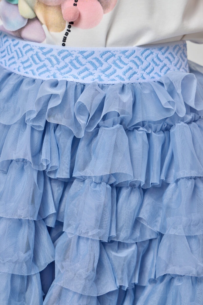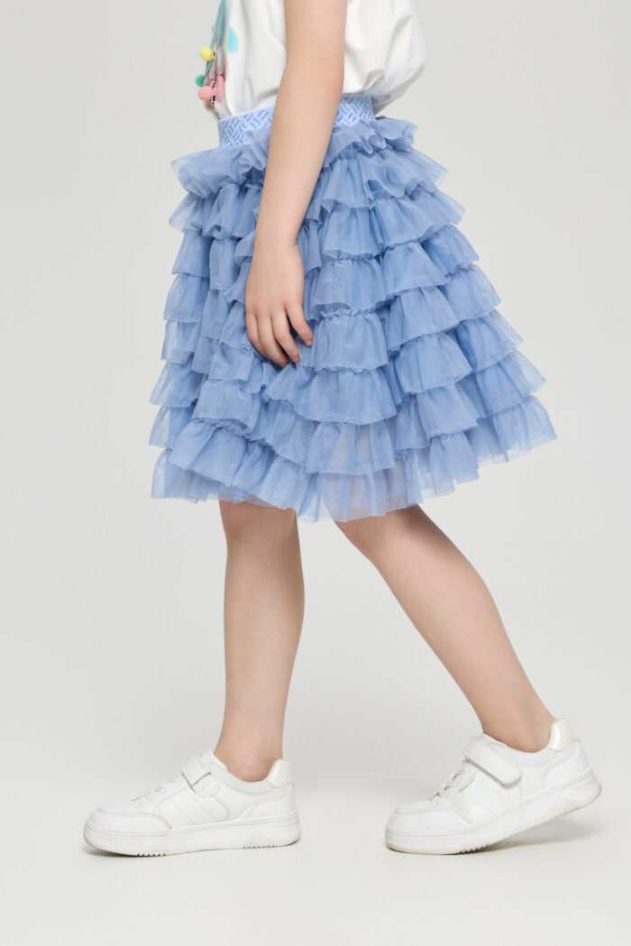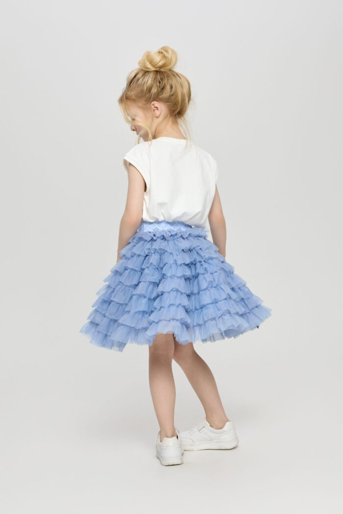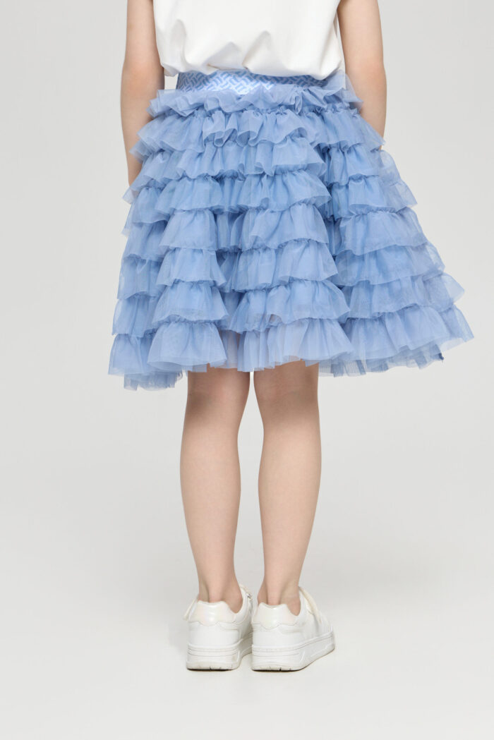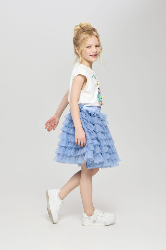 Tiered skirt in cornflower colour will become a vivid accent in a girl’s wardrobe. Each tier of the skirt adds volume and dynamics. The elasticated waistband provides a comfortable fit, allowing the skirt to sit perfectly on the waist. The model is perfectly combined with various tops and blouses, allowing you to create a variety of looks.
