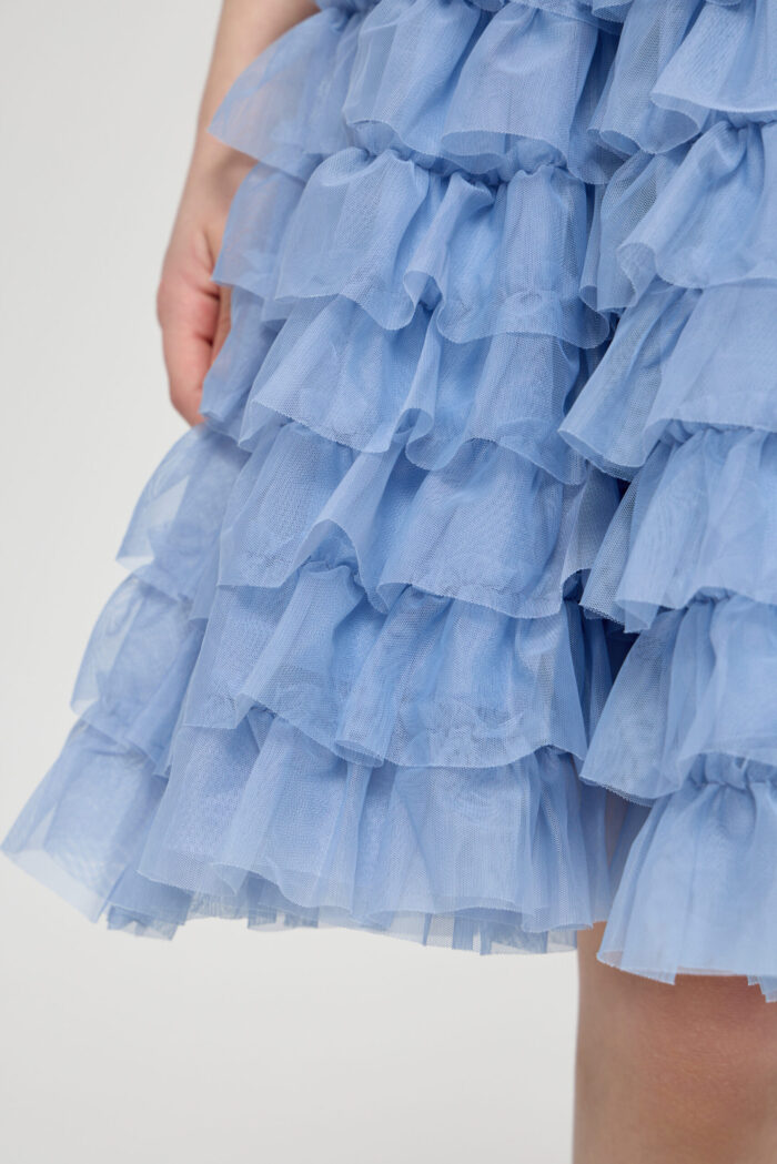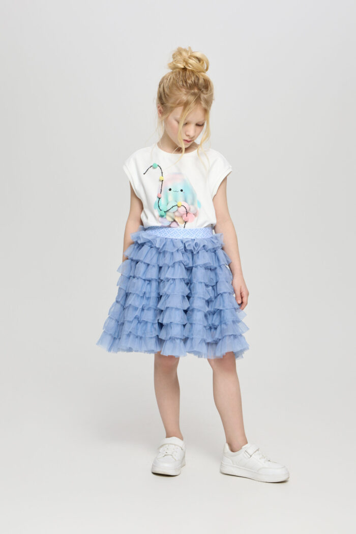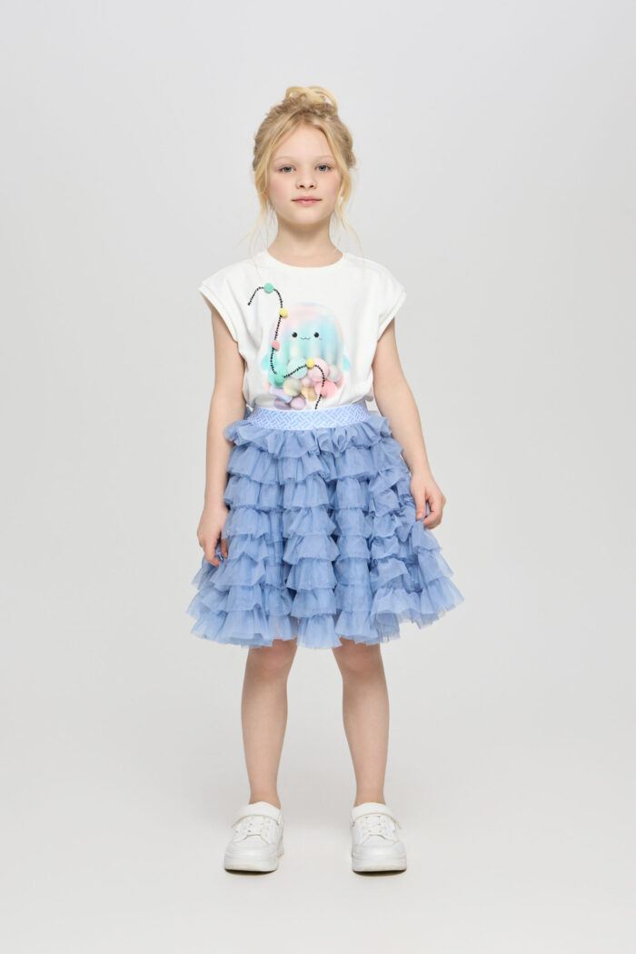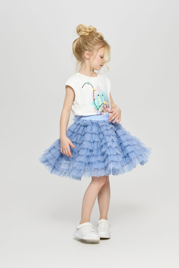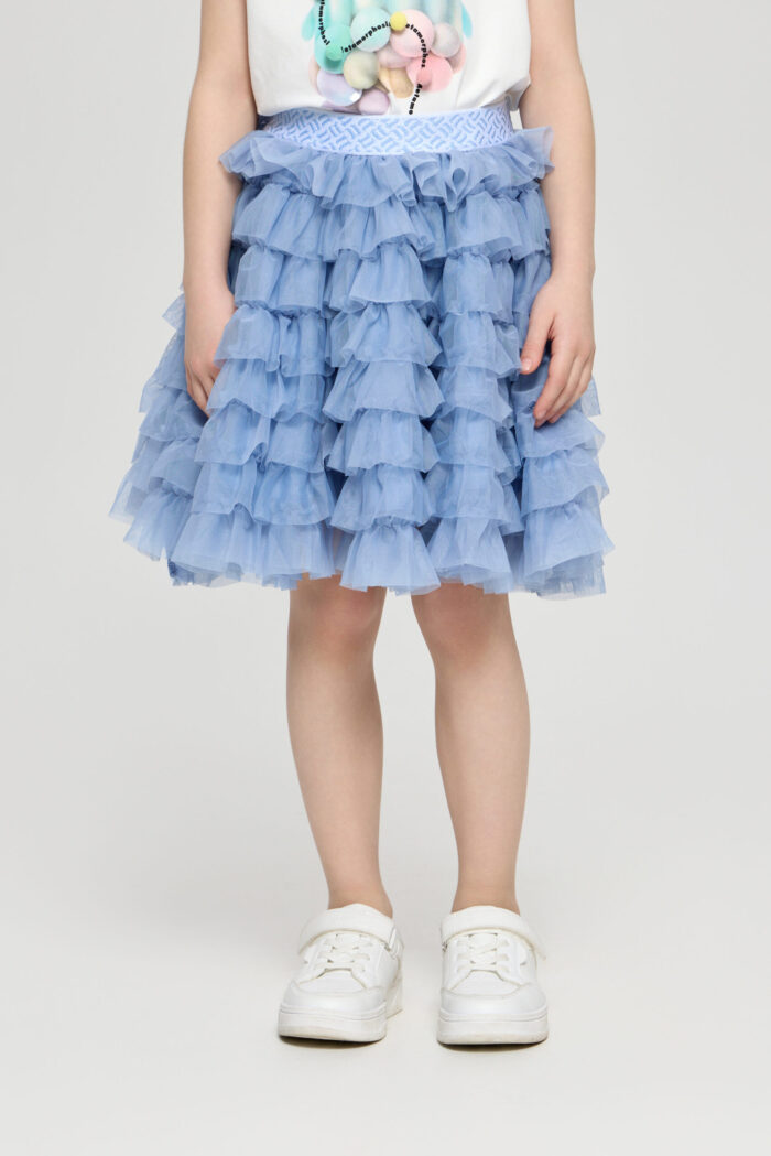 Tiered skirt in cornflower colour will become a vivid accent in a girl’s wardrobe. Each tier of the skirt adds volume and dynamics. The elasticated waistband provides a comfortable fit, allowing the skirt to sit perfectly on the waist. The model is perfectly combined with various tops and blouses, allowing you to create a variety of looks.