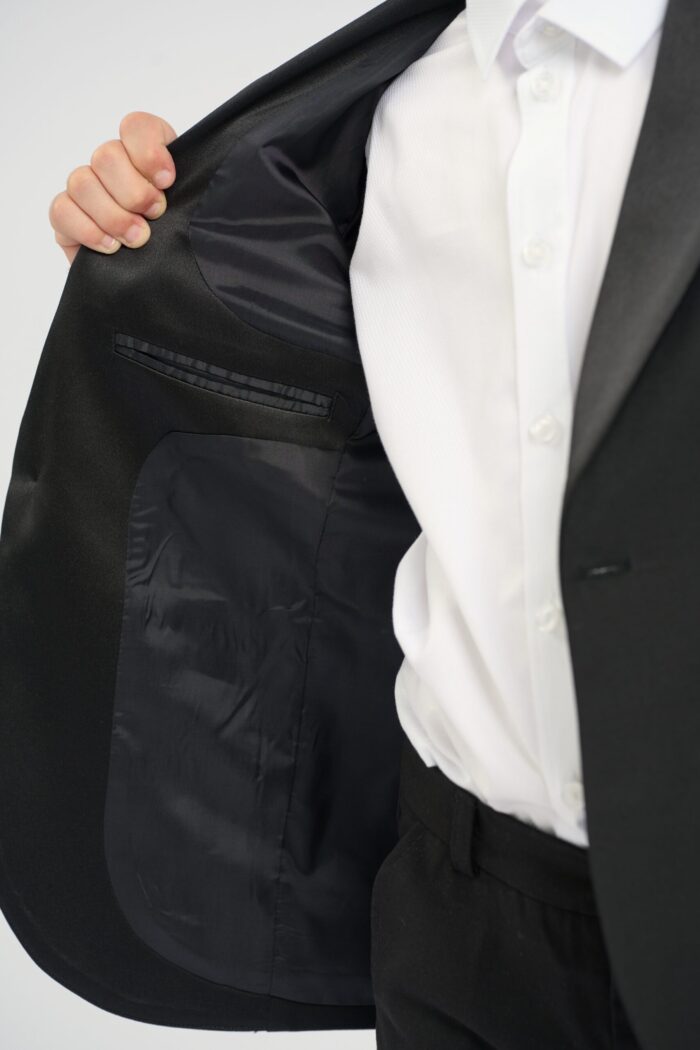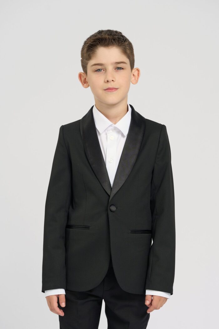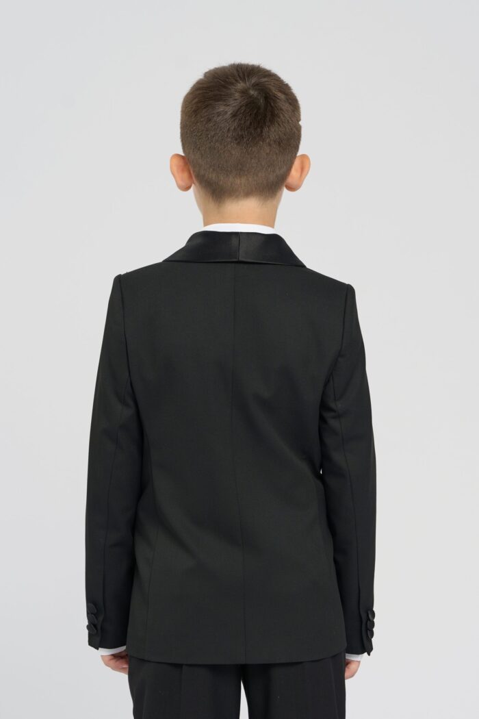 The boy’s suit jacket – tuxedo is a stylish and elegant element of the closet. Classic design with satin lapel gives it a solemn look, distinguishing the little gentleman among his peers. Buttons and pockets decorated with satin fabric create an additional accent. The suit jacket is perfectly combined with classic trousers and shirts, creating a complete look. The jacket is suitable for school holidays, family celebrations and other important events. The easy care material makes it a practical choice for parents.