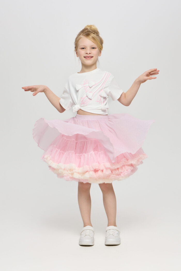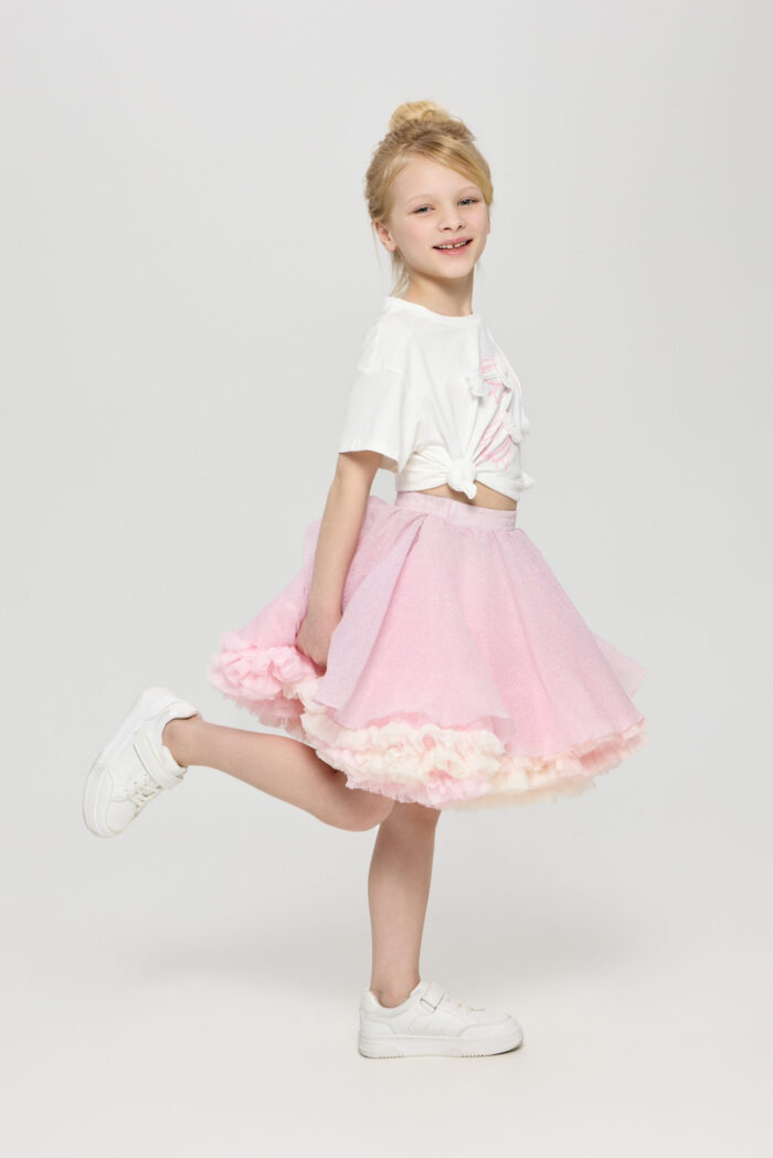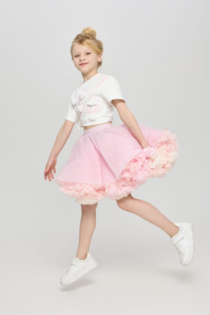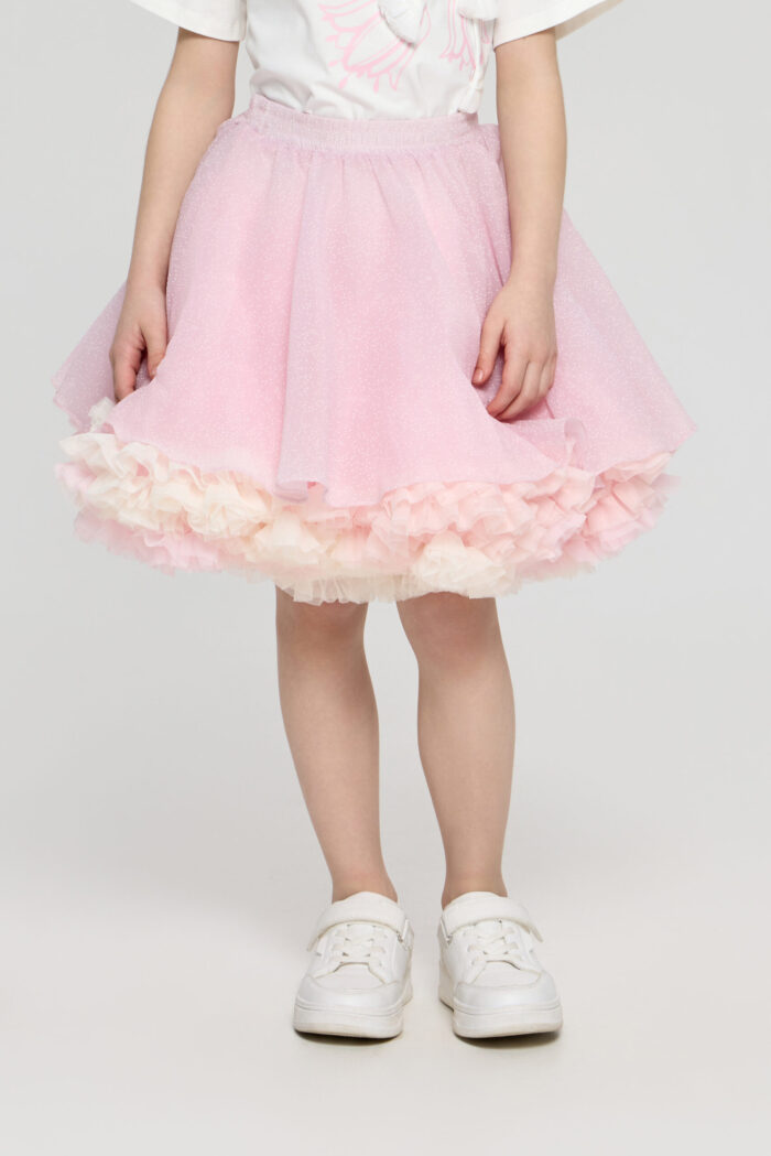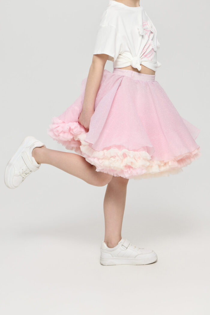 The voluminous skirt in pink colour is a vivid and spectacular element of a girl’s wardrobe. The model is ideal for special occasions such as holidays or parties. The elasticated waistband provides a comfortable and convenient fit, making it easy to put on the skirt. The skirt adds extra volume, creating a playful and romantic silhouette. The pink colour gives the look a delicate touch. The skirt can be perfectly combined with various tops and blouses.