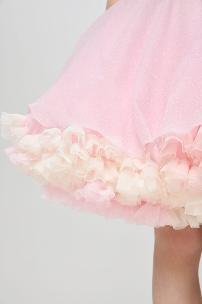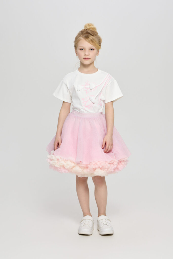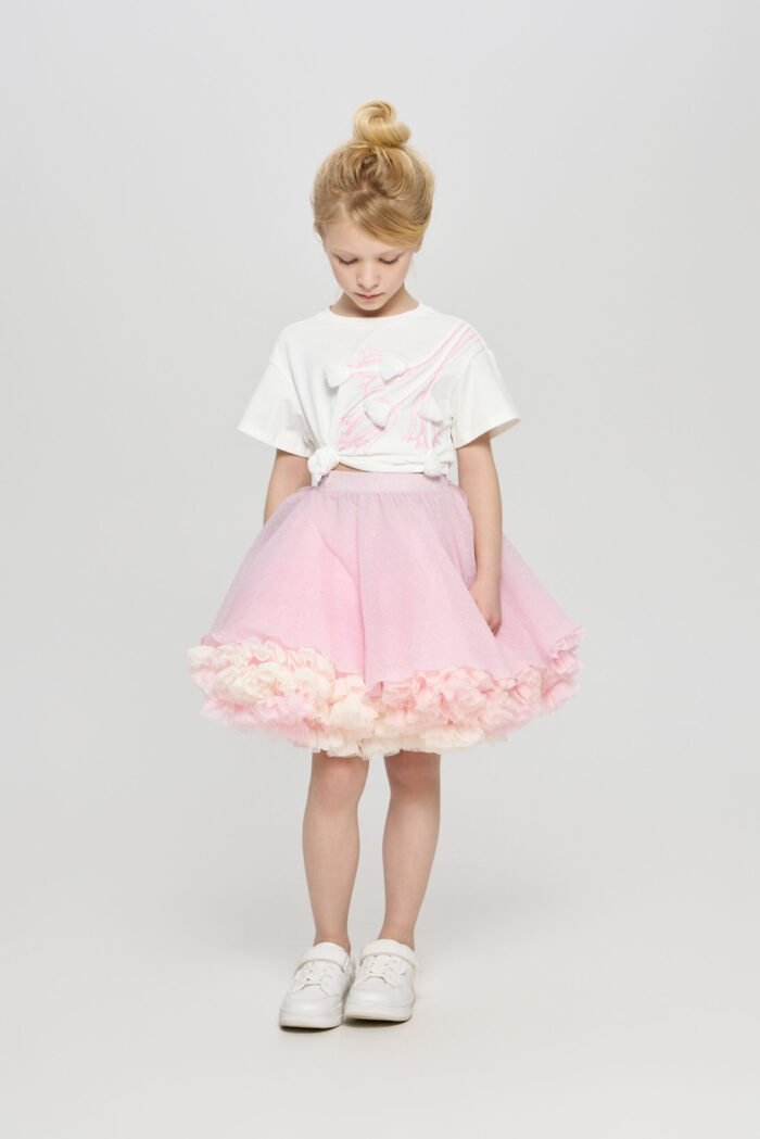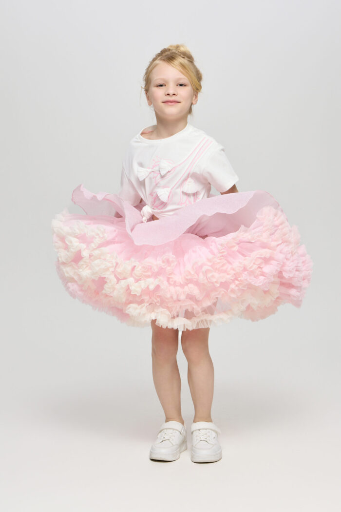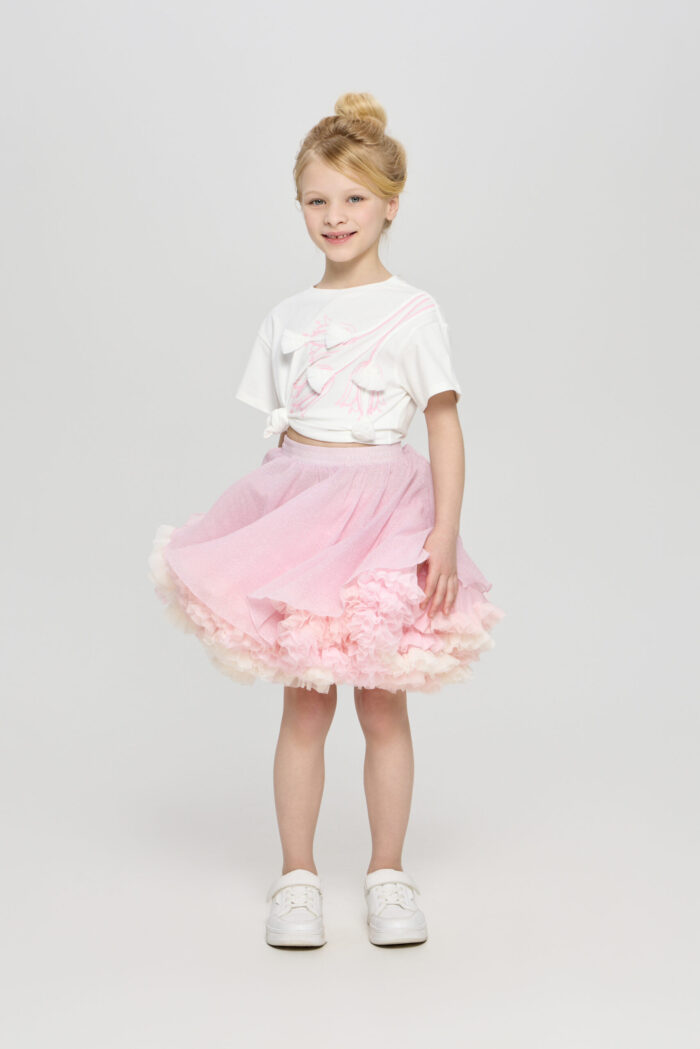 The voluminous skirt in pink colour is a vivid and spectacular element of a girl’s wardrobe. The model is ideal for special occasions such as holidays or parties. The elasticated waistband provides a comfortable and convenient fit, making it easy to put on the skirt. The skirt adds extra volume, creating a playful and romantic silhouette. The pink colour gives the look a delicate touch. The skirt can be perfectly combined with various tops and blouses.