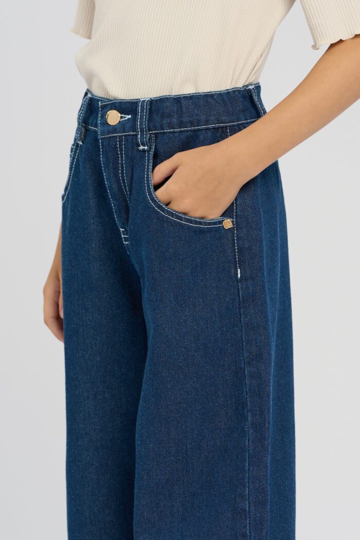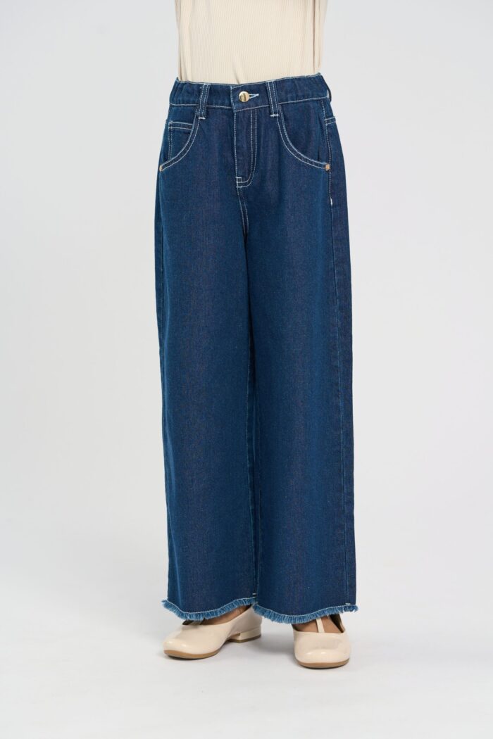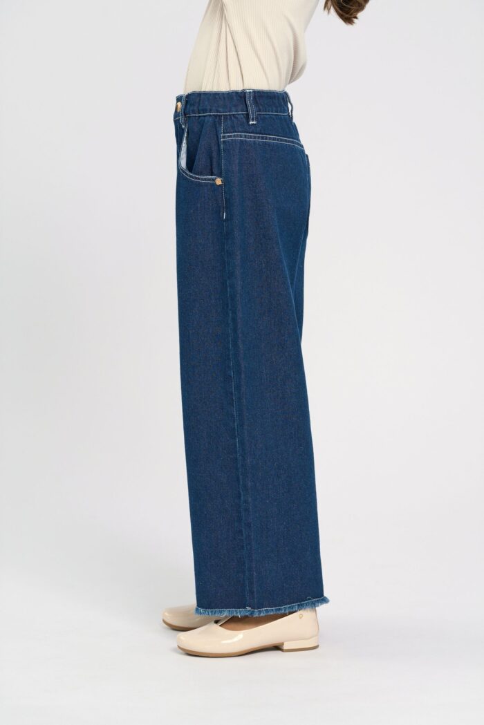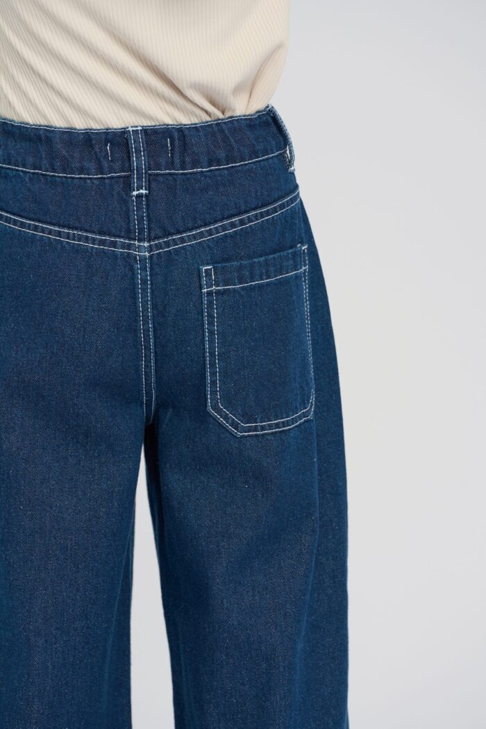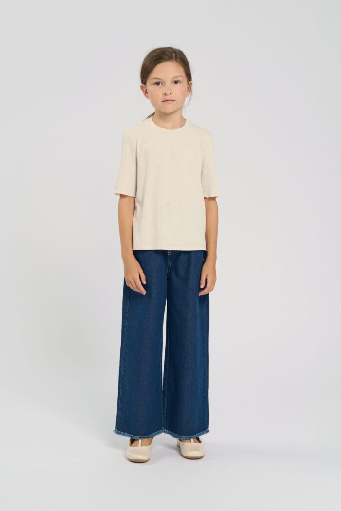 Stylish wide leg jeans for girls – the perfect choice for creating trendy looks! Made of quality denim, they are durable and long-lasting, which is especially important for active kids. Dark blue color is versatile and easy to combine with different tops, from T-shirts to sweaters. The comfortable fit and elasticized waistband guarantee all-day comfort, allowing your child to move freely. Pockets, fringe bottom of the pants and stylish stitching, add originality to the jeans.