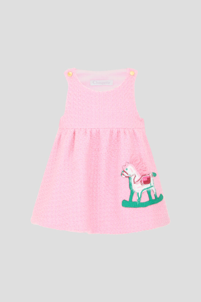 Charming dress for a girl with voluminous applique can decorate any wardrobe. The special trapezoidal shape gives child freedom of movement. Applique in the form of a spectacular textured horse, adds originality. The sleeveless dress is perfect fit for everyday wear and for special occasions. The shoulder pads fasten with buttons. The textured fabric feels comfortable on the body. The dress can be paired with a solid colour bodysuit or a longsleeve.