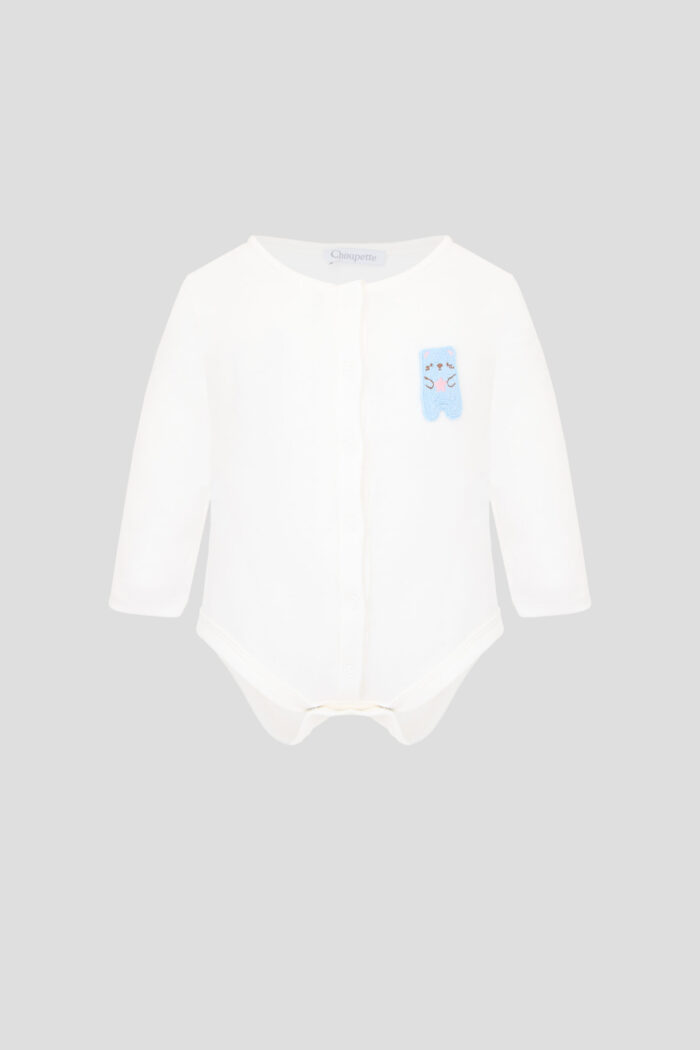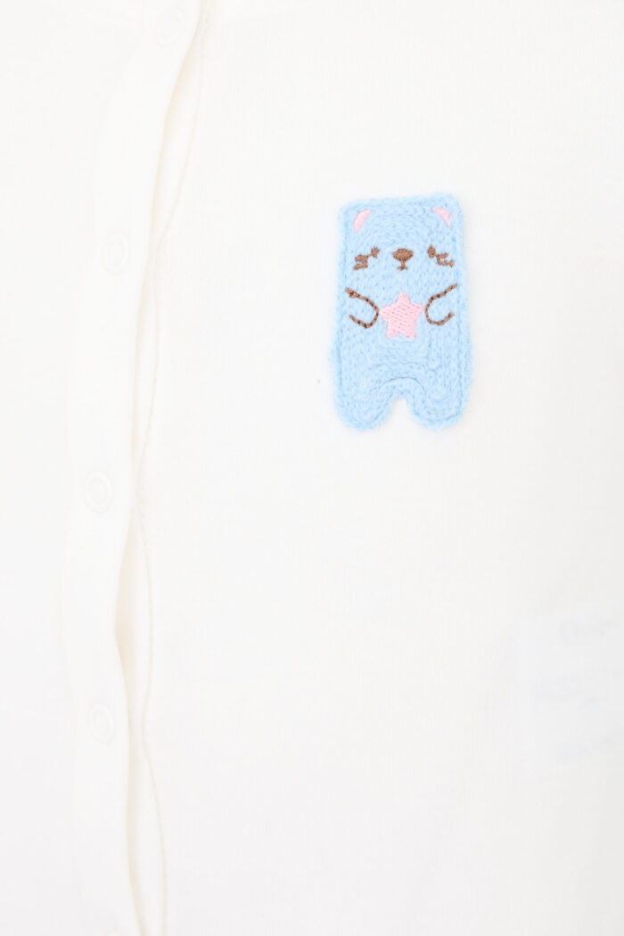 Bodysuit with decor for a boy is made of 100% cotton in the current shade of ecru. The model has a fitted silhouette and rounded neckline. Convenient button fastening along the entire length of the item allows you to easily change your baby’s clothes. Decorated with a cute teddy bear patch. The bodysuit is a basic and comfortable element of a child’s wardrobe.