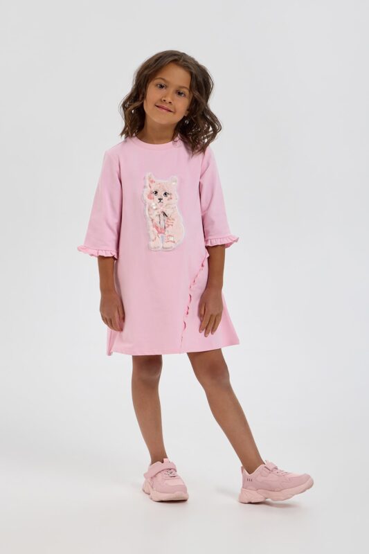 Charming dress is made of chiffon with fashionable floral print. Sleeves and hem edge are decorated with flirty ruffles that emphasize the airiness of the design. A neat lace collar of white color draws attention to the face. The model has a lining of natural cotton, which gives the product maximum comfort. The dress fastens at the back with a small button in the form of a heart.