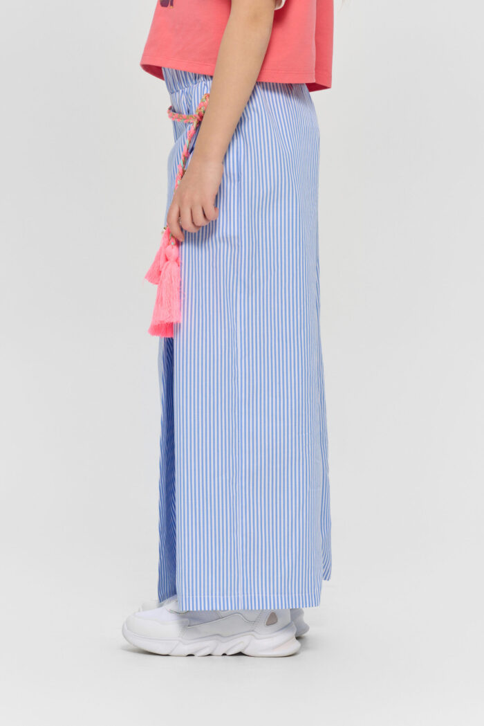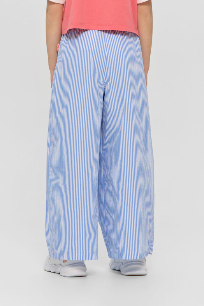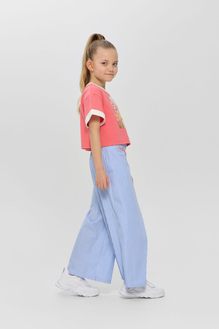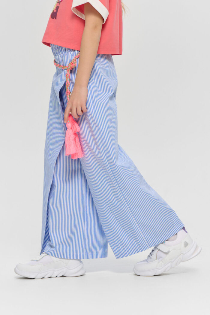 The blue striped culottes pants for girls is a stylish and comfortable element of a child’s wardrobe. They are made of lightweight and breathable material, which makes them ideal for warm summer weather. The elasticated elastic band on the waistband ensures a comfortable fit. The original design and decorative elements look modern and fashionable. Culottes pants will be a great addition to your child’s summer wardrobe, emphasise his style and individuality.