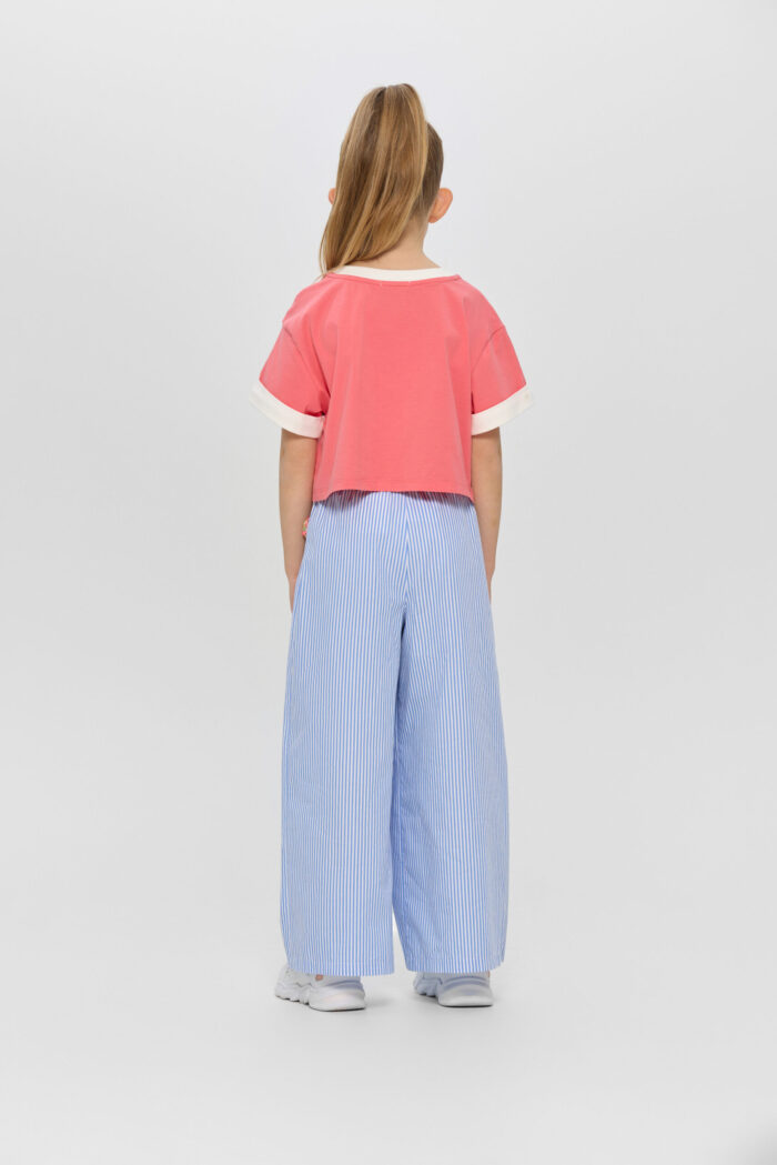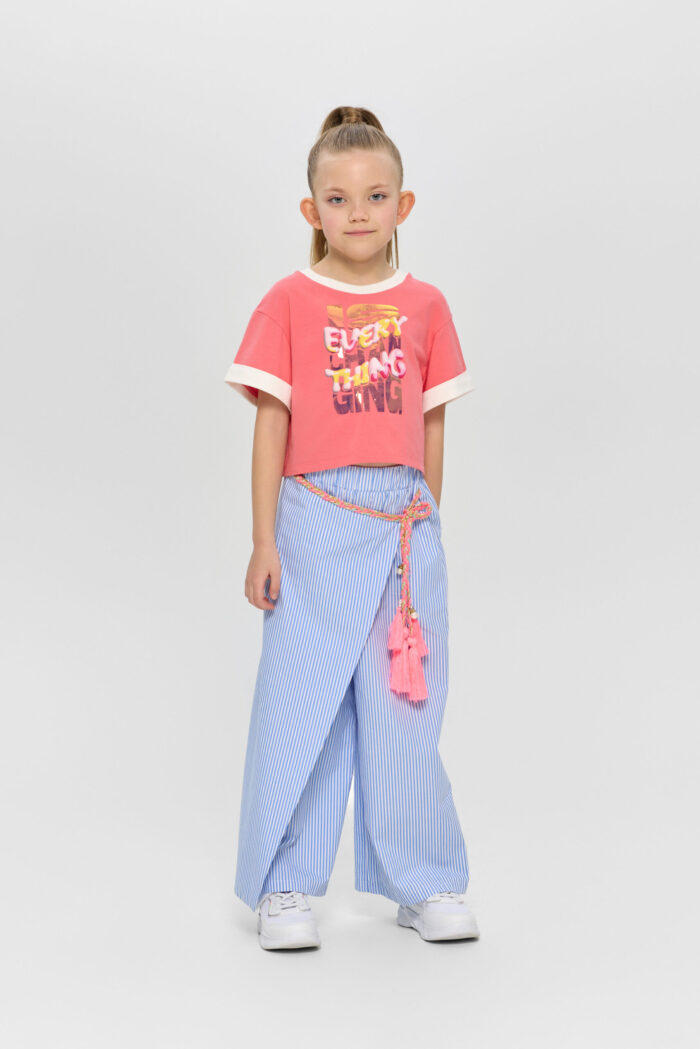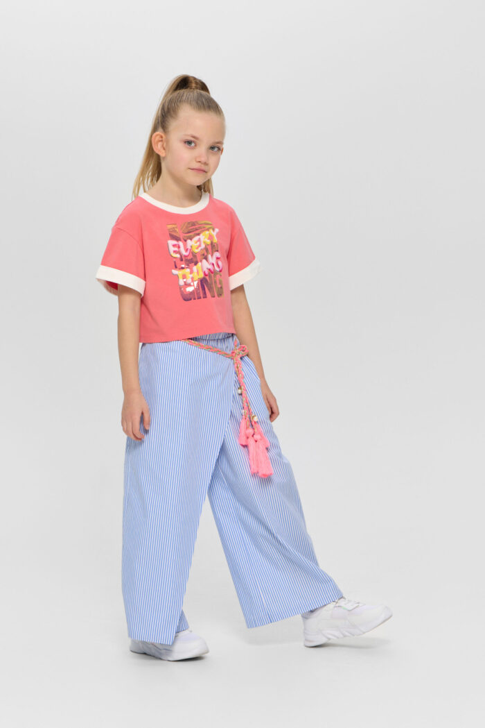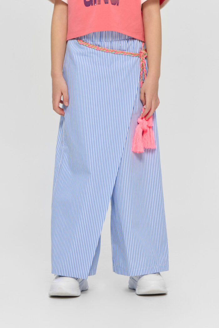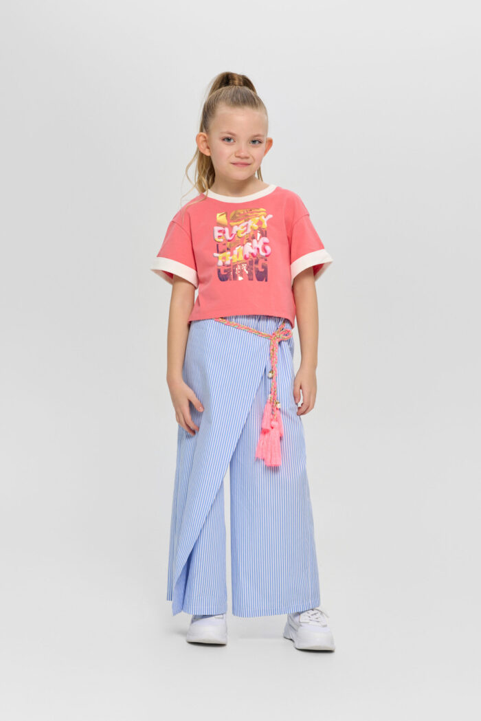 The blue striped culottes pants for girls is a stylish and comfortable element of a child’s wardrobe. They are made of lightweight and breathable material, which makes them ideal for warm summer weather. The elasticated elastic band on the waistband ensures a comfortable fit. The original design and decorative elements look modern and fashionable. Culottes pants will be a great addition to your child’s summer wardrobe, emphasise his style and individuality.