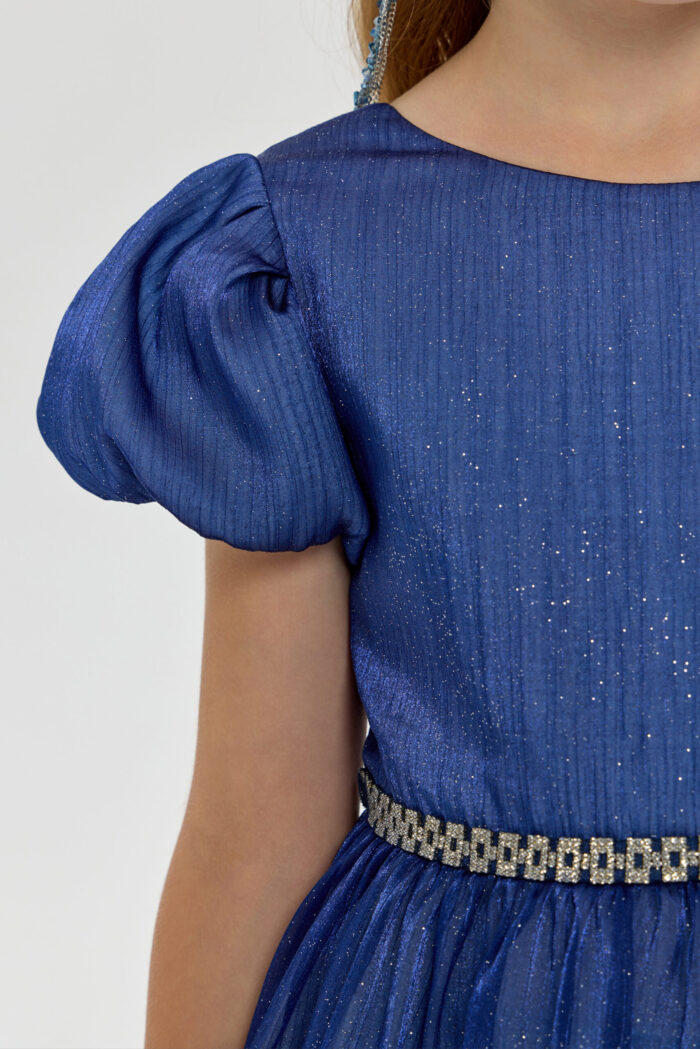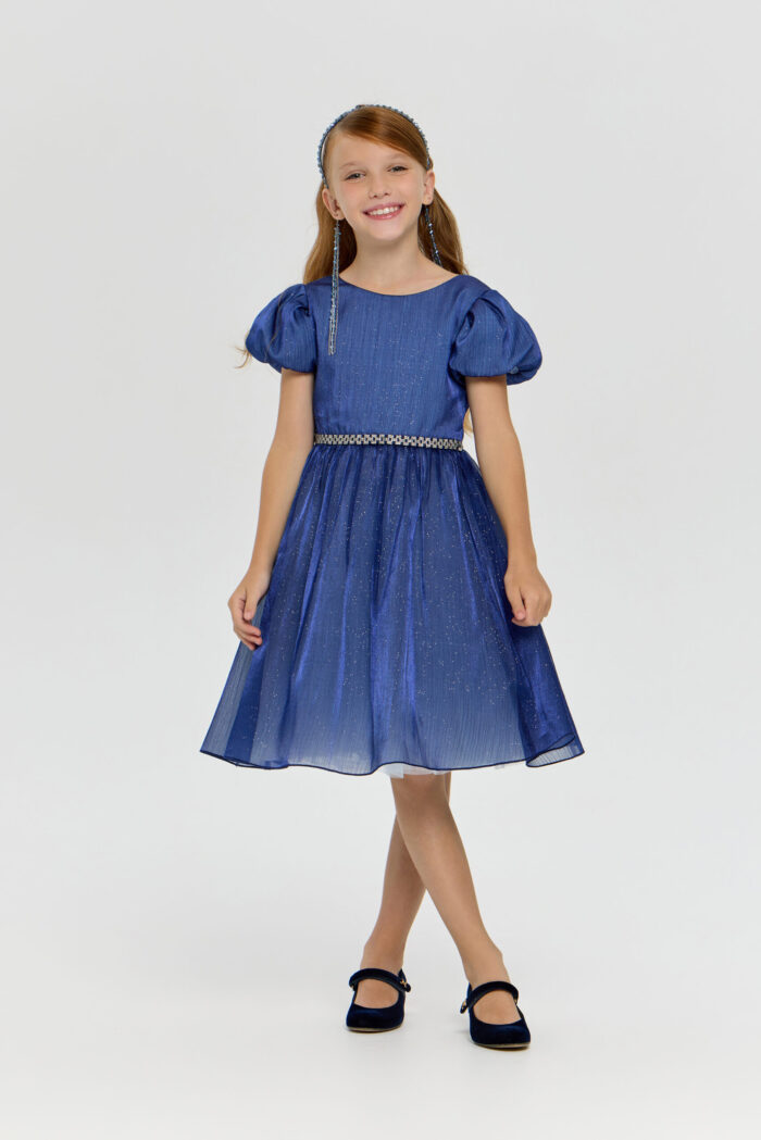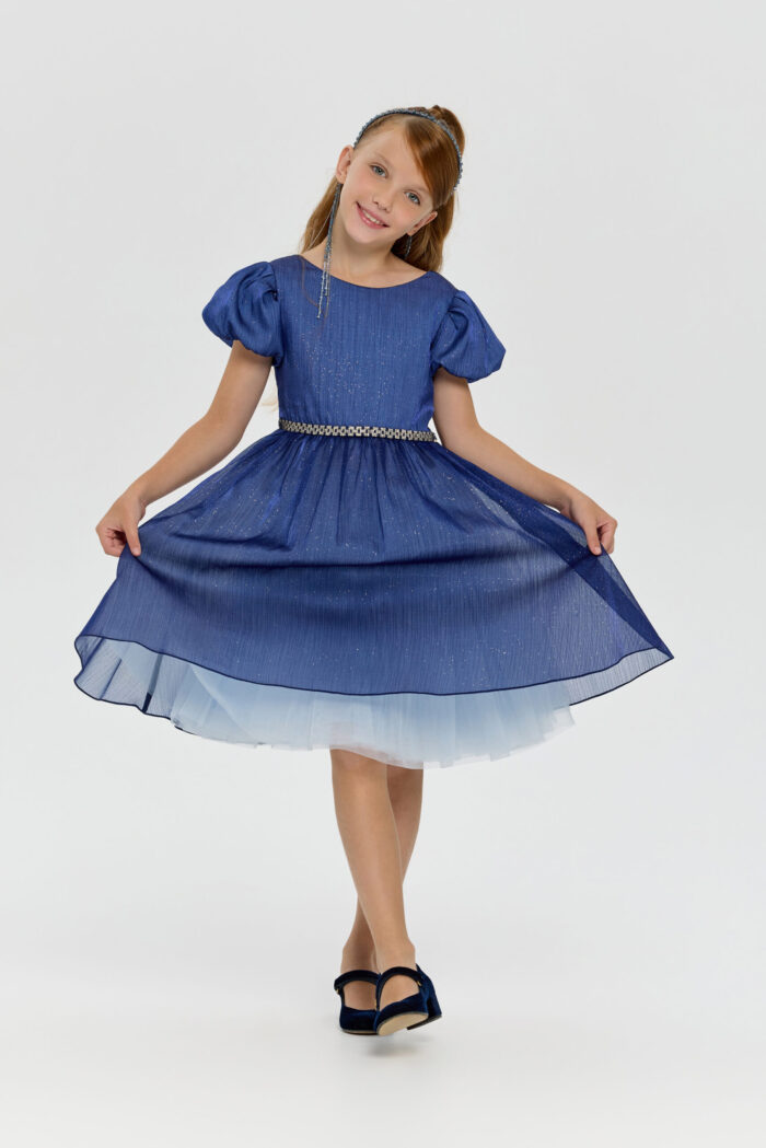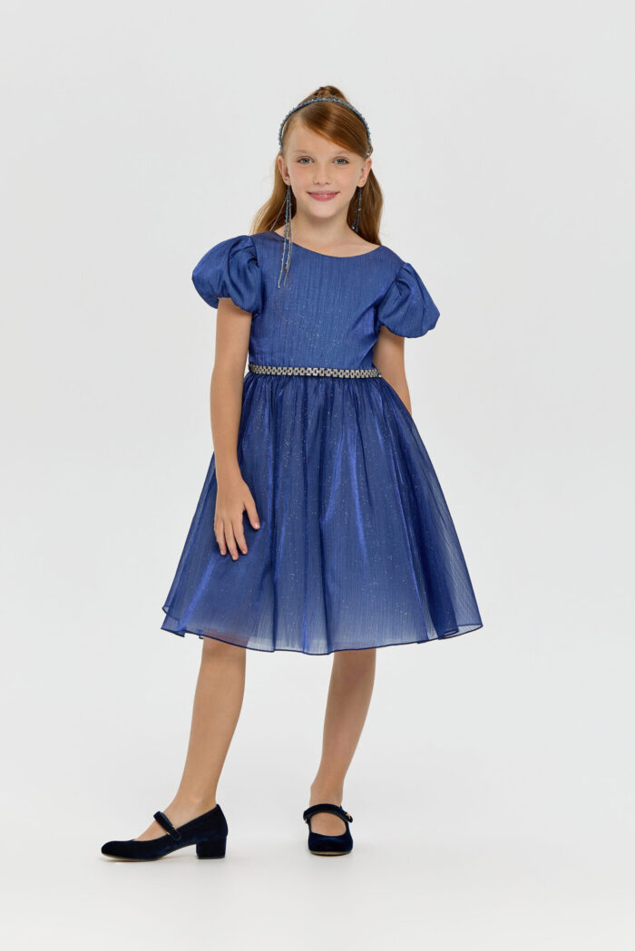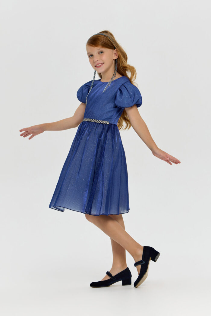 This elegant blue dress for girls will be a wonderful addition to any important event or celebration. Its fit creates a feeling of lightness and grace, allowing your daughter to feel like a fairy-tale heroine. Short puff sleeves add unique charm and give the outfit a special look. The voluminous skirt creates an effect of airiness and magic. An elegant belt decorated with rhinestones perfectly complements the look, emphasising the waist. However, the most mesmerising element of this dress is the sparkling sequins on the fabric. They add sparkle and shimmer, creating a festive mood.