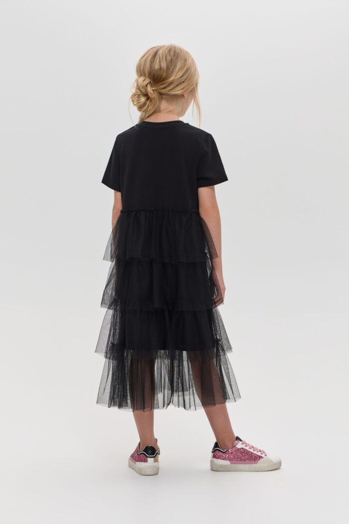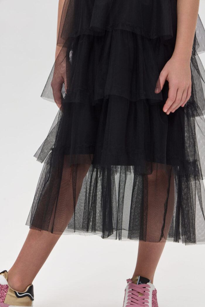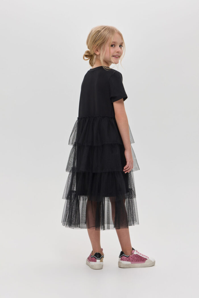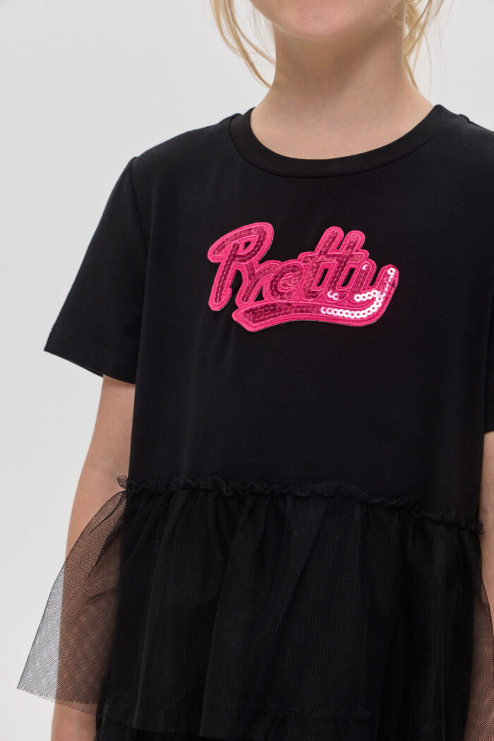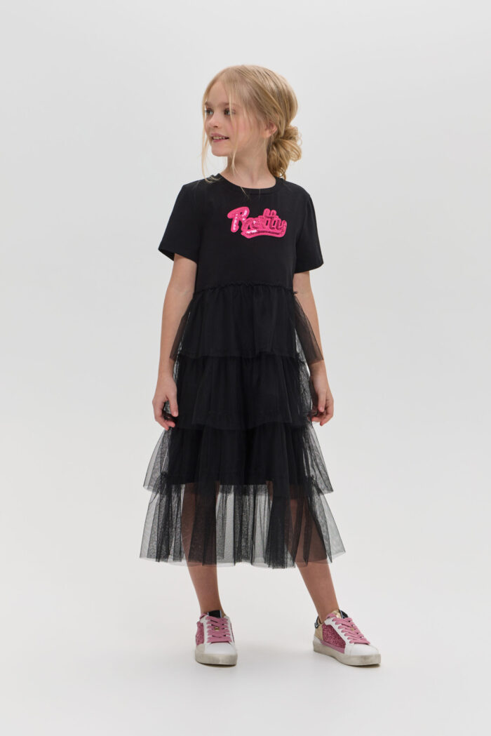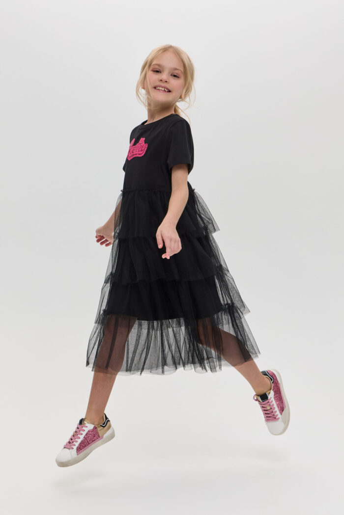 Dress with ruffles for a girl – a model that is ideal for both everyday events and special occasions. The dress has a loose cut, with an exaggerated waistline, creating an effect of lightness. The top of the piece is decorated with a colourful letter print. The skirt is a graceful cascade consisting of numerous tiers.