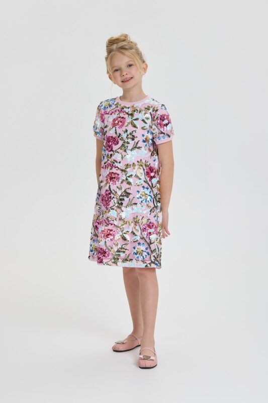 Charming pink dress is a dream for any girl! The dress is decorated with voluminous flowers, which are evenly distributed throughout the item. Multilayered petals create a three-dimensional effect. Voluminous transparent lantern sleeves add romanticism and lightness to the outfit. The dress has a cotton lining that provides the child with comfort.