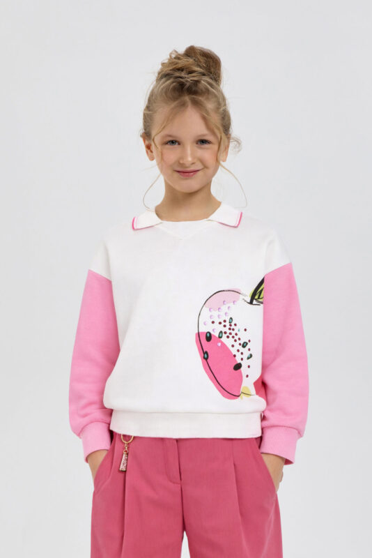 Fashionable jumper for girl is made of soft fluffy knit fabric, which provides warmth and comfort. Lurex adds shine and makes the model more festive. The dropped shoulder line gives comfort to the child’s movements. The delicate beige shade can be easily combined with various wardrobe elements and is suitable for different events. The model is decorated with a voluminous flower that gives the jumper originality. Loose and comfortable fit allows you to easily combine the jumper with any bottom.