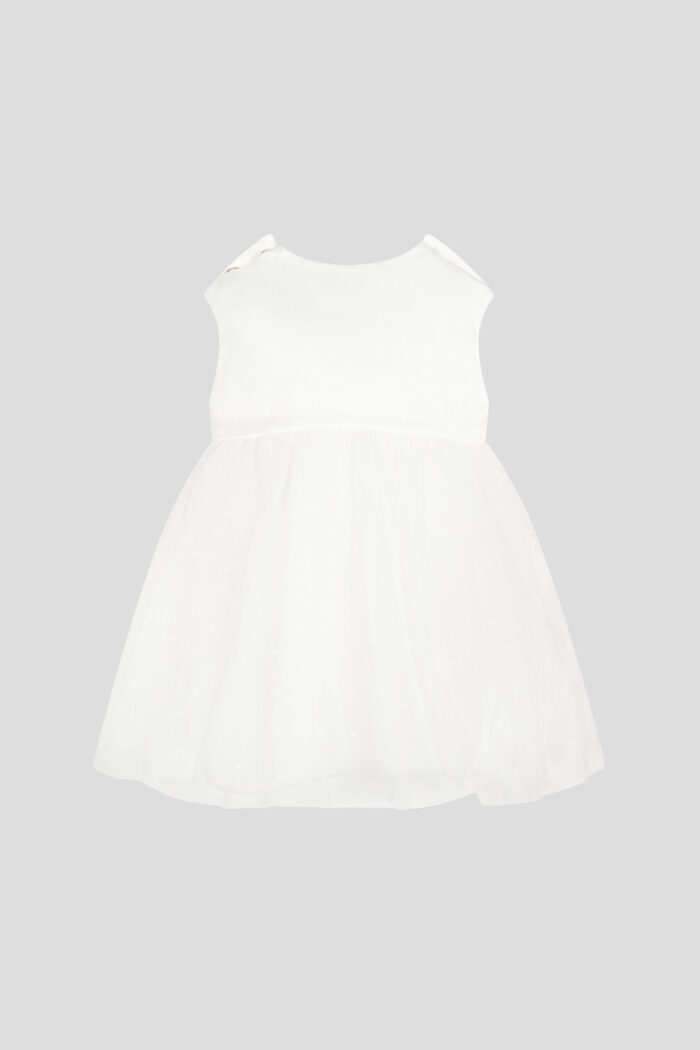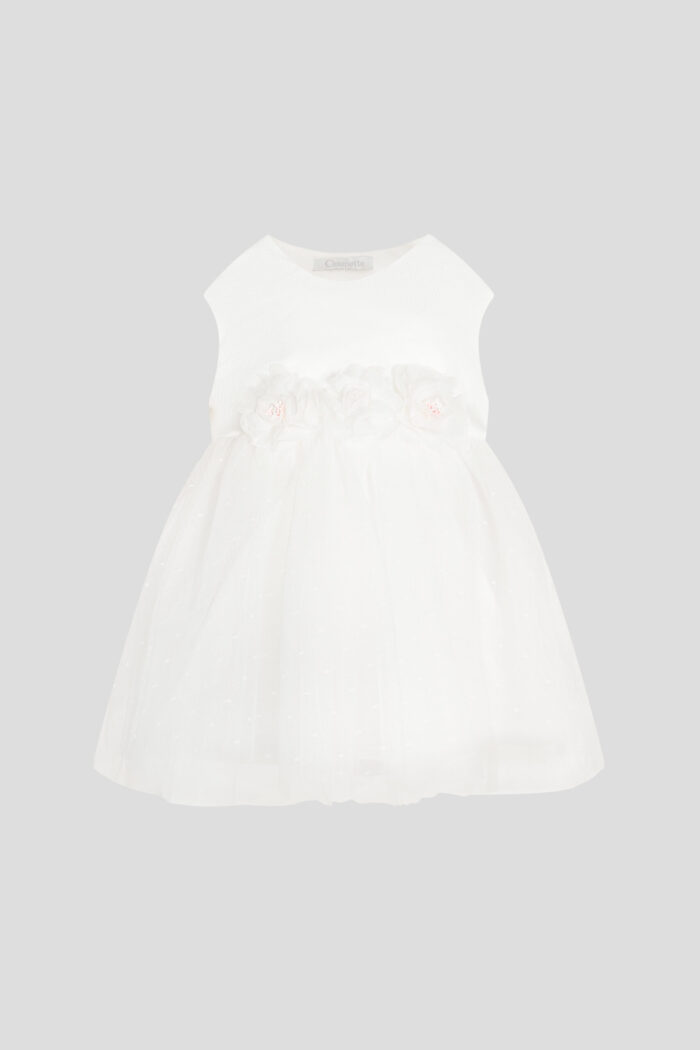 This white dress for girls will highlight the innocent charms of its little owner. The sleeveless model has a fluffy double-layered skirt. The cut-off bodice with round neckline is embellished with floral applications to match the product. There is a belt with a bow around the waist. The double button fastenings on the shoulders make it easy to change clothes.