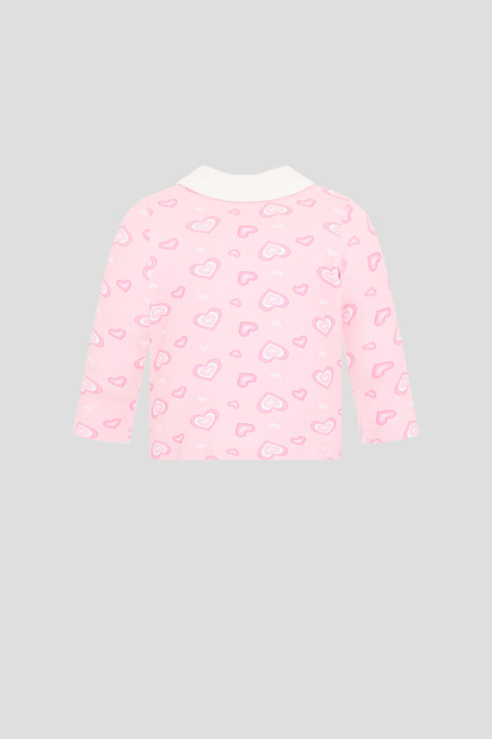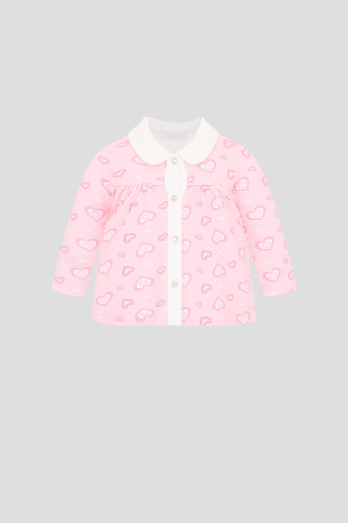Long sleeve t-shirt for a little girl is made of natural breathable cotton. The model is loose fit. The button fastening is located on a white placket that runs the entire length. The soft collar creates additional comfort. This long sleeve t-shirt will be a great addition to a girl’s wardrobe.