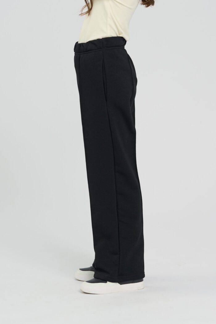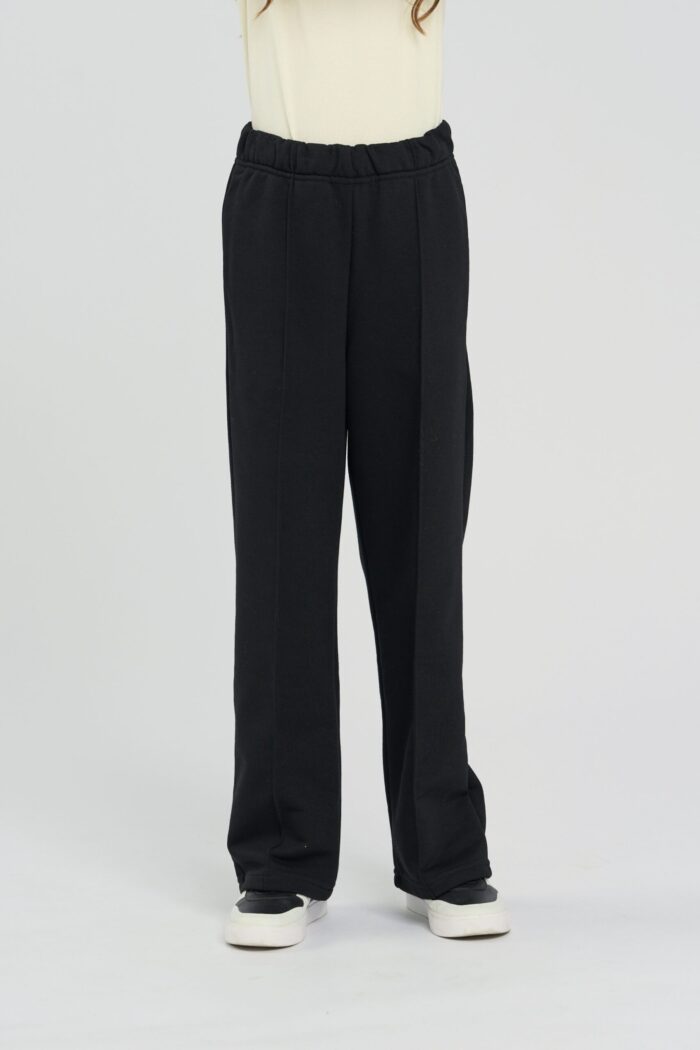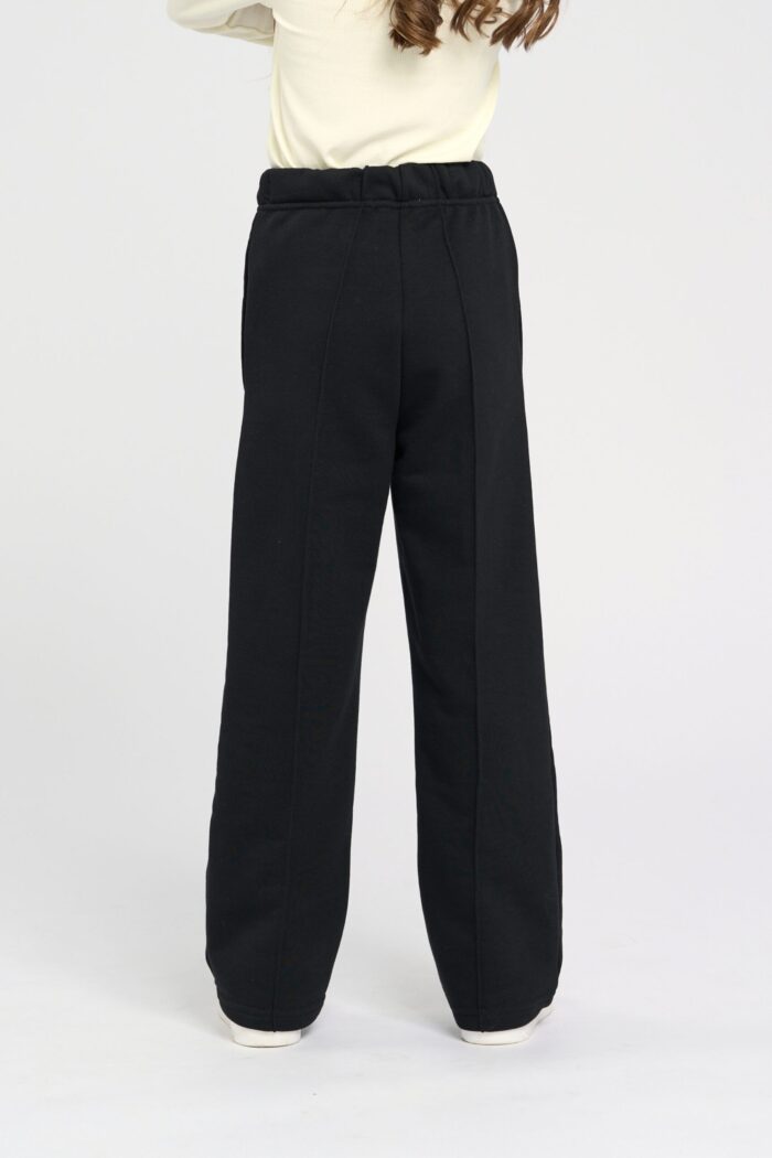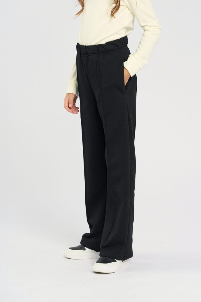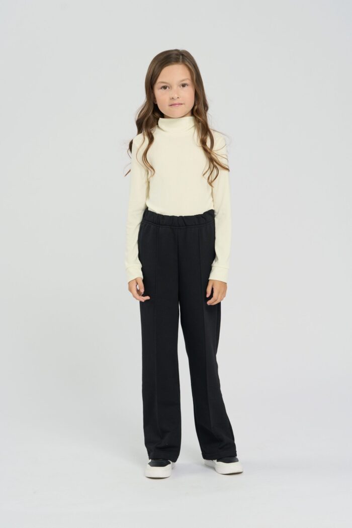 Black futer knitted pants are an ideal base for children’s closet. The model will make a harmonious set with any clothes. The Pants with arrows visually narrow the silhouette, give grace. Straight cut does not restrain movement, which is important for an active child. The elastic waistband guarantees a comfortable fit. There are pockets on the sides.