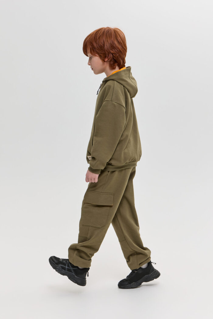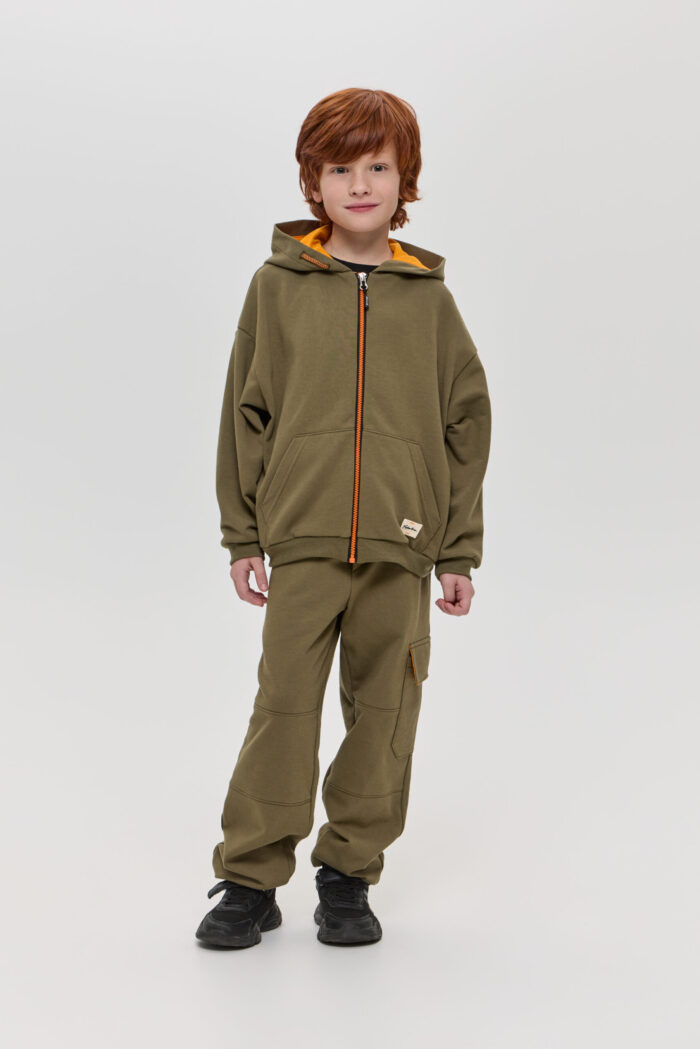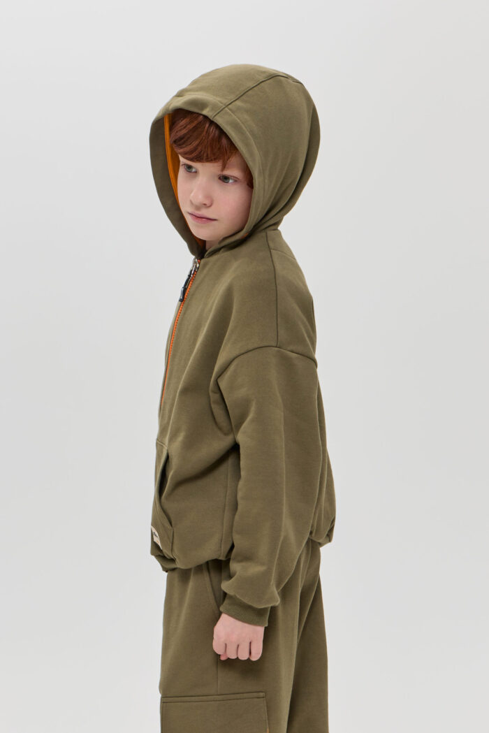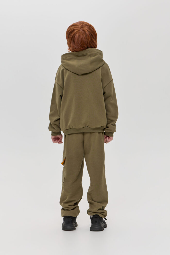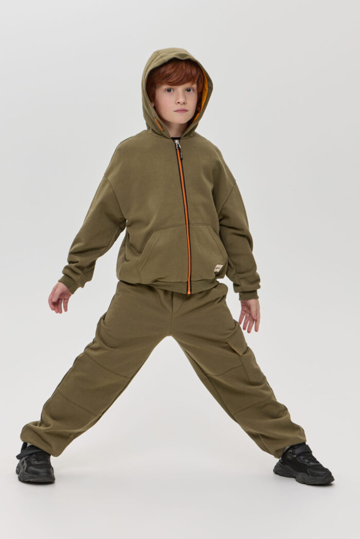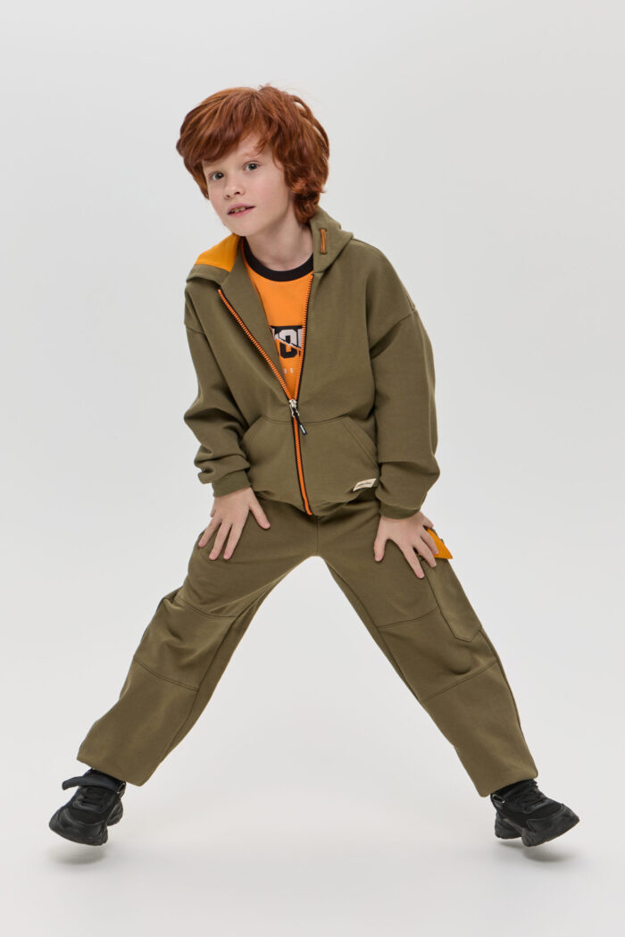 The boy’s knitted tracksuit in khaki colour is the perfect choice for active kids. The sweatshirt with zip fastening has a comfortable loose fit. The hood adds extra protection from wind and cold, allowing the child to feel comfortable on the street. The pants has an elasticated waistband for a comfortable fit. The soft knitted material provides freedom of movement, which is important for play and outdoor activities. Khaki is a universal colour that can be easily combined with different shoes and accessories.