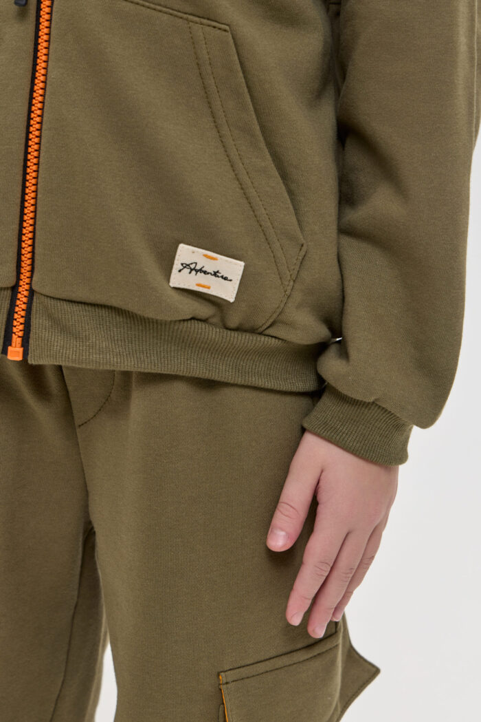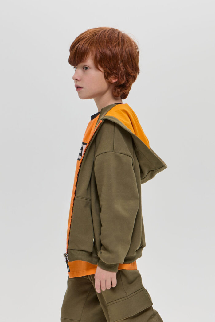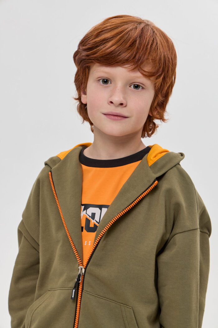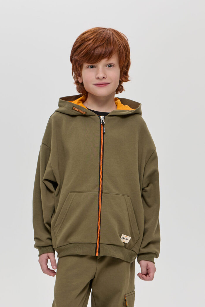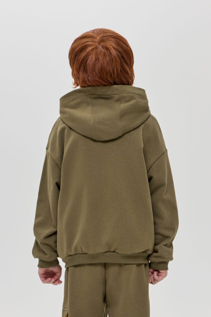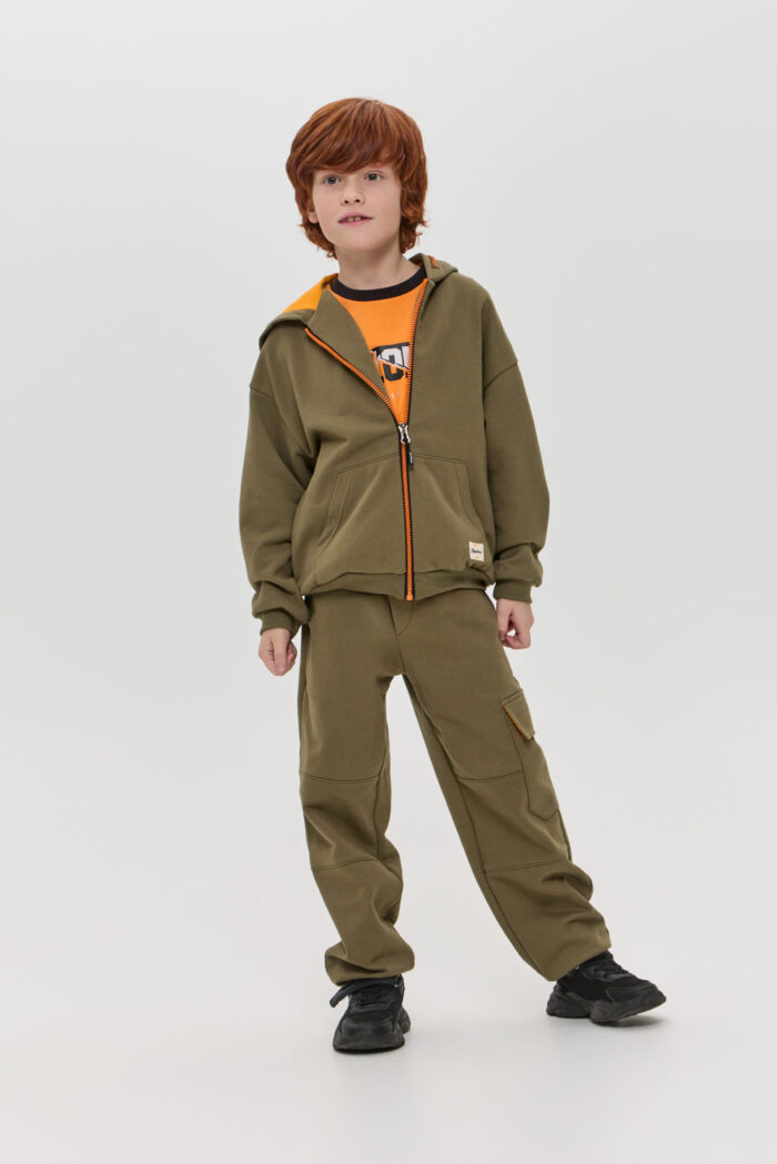 The boy’s knitted tracksuit in khaki colour is the perfect choice for active kids. The sweatshirt with zip fastening has a comfortable loose fit. The hood adds extra protection from wind and cold, allowing the child to feel comfortable on the street. The pants has an elasticated waistband for a comfortable fit. The soft knitted material provides freedom of movement, which is important for play and outdoor activities. Khaki is a universal colour that can be easily combined with different shoes and accessories.