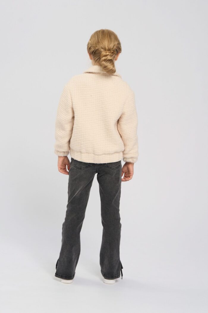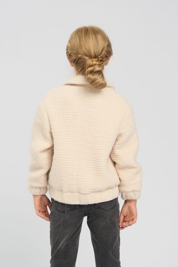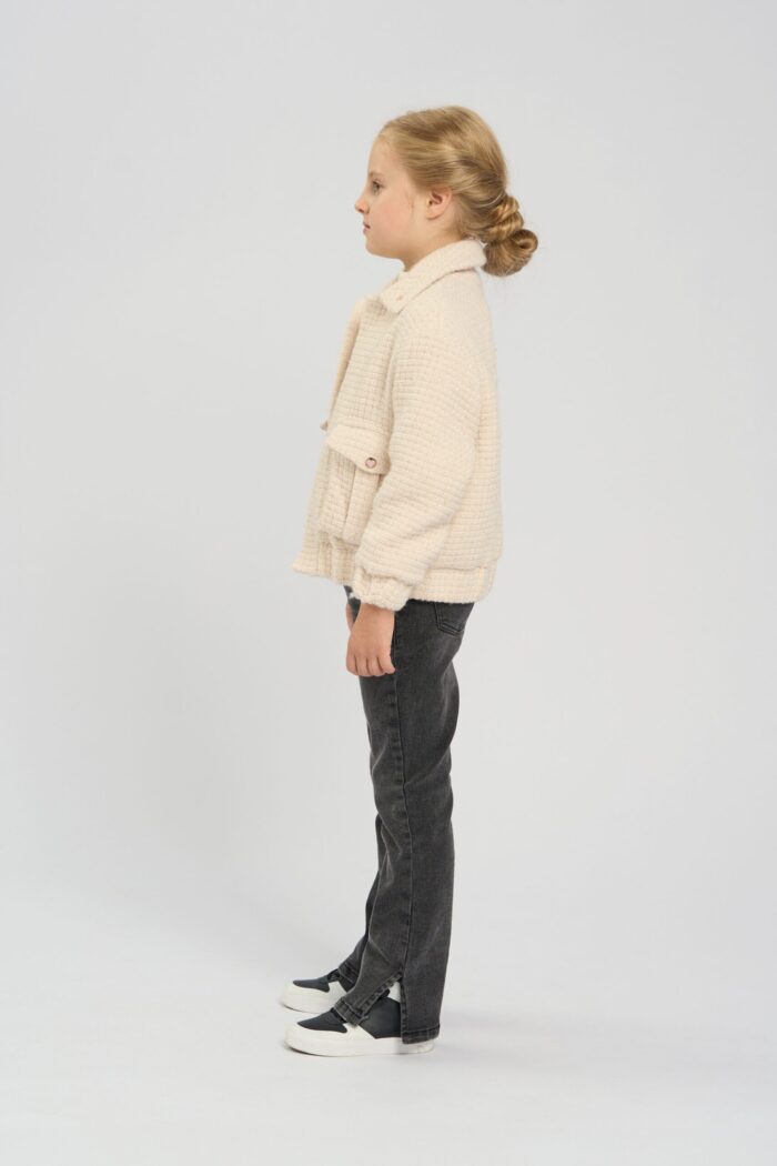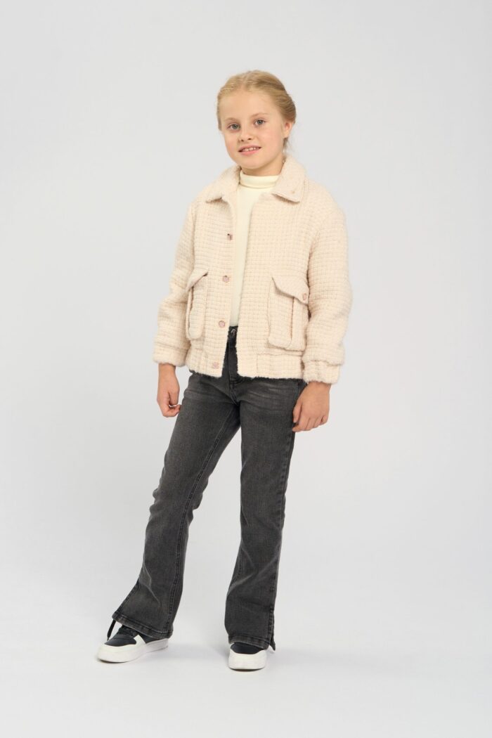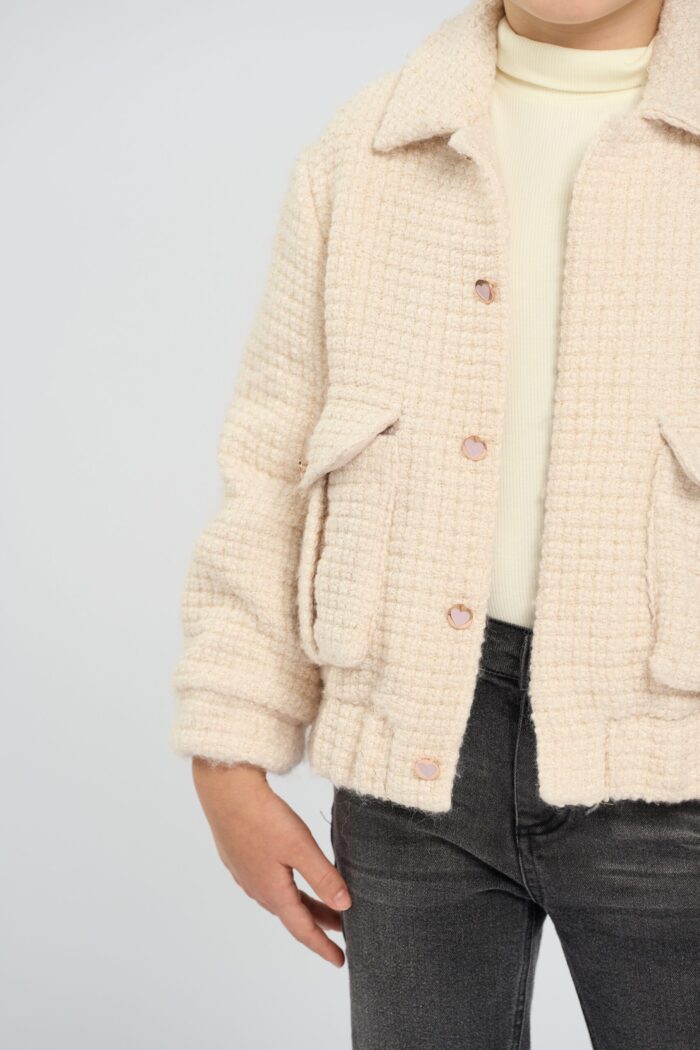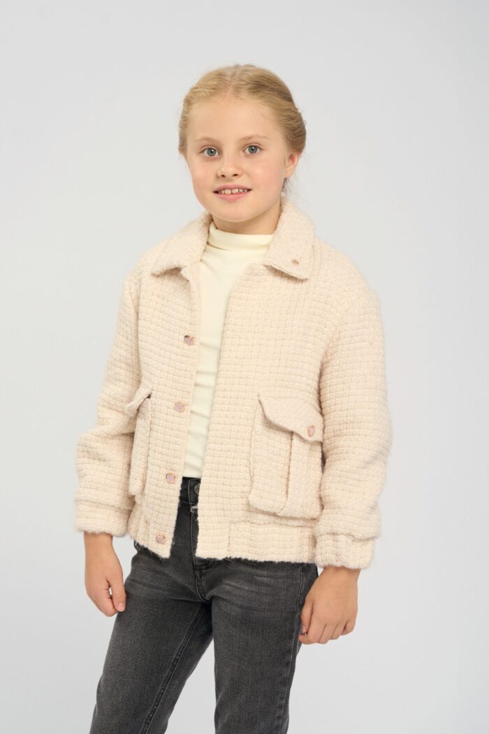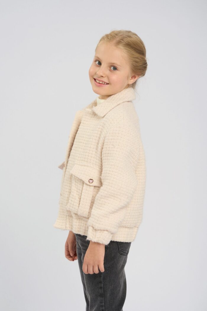 Jacket for a girl in an elegant beige shade. It has a comfortable straight silhouette. The elasticated waistband ensures a comfortable fit. Straight sleeves of standard length. English collar emphasises the strictness of the design. A spectacular design detail – voluminous patch pockets in the front. The model adds charm with buttons decorated with hearts. It has a cotton lining.