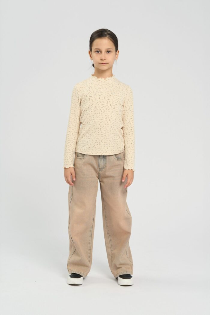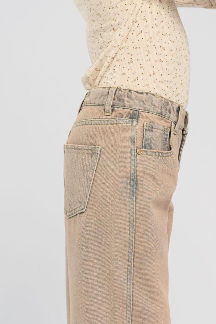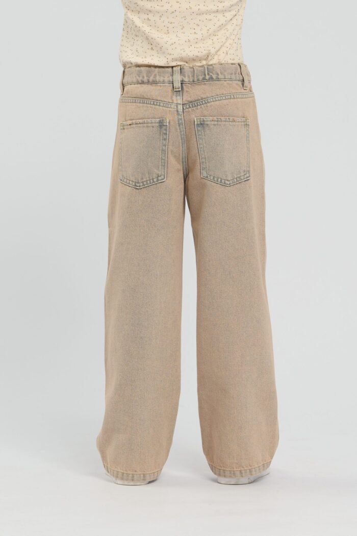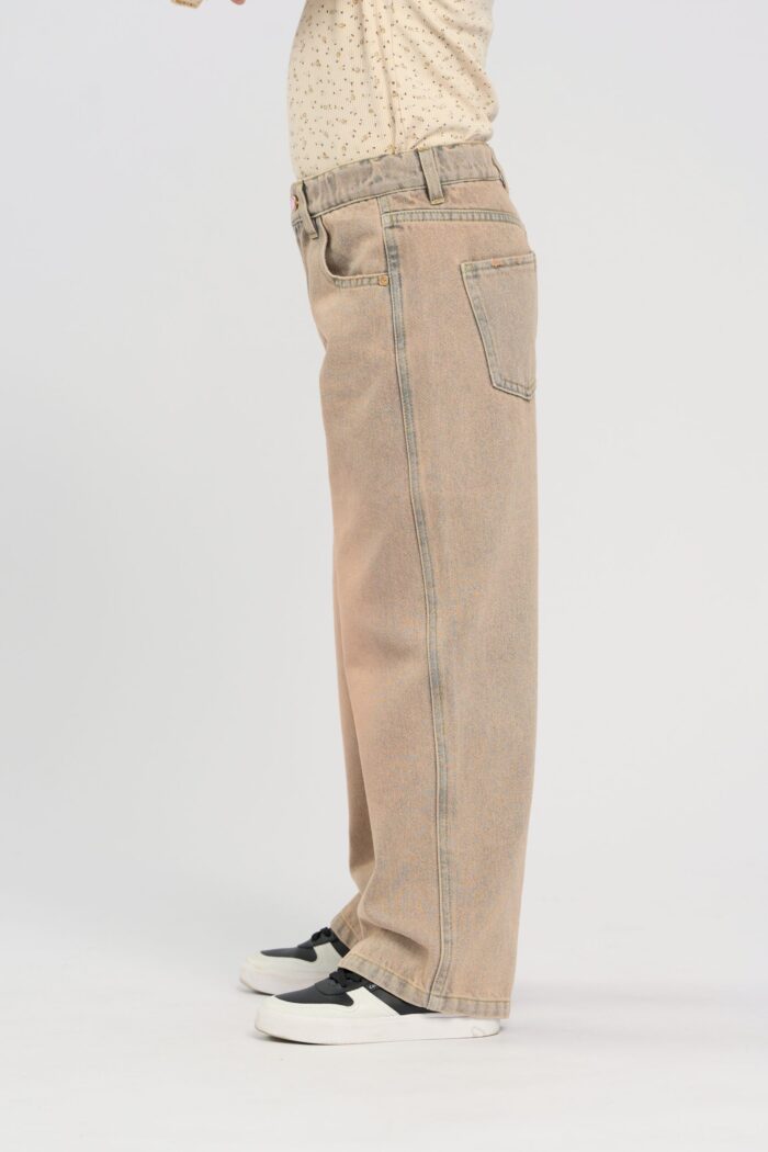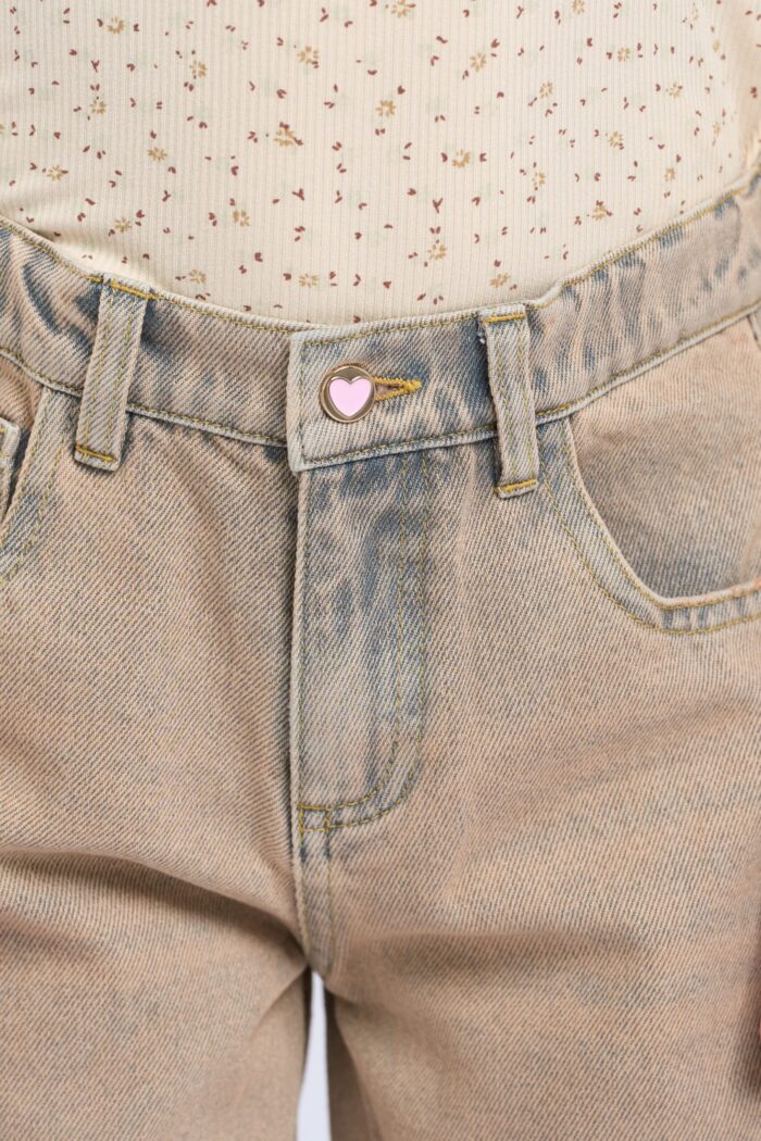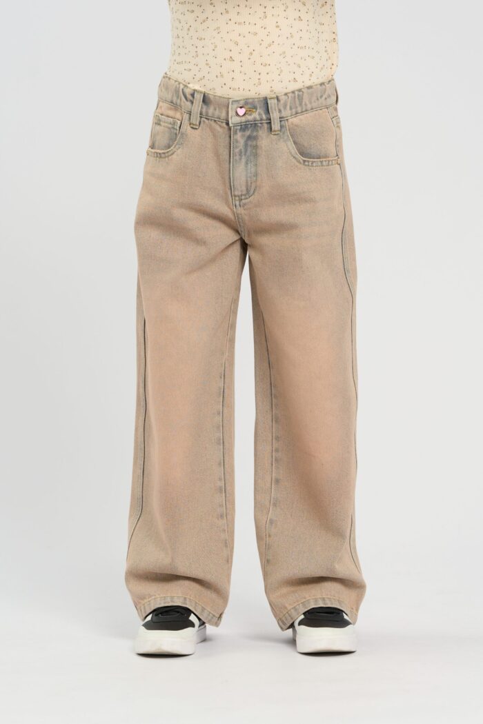 Fashionable and comfortable jeans for a girl in dark sandy colour. The pants feature pockets and an elegant heart-shaped fastening.