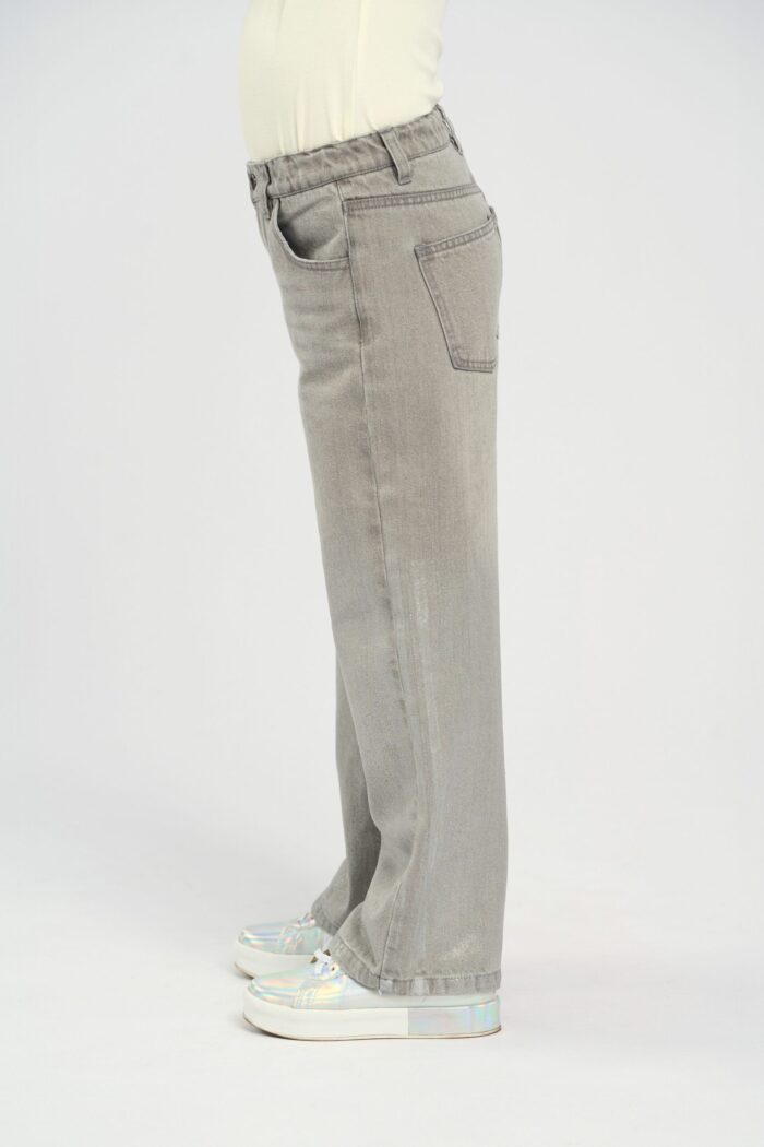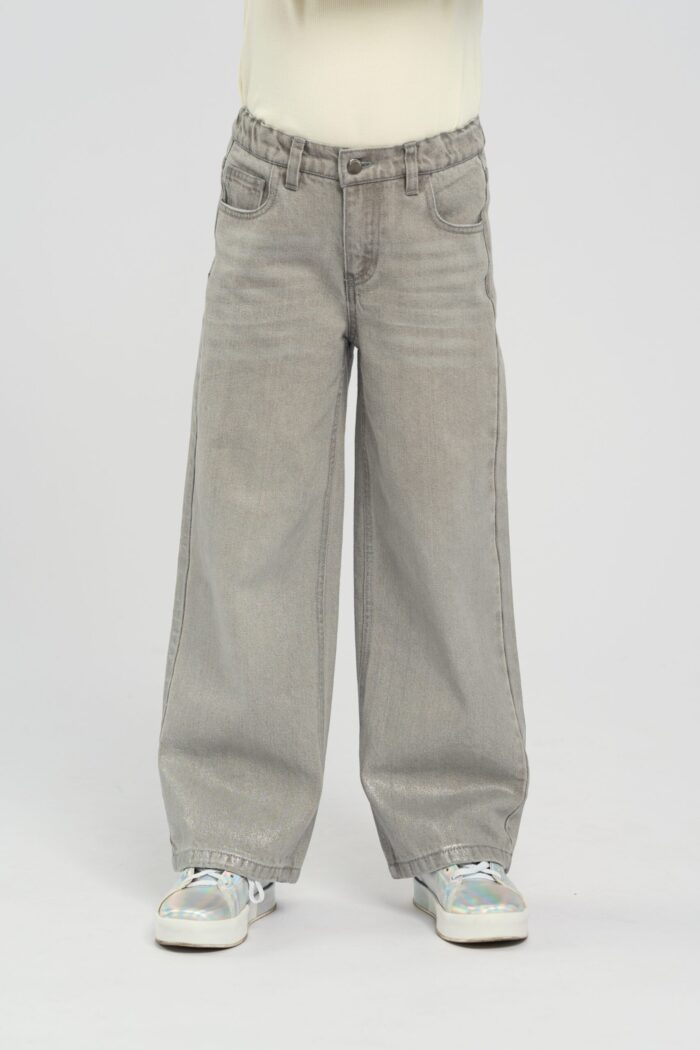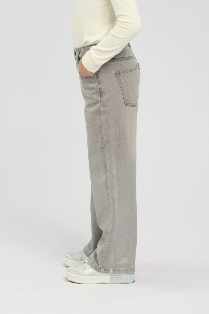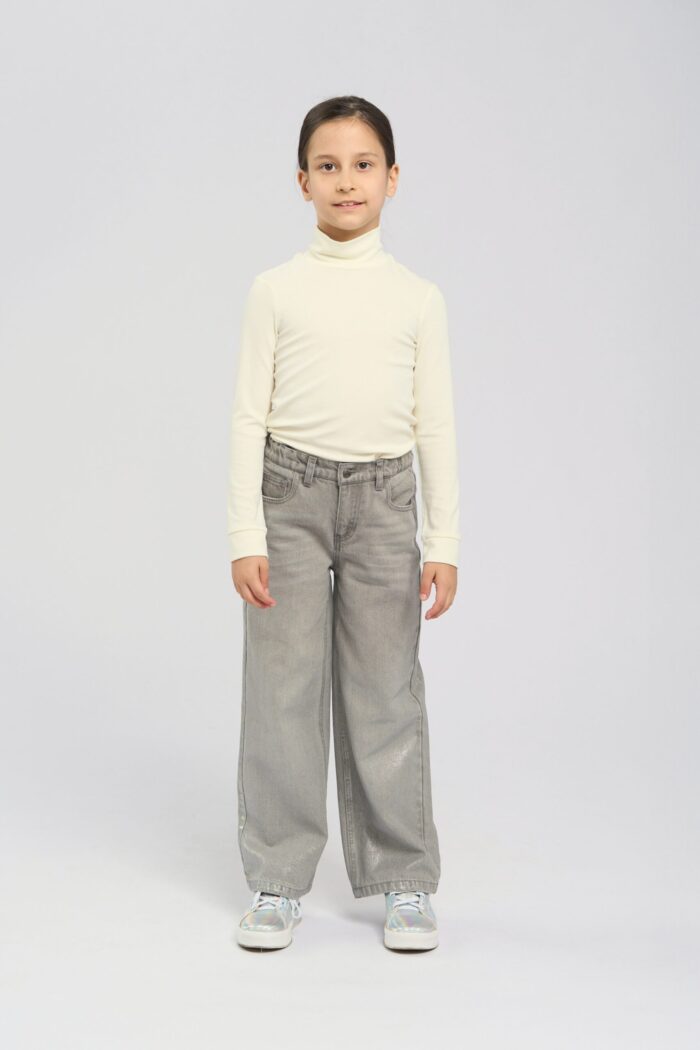 Silver fabric girl’s jeans with a loose silhouette create a bold and fashionable look. The metallic shine of the silver fabric gives the jeans a futuristic and stylish look. The loose fit ensures comfort and freedom of movement, adding a relaxed feel to the look. The zip fastening makes the jeans comfortable to wear. The side pockets add practicality. The jeans are perfect with both simple T-shirts and more dressy tops.
