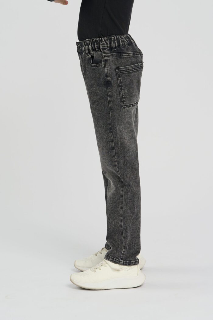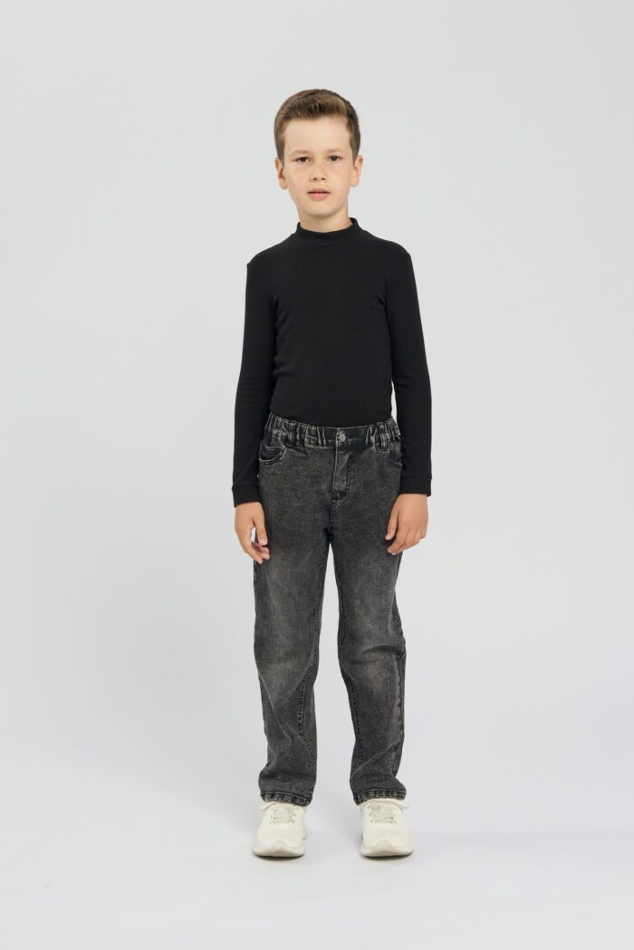 Fashionable jeans for boy are presented in black color, which makes them a stylish and versatile element of the closet. The straight silhouette is suitable for different types of figures. Decorative scuffs add a fashionable accent, create a light effect. Fashionable accent, create the effect of slight carelessness and individuality. These details make the model more interesting and attractive for young fashionistas. Jeans are equipped with classic pockets on the front and back, as well as a convenient button and zipper. They are ideal for everyday wear and can be easily combined with t-shirts, shirts and sweaters.