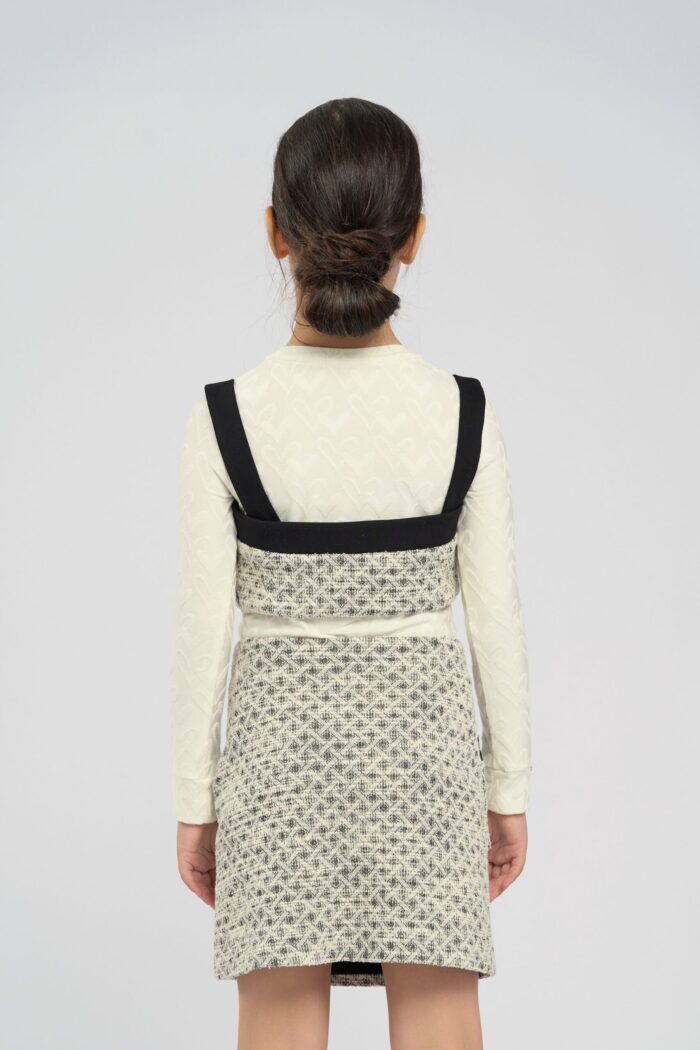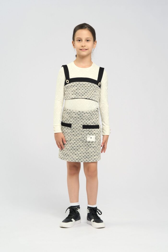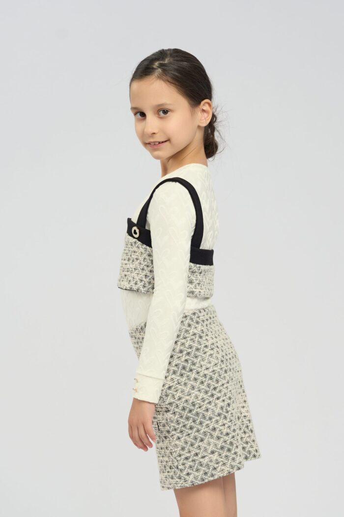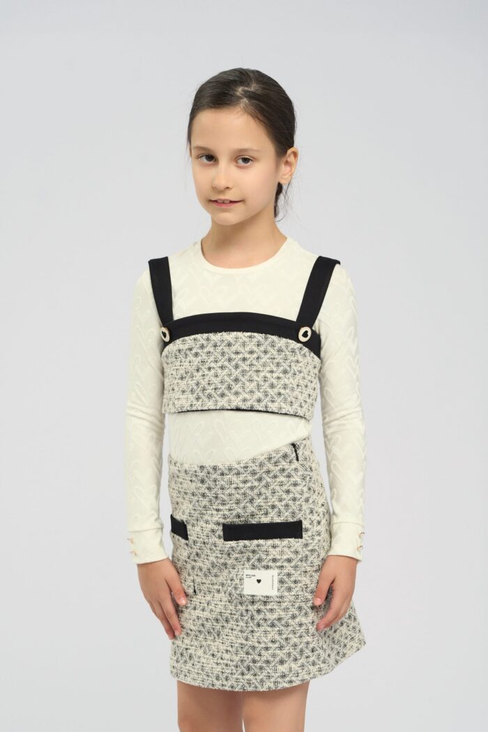 Top for a girl made of jersey knit fabric and has an elasticated texture. This material is soft and breathable, making it ideal for comfortable children’s clothing. Wide contrasting straps ensure a comfortable fit. The top follows the silhouette of the body and does not restrain movements. The contrasting black placket features two decorative heart buttons. The jersey fabric is crease resistant and perfect for children’s casual wardrobe.